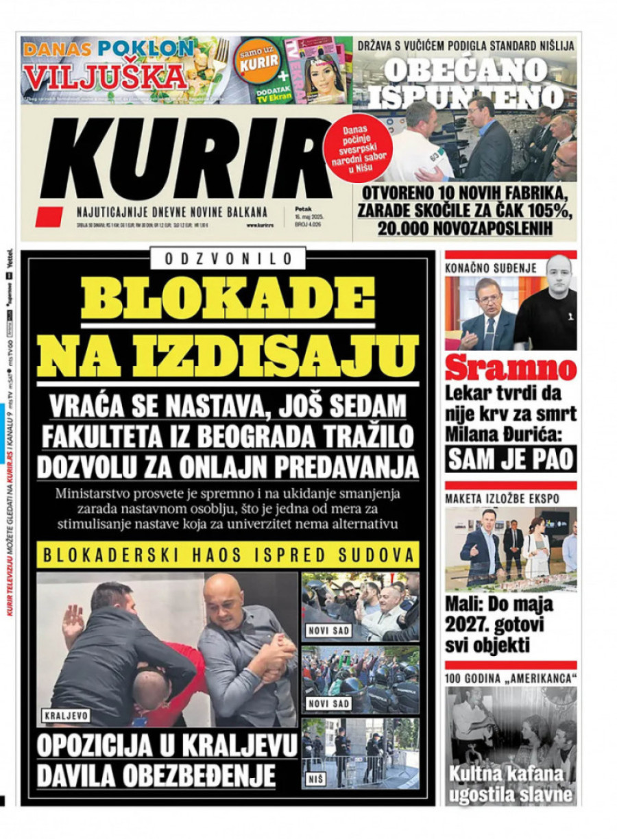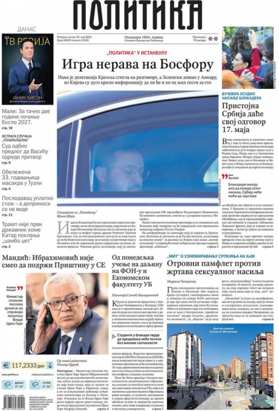 Dnevne novine u Srbiji za petak, 16. maj 2025. godine, na naslovnim stranama najavljuju brojne aktuelne društveno-političke teme.