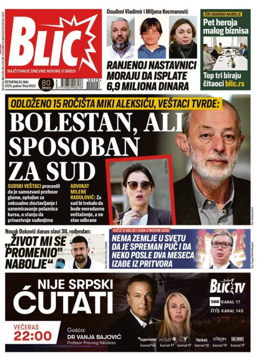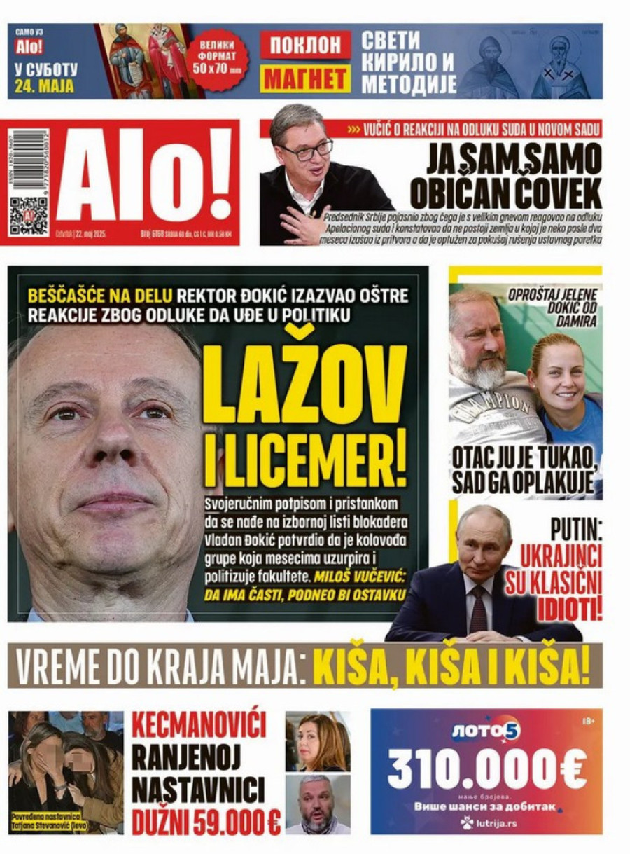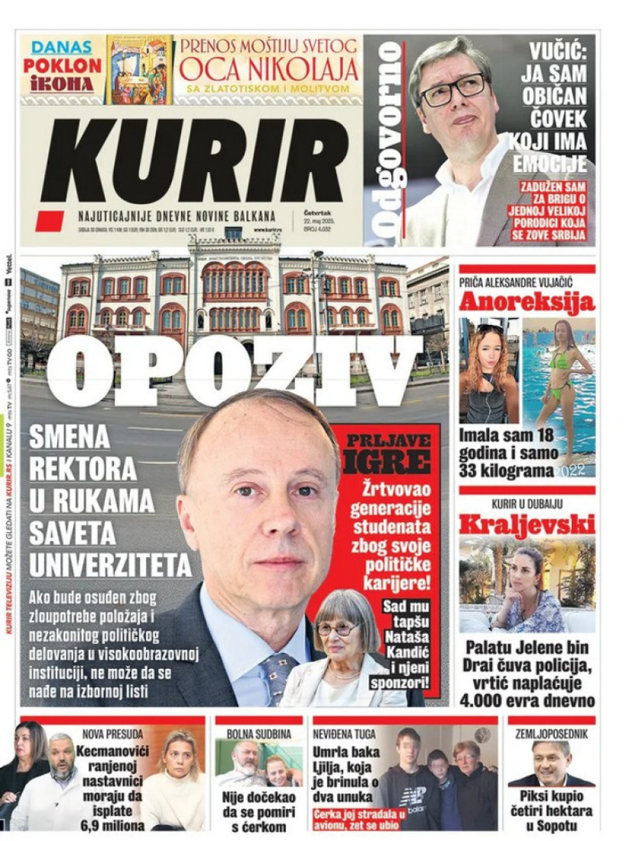 Dnevne novine u Srbiji za četvrtak 22. maj 2025. godine, na naslovnim stranama najavljuju brojne aktuelne društveno-političke teme.