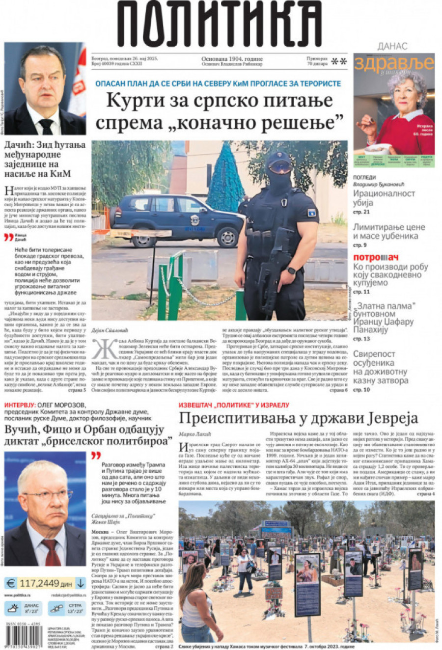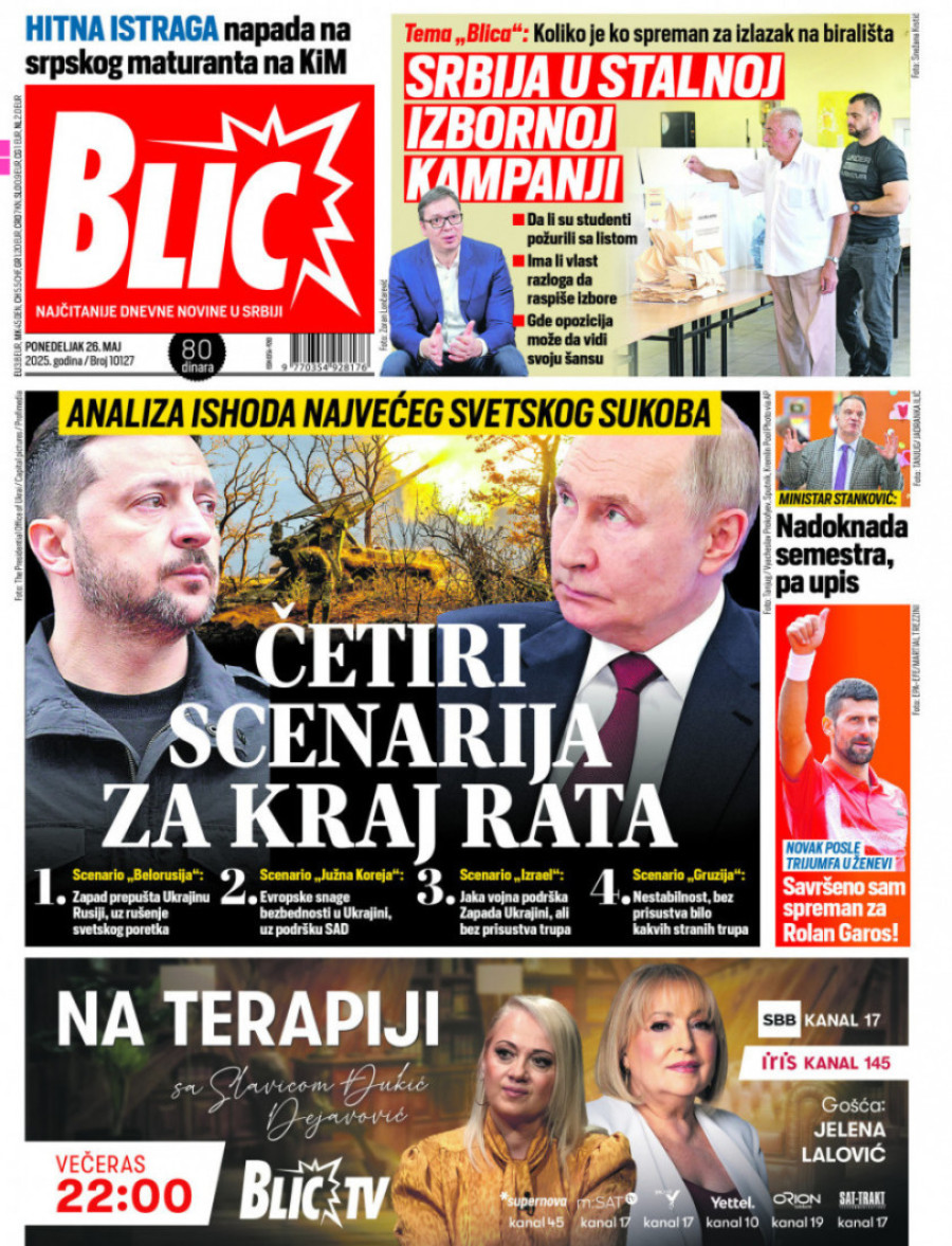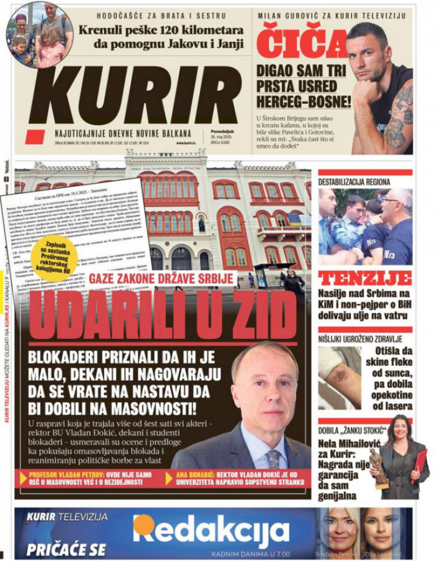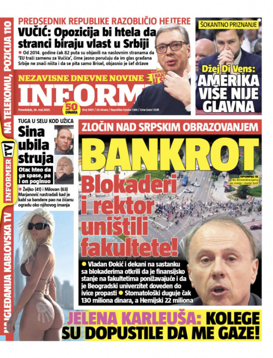 Dnevne novine u Srbiji za ponedeljak 26. maj 2025. godine, na naslovnim stranama najavljuju brojne aktuelne društveno-političke teme.