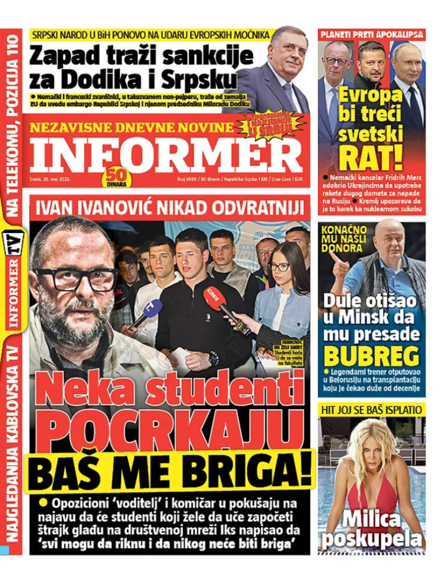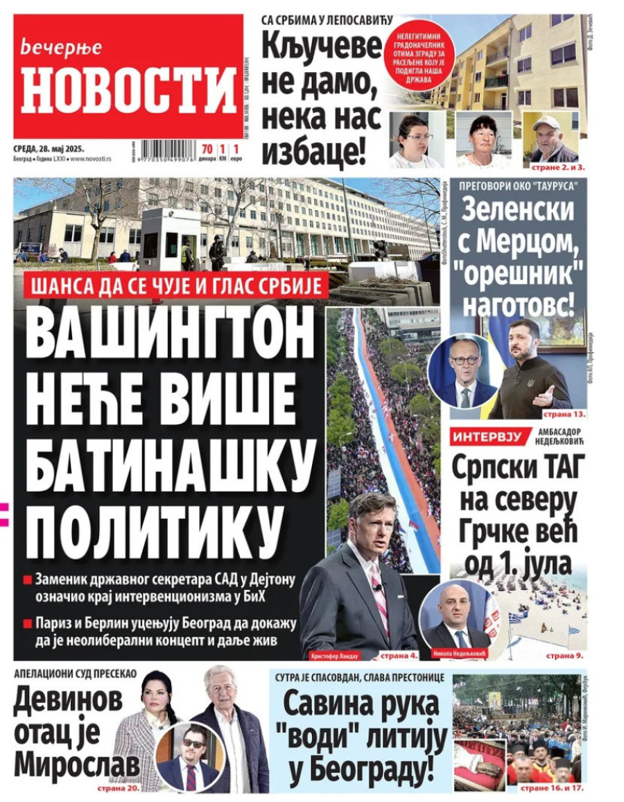 Dnevne novine u Srbiji za sredu 28. maj 2025. godine, na naslovnim stranama najavljuju brojne aktuelne društveno-političke teme.
