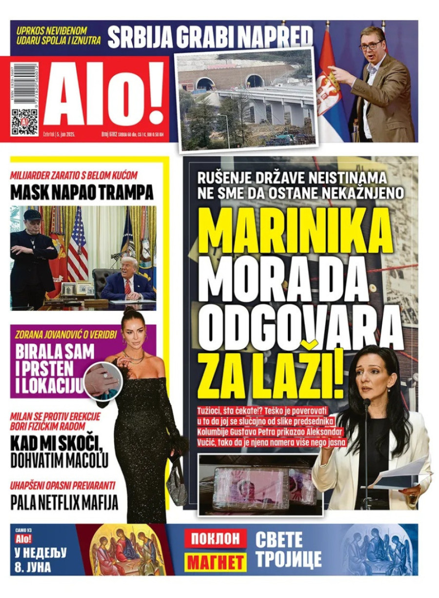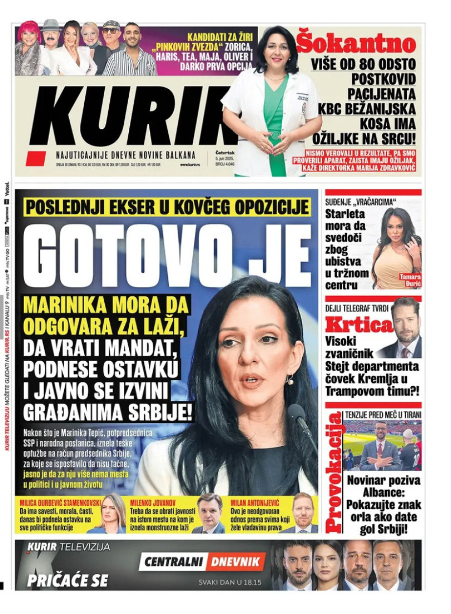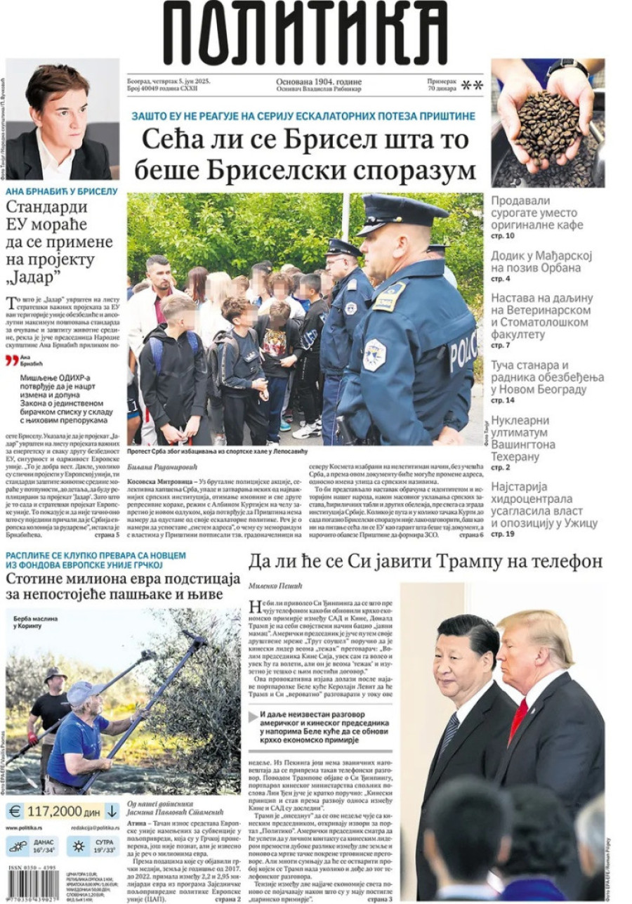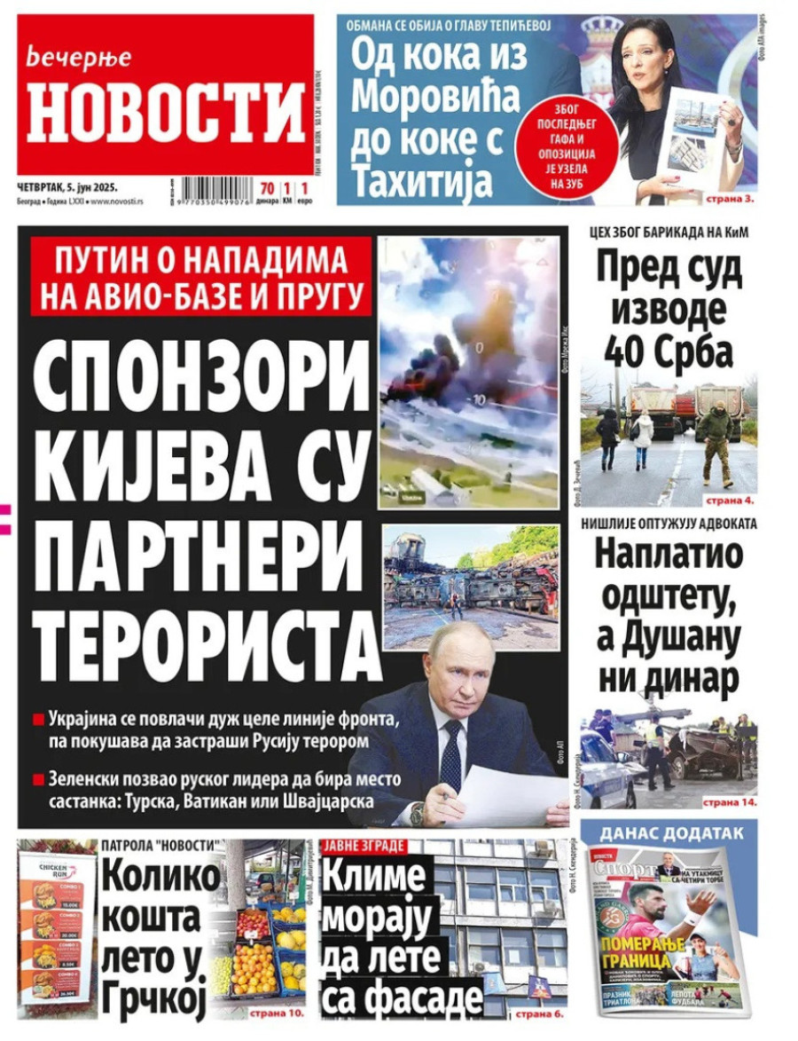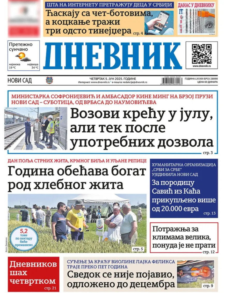 Dnevne novine u Srbiji za sredu 5. jun 2025. godine, na naslovnim stranama najavljuju brojne aktuelne društveno-političke teme.