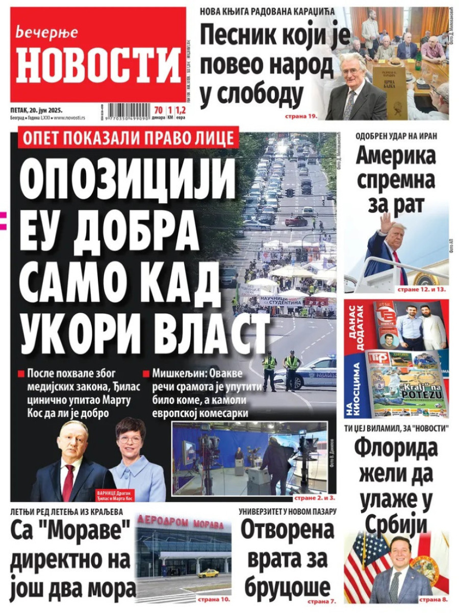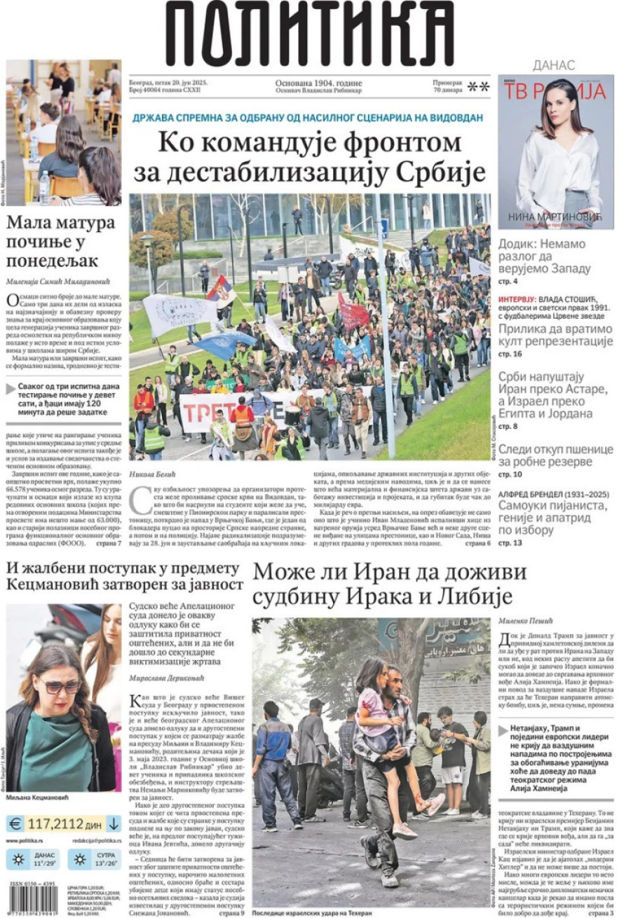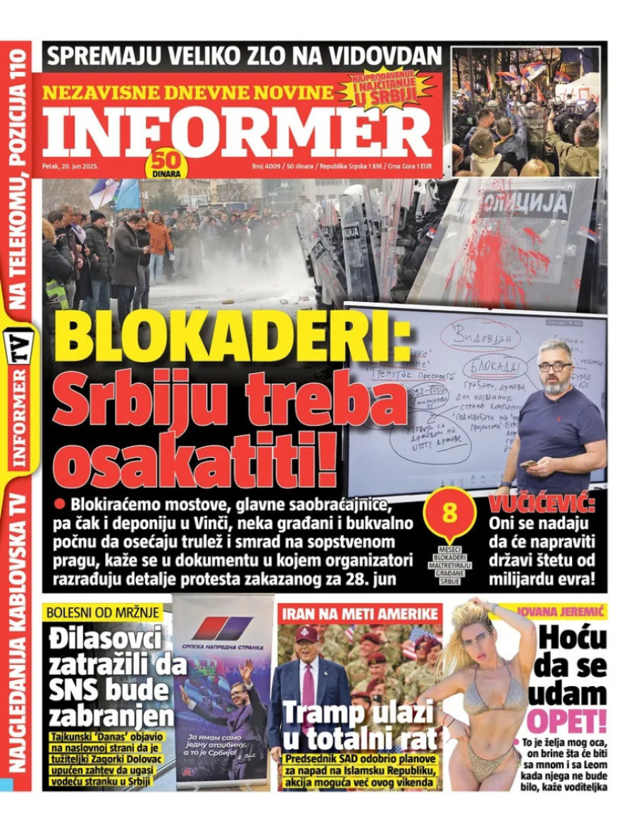 Dnevne novine u Srbiji za petak, 20. jun 2025. godine, na naslovnim stranama najavljuju brojne aktuelne društveno-političke teme.