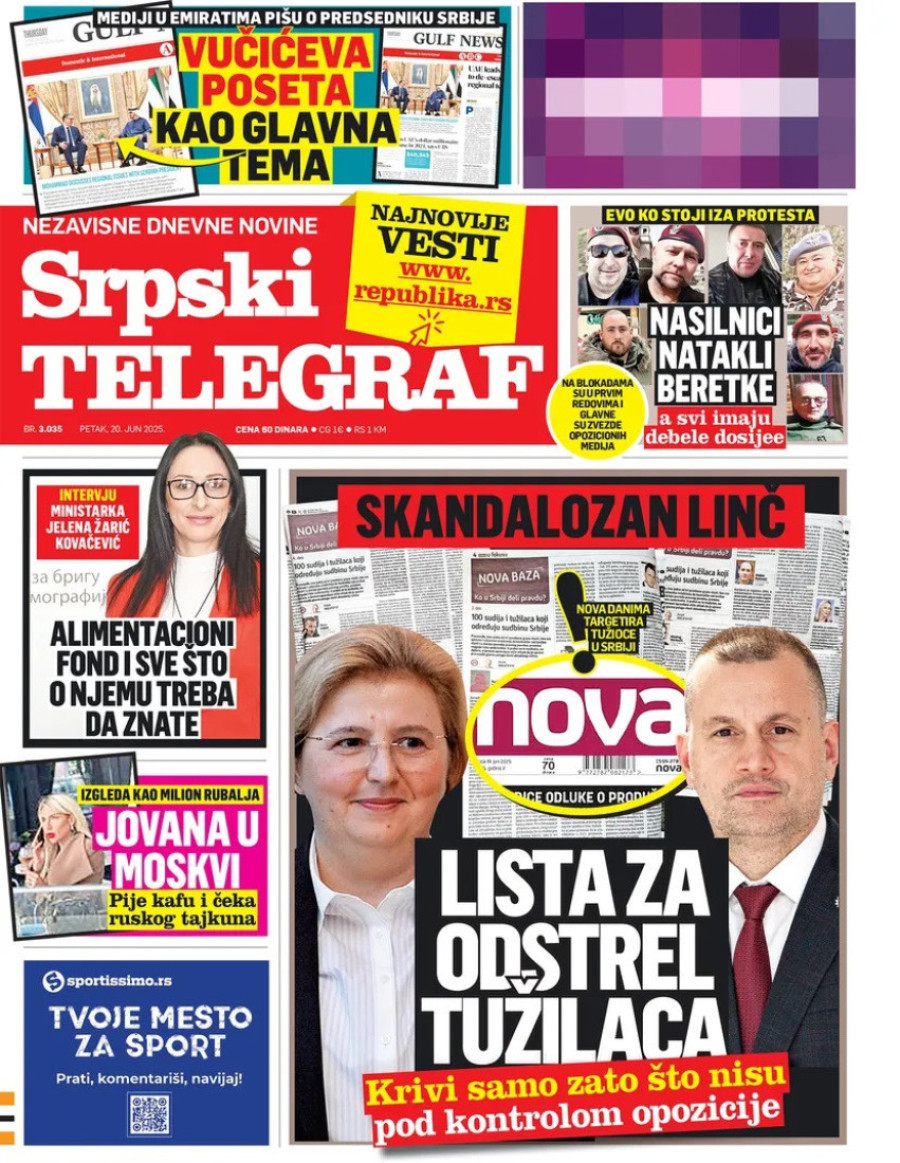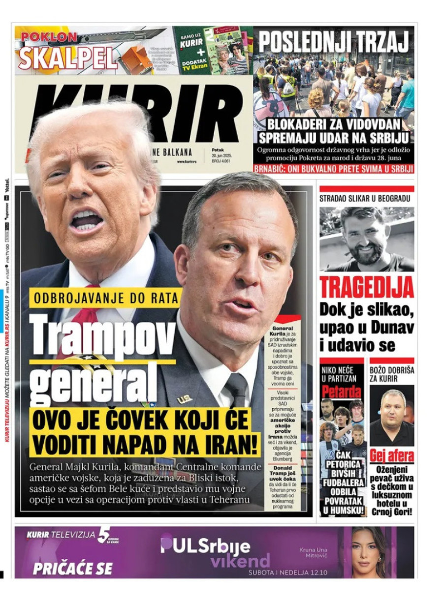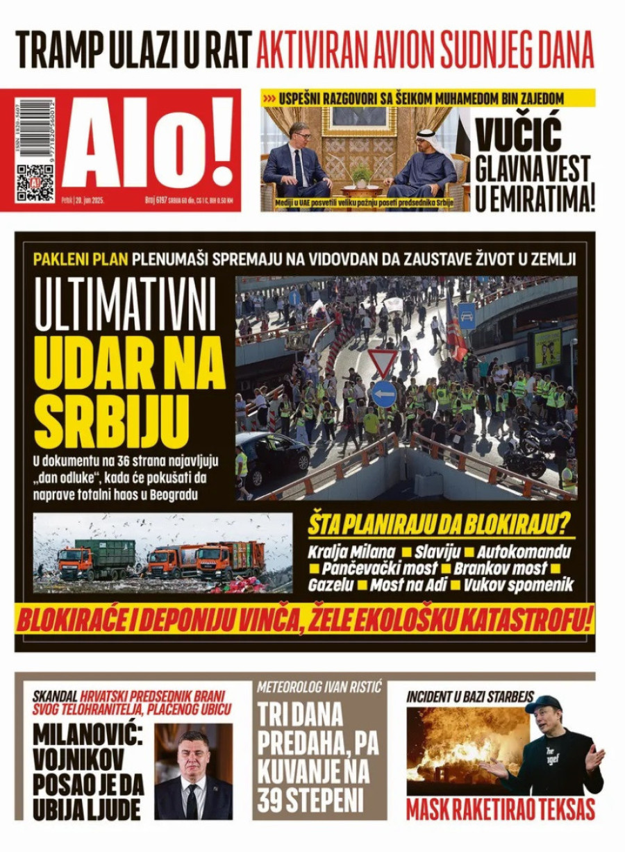 Dnevne novine u Srbiji za petak, 20. jun 2025. godine, na naslovnim stranama najavljuju brojne aktuelne društveno-političke teme.
