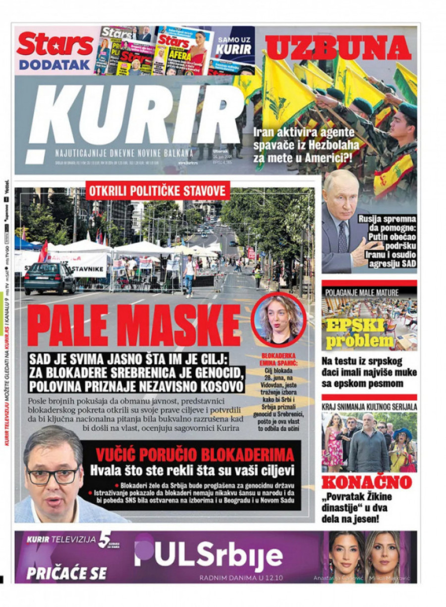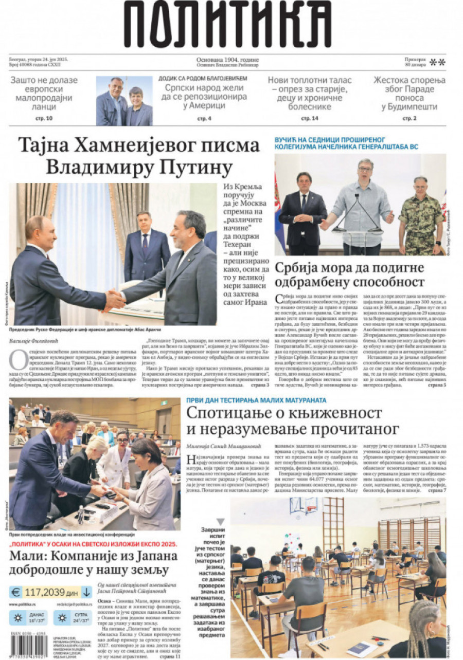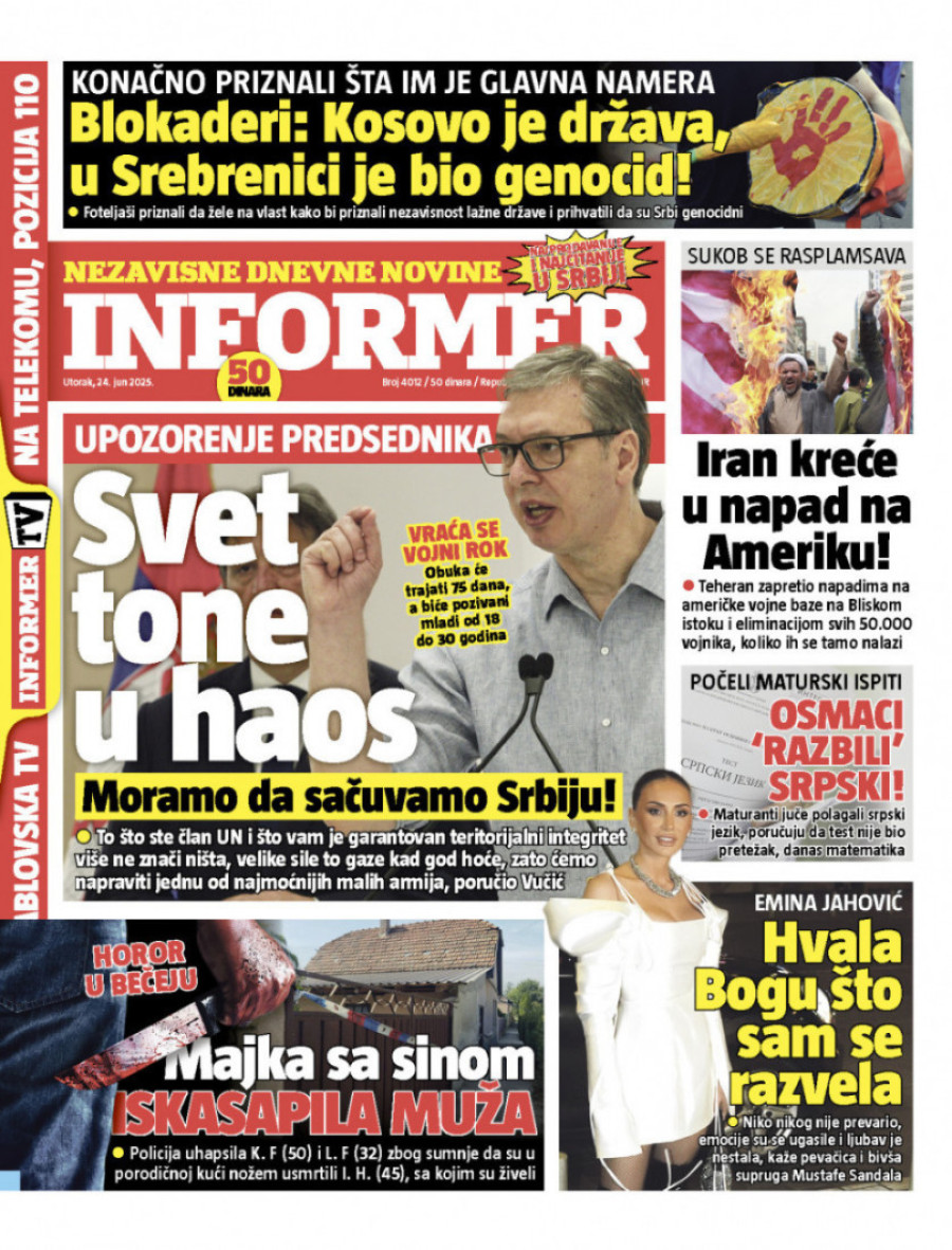 Dnevne novine u Srbiji za utorak, 24. jun 2025. godine, na naslovnim stranama najavljuju brojne aktuelne društveno-političke teme.