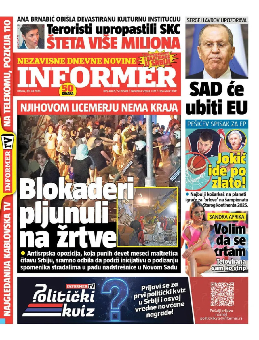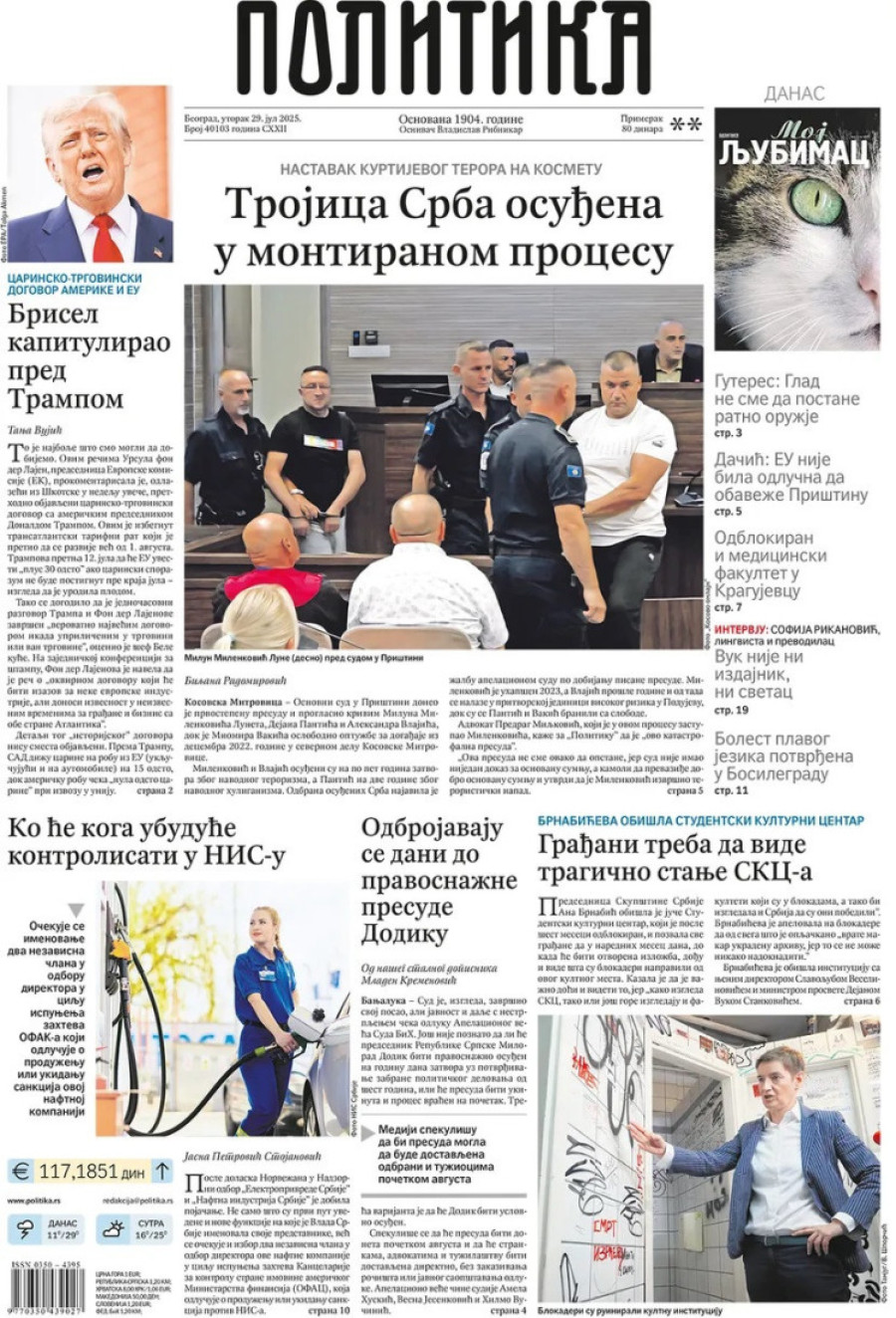 Dnevne novine u Srbiji za utorak 29. jul 2025. godine, na naslovnim stranama najavljuju brojne aktuelne društveno-političke teme.