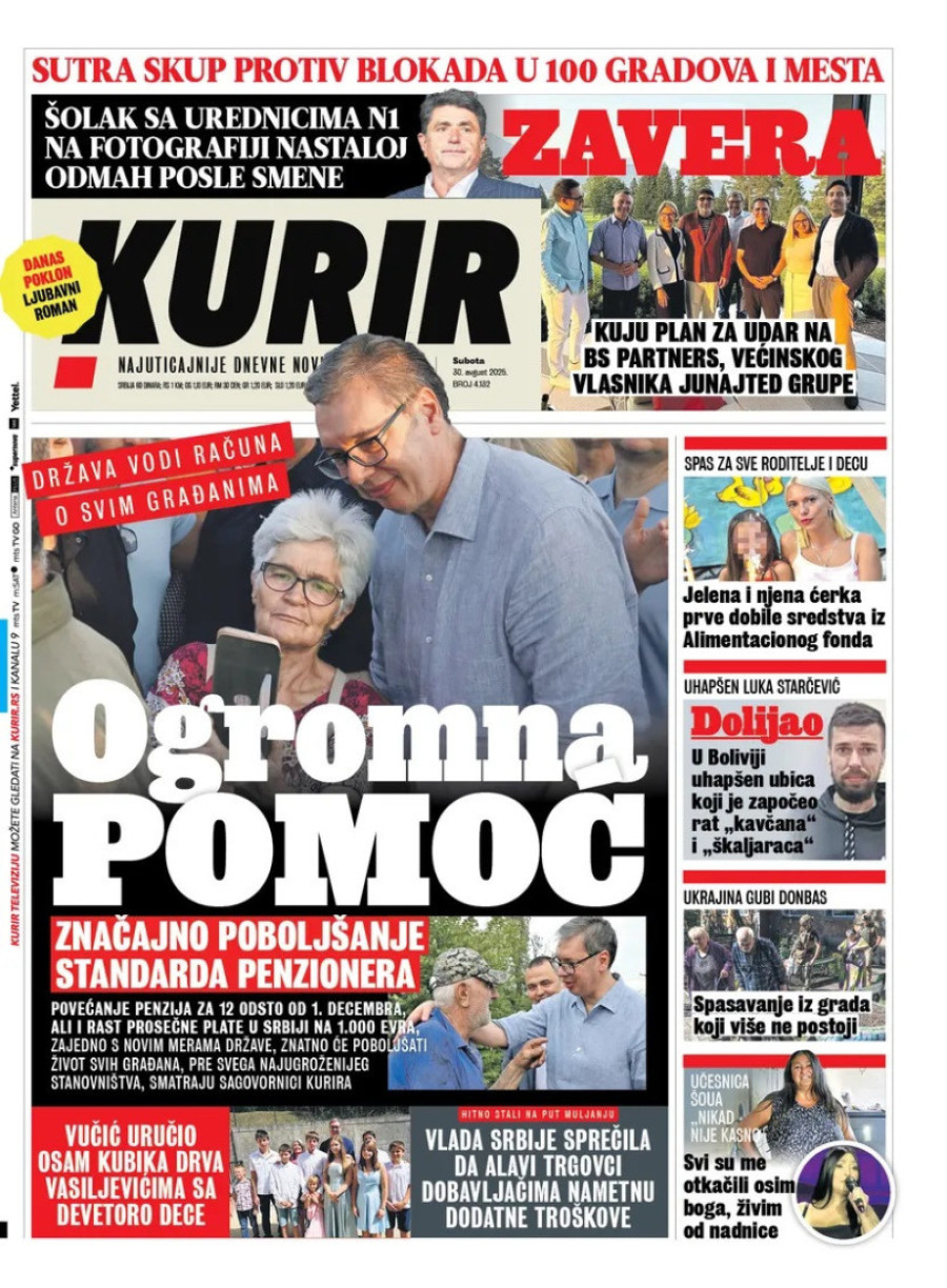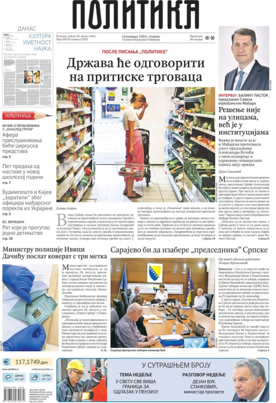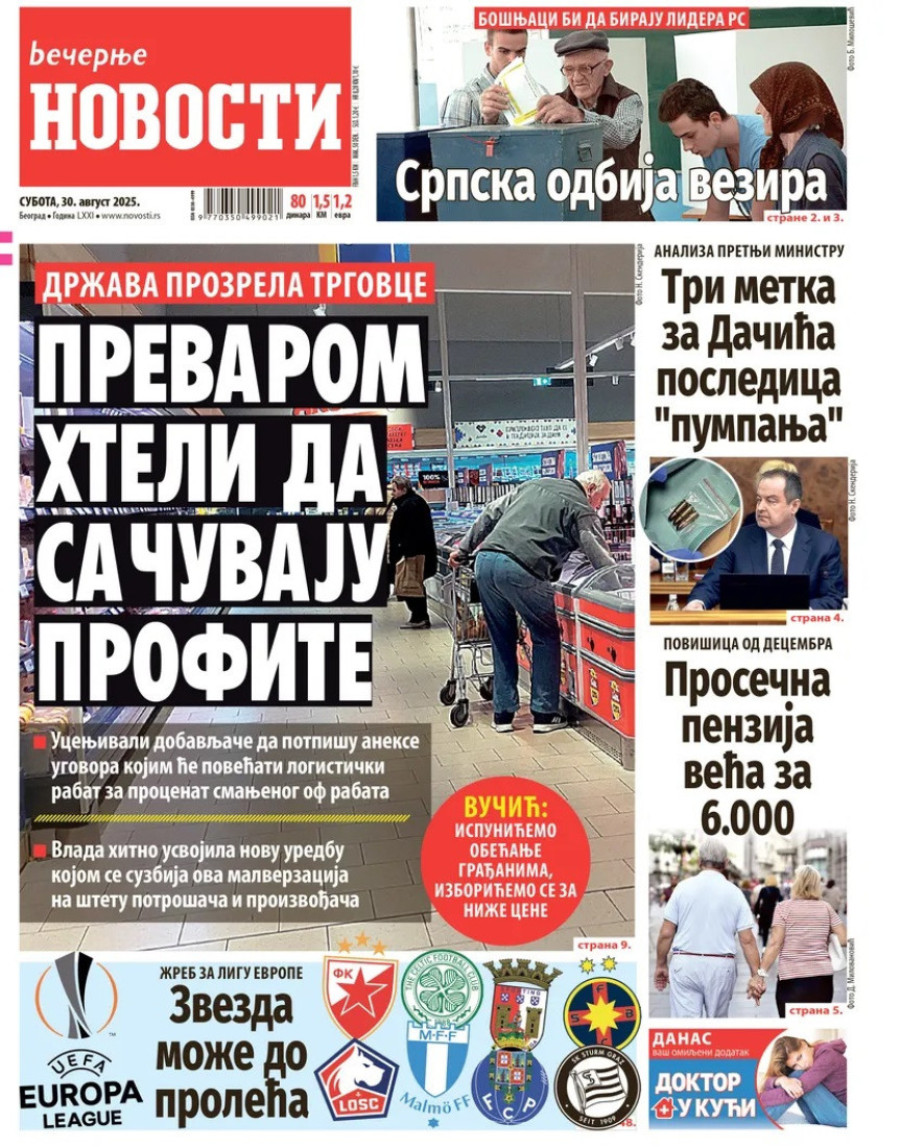 Naslovne strane dnevnih novina: Prelistavanje štampe za 30. avgust 2025. godine