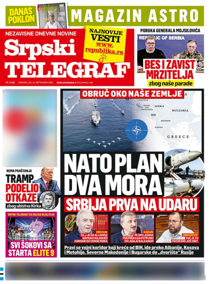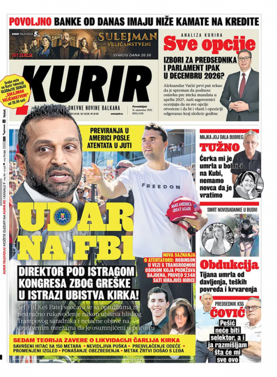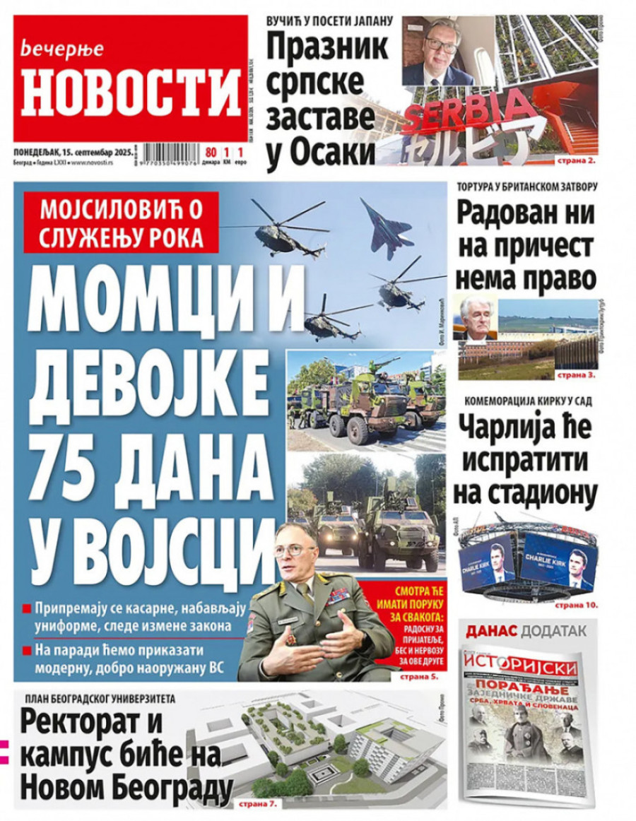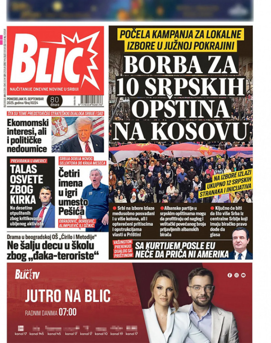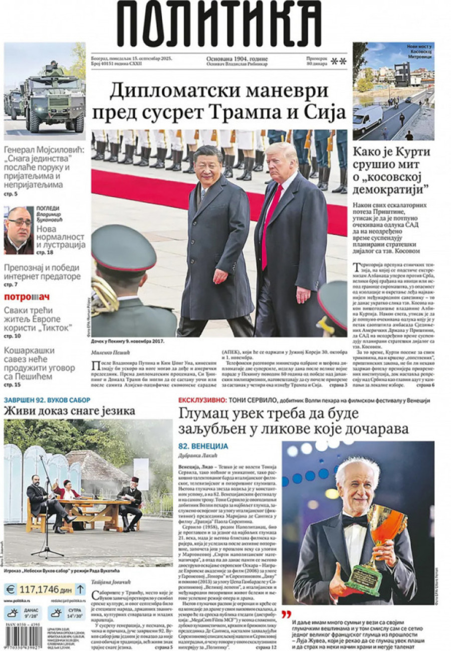Naslovne strane dnevnih novina: Prelistavanje štampe za 15. septembar 2025. godine