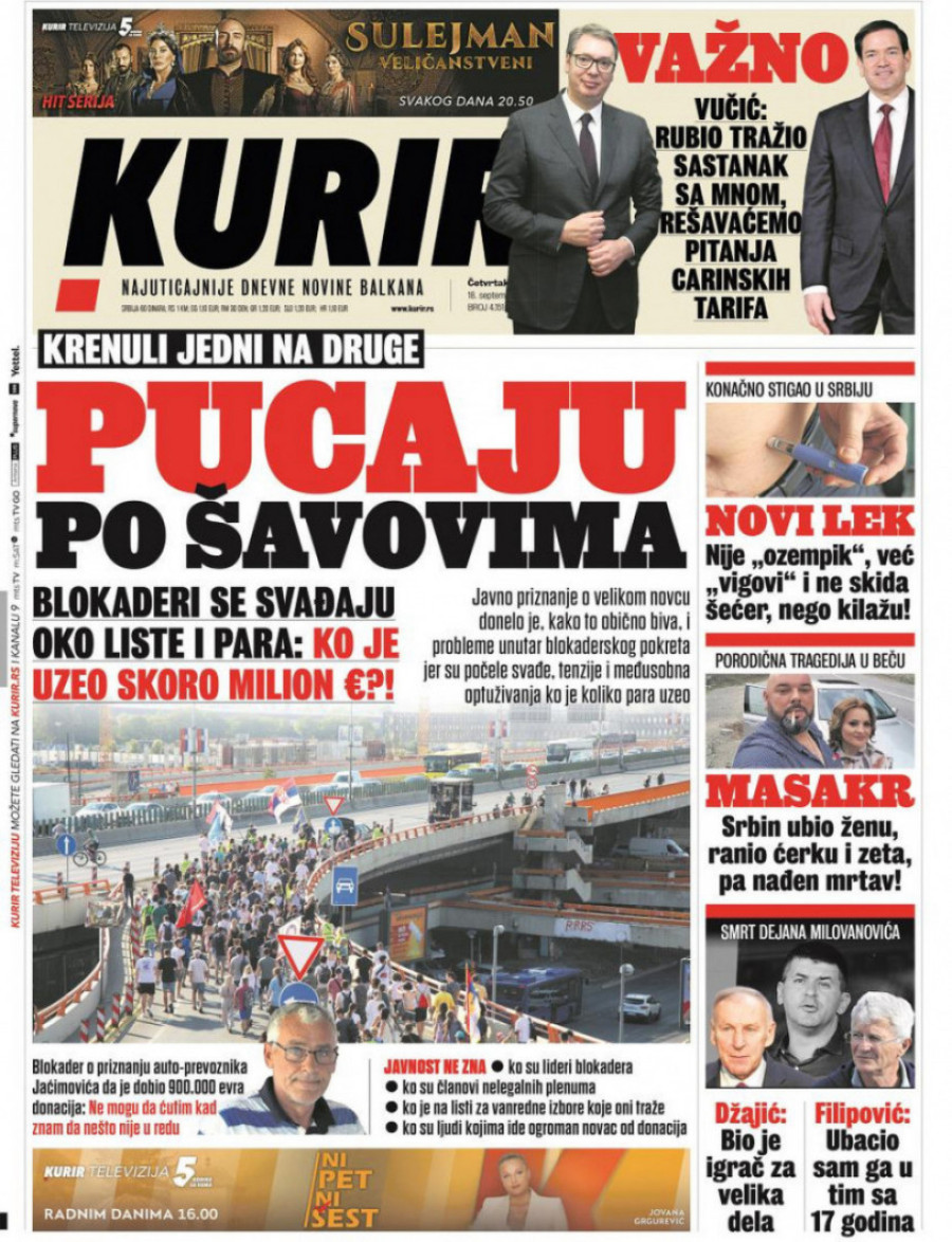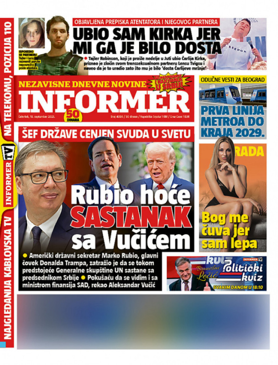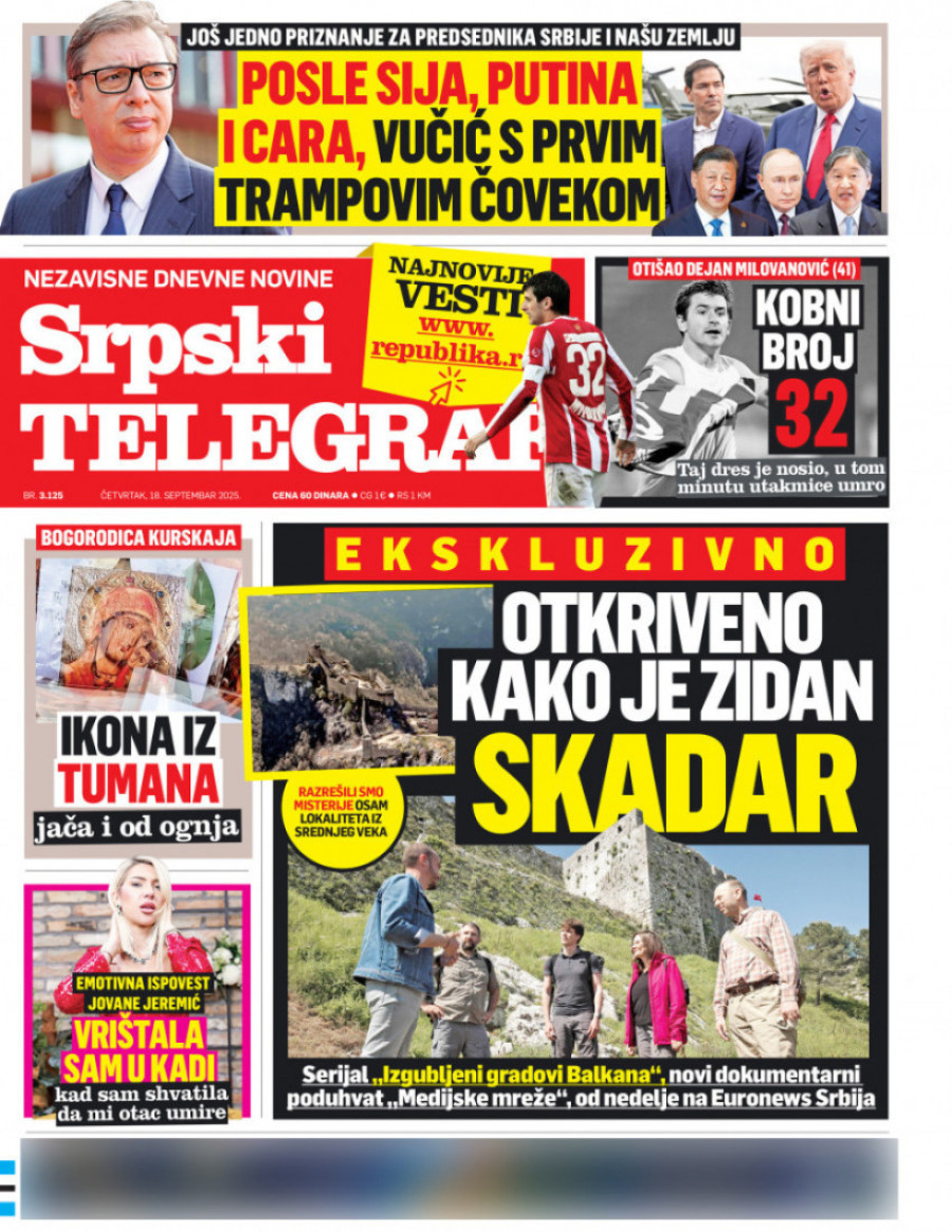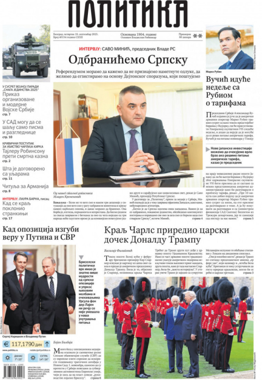 Naslovne strane dnevnih novina: Prelistavanje štampe za 18. septembar 2025. godine