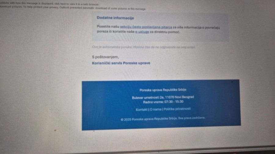 Reč je o dobro osmišljenoj prevari. Poreska uprava upozorava da se na takve poruke ne reaguje i da se nikako ne postupa prema uputstvima koja sadrže, već da se iste odmah obrišu.