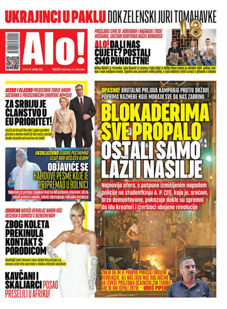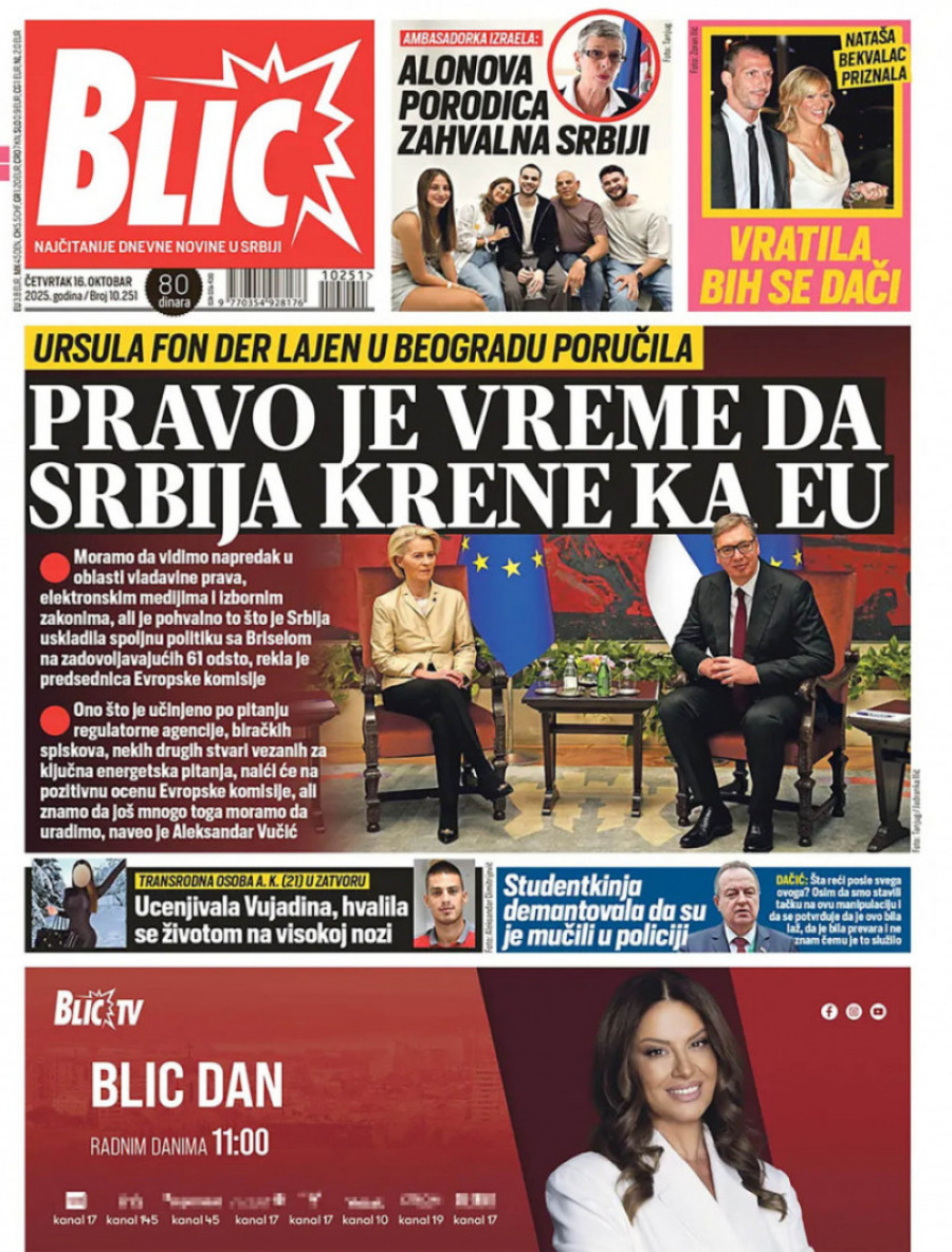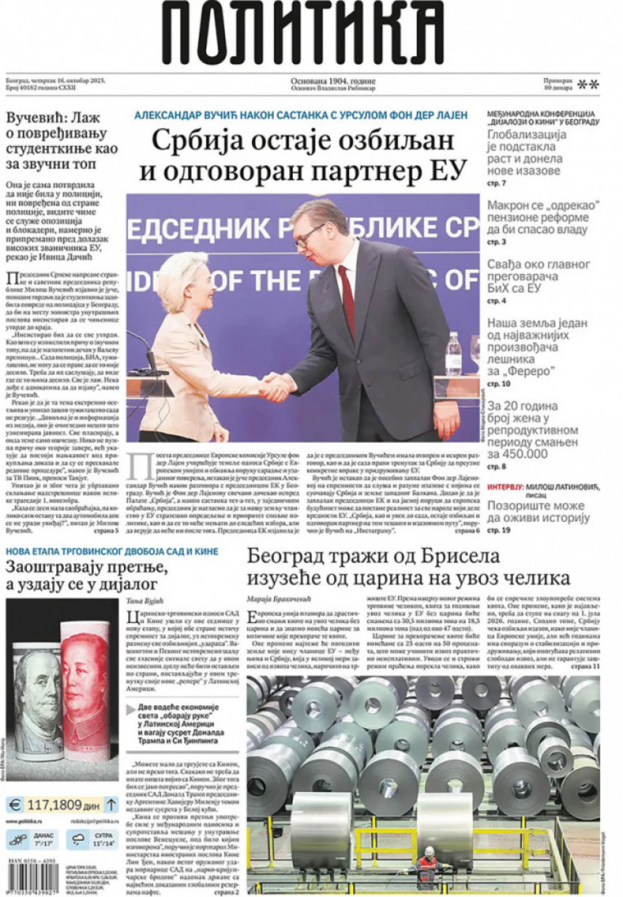 Naslovne strane dnevnih novina: Prelistavanje štampe za 16. oktobar 2025. godine