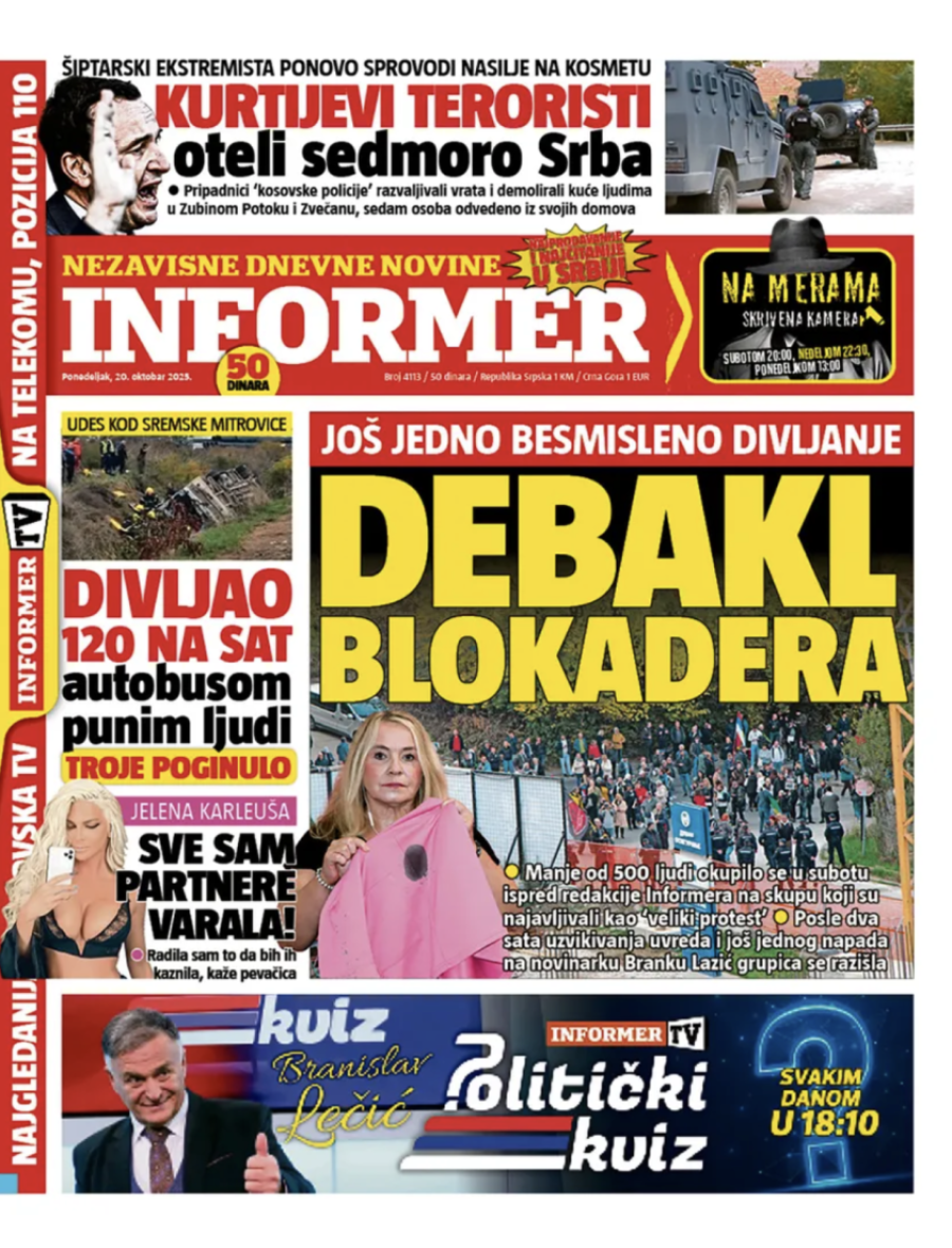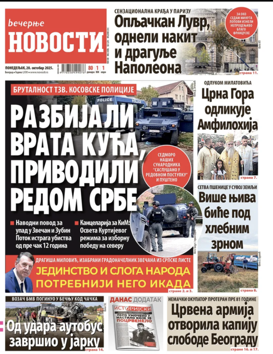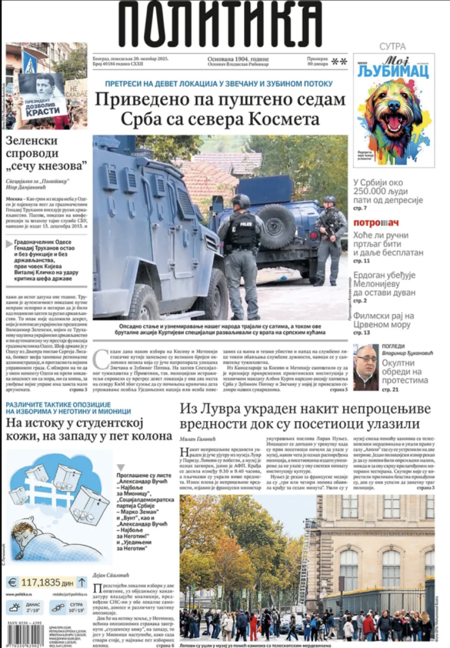 Naslovne strane dnevnih novina: Prelistavanje štampe za 20. oktobar 2025. godine