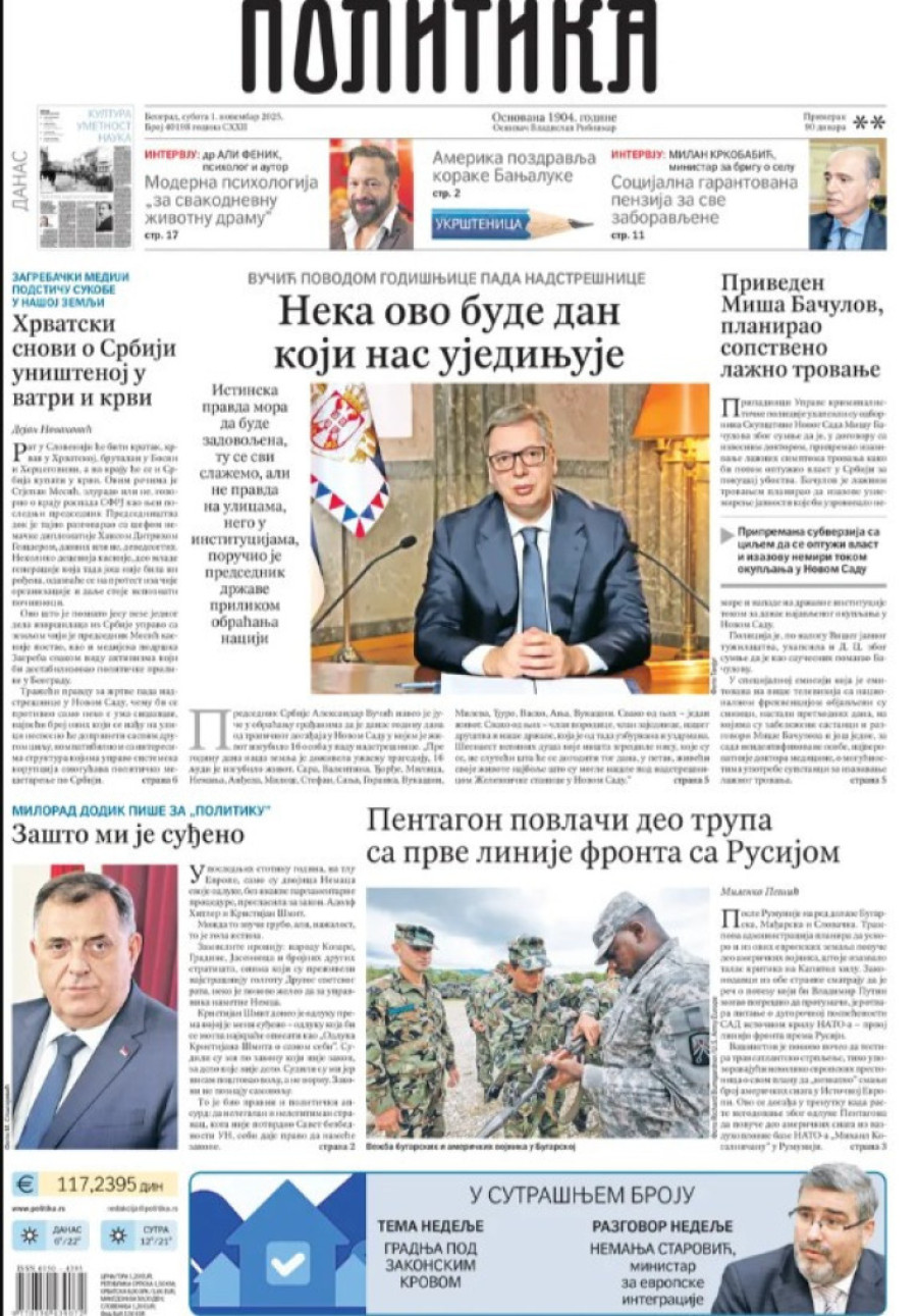 Naslovne strane dnevnih novina: Prelistavanje štampe za 1. novembar 2025. godine