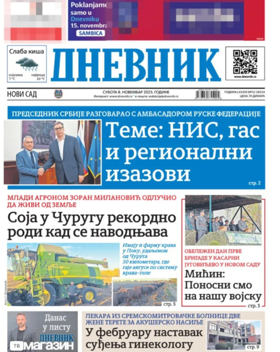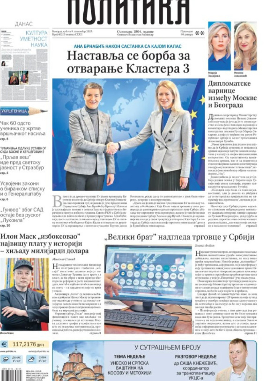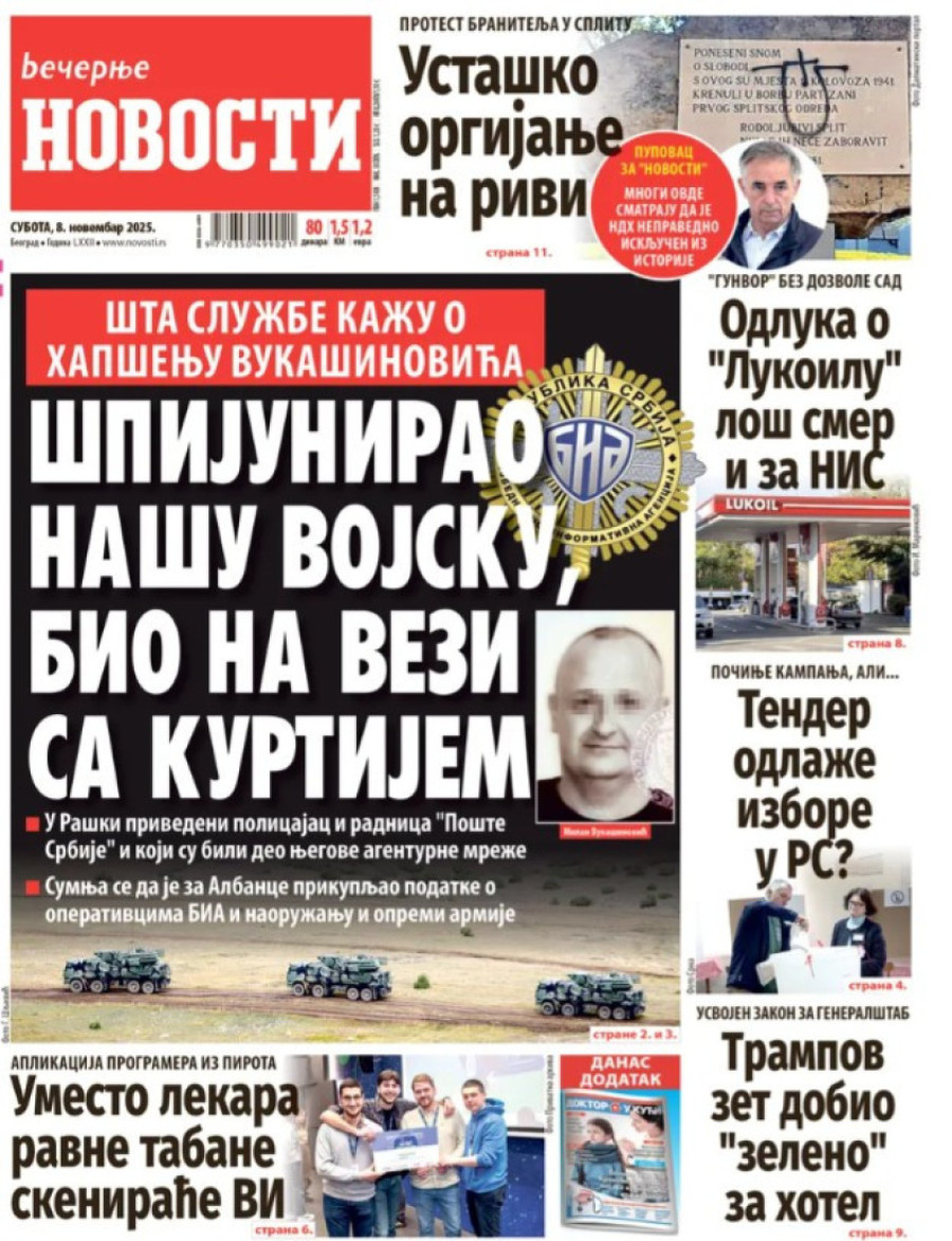 Naslovne strane dnevnih novina: Prelistavanje štampe za 8. novembar 2025. godine