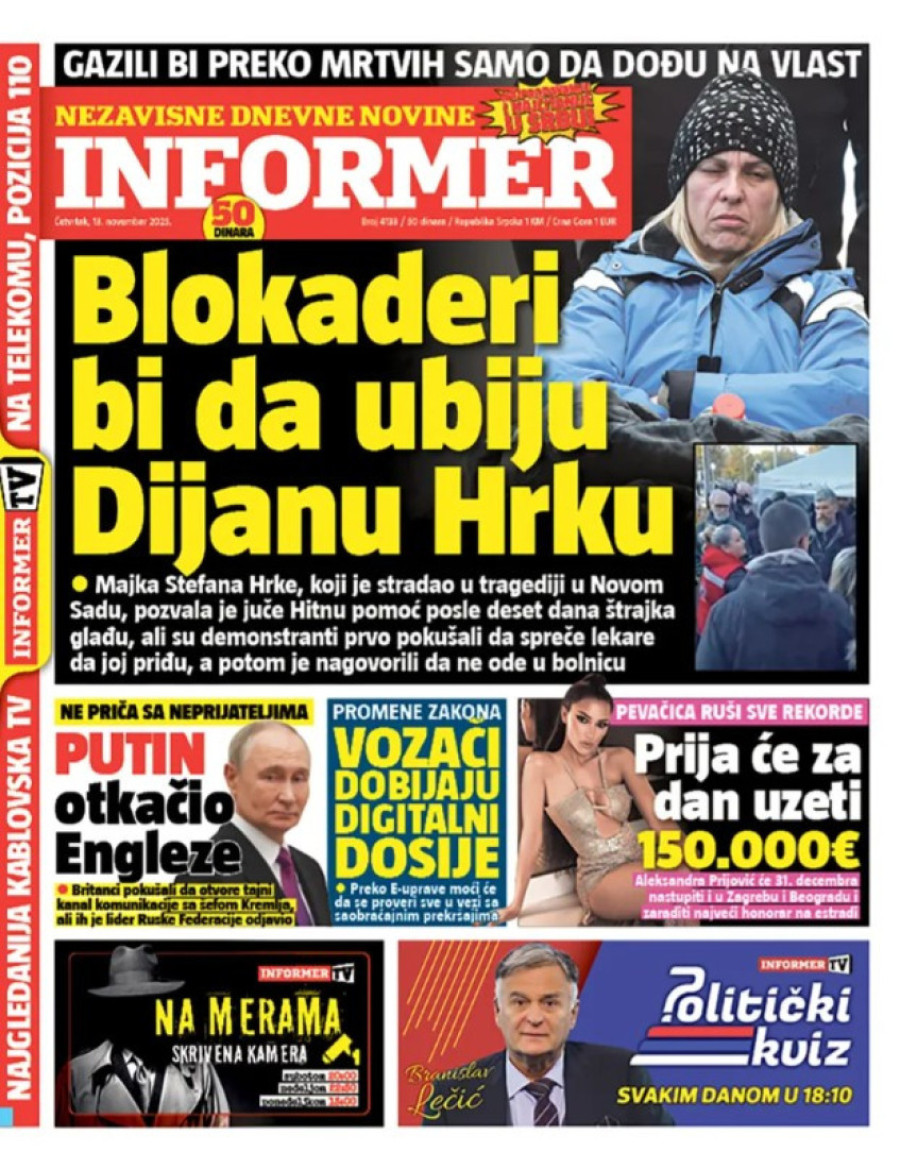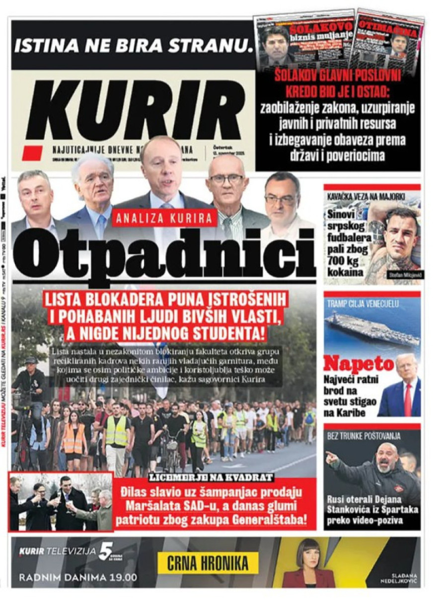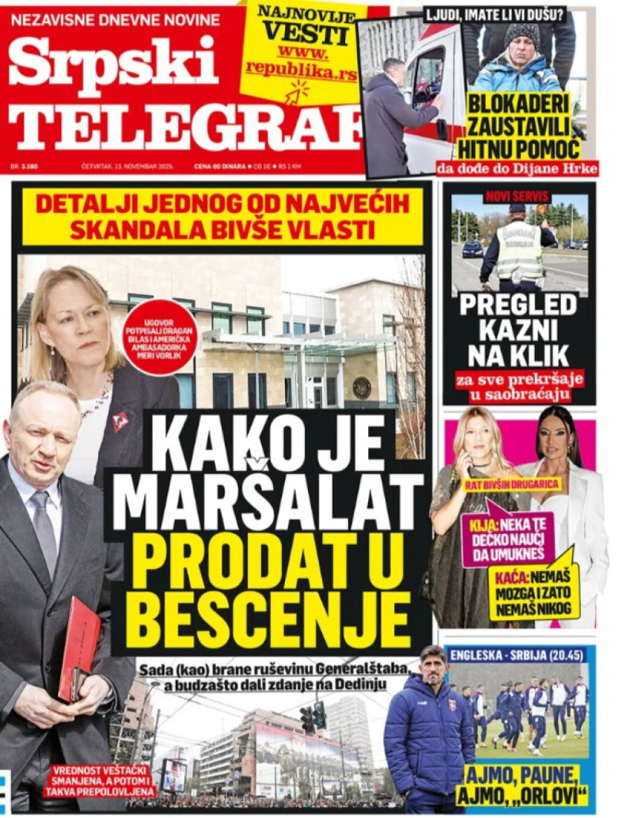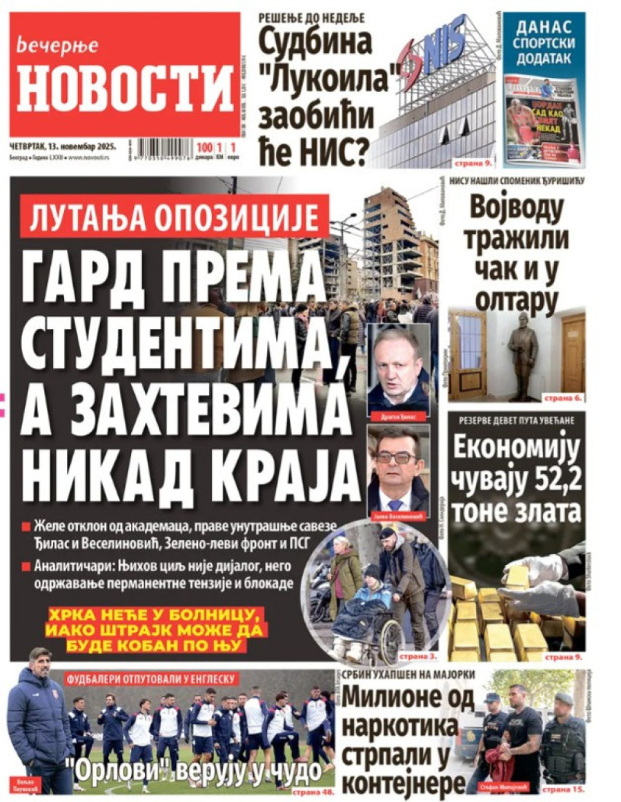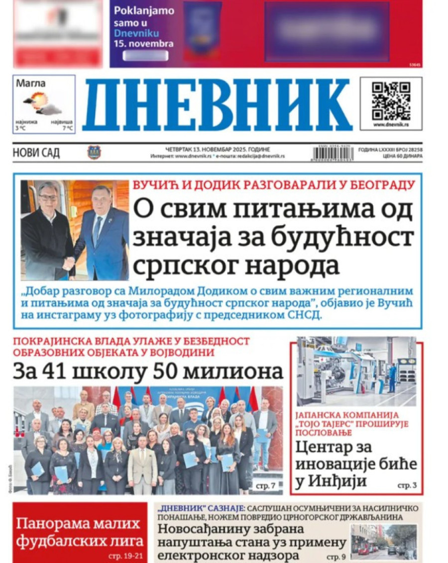 Naslovne strane dnevnih novina: Prelistavanje štampe za 13. novembar 2025. godine