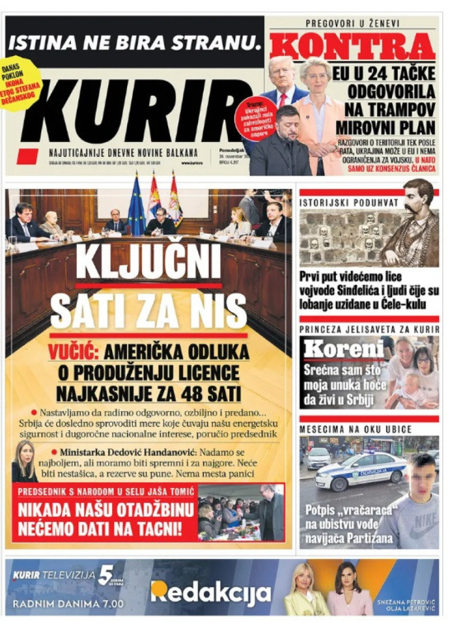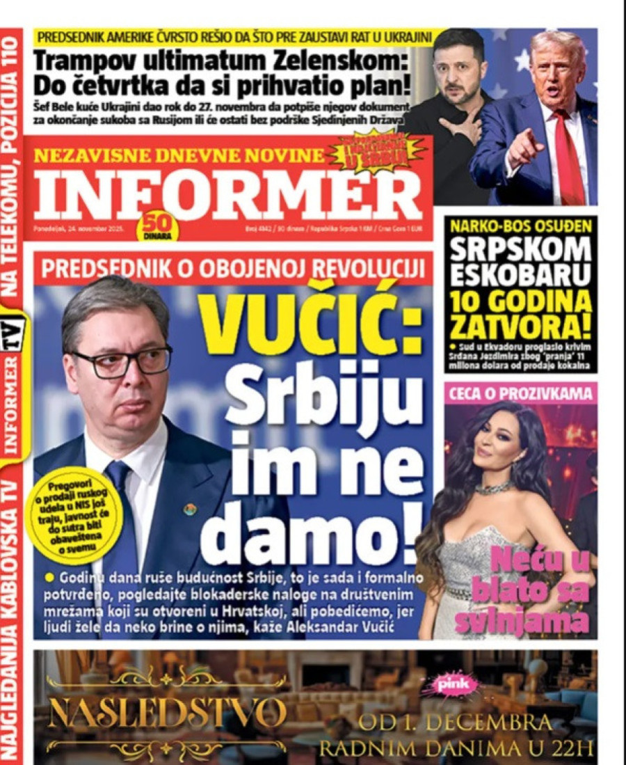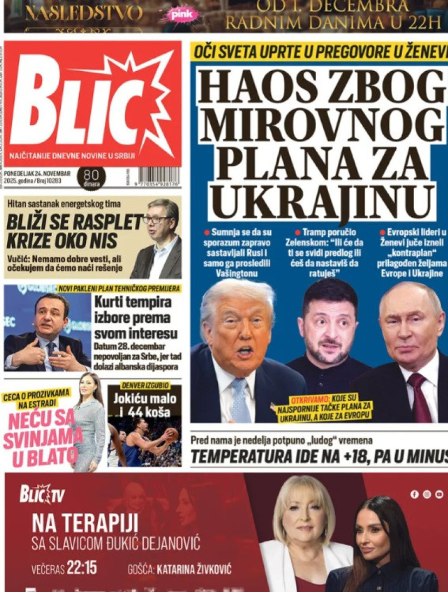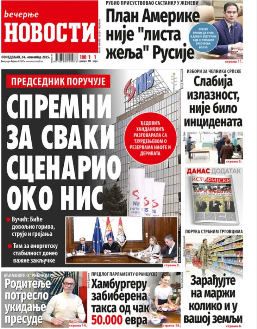 Naslovne strane dnevnih novina: Prelistavanje štampe za 24. novembar 2025. godine