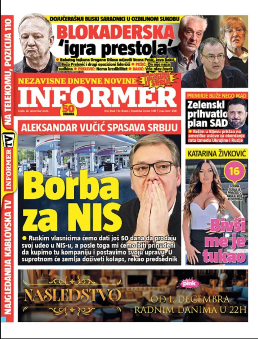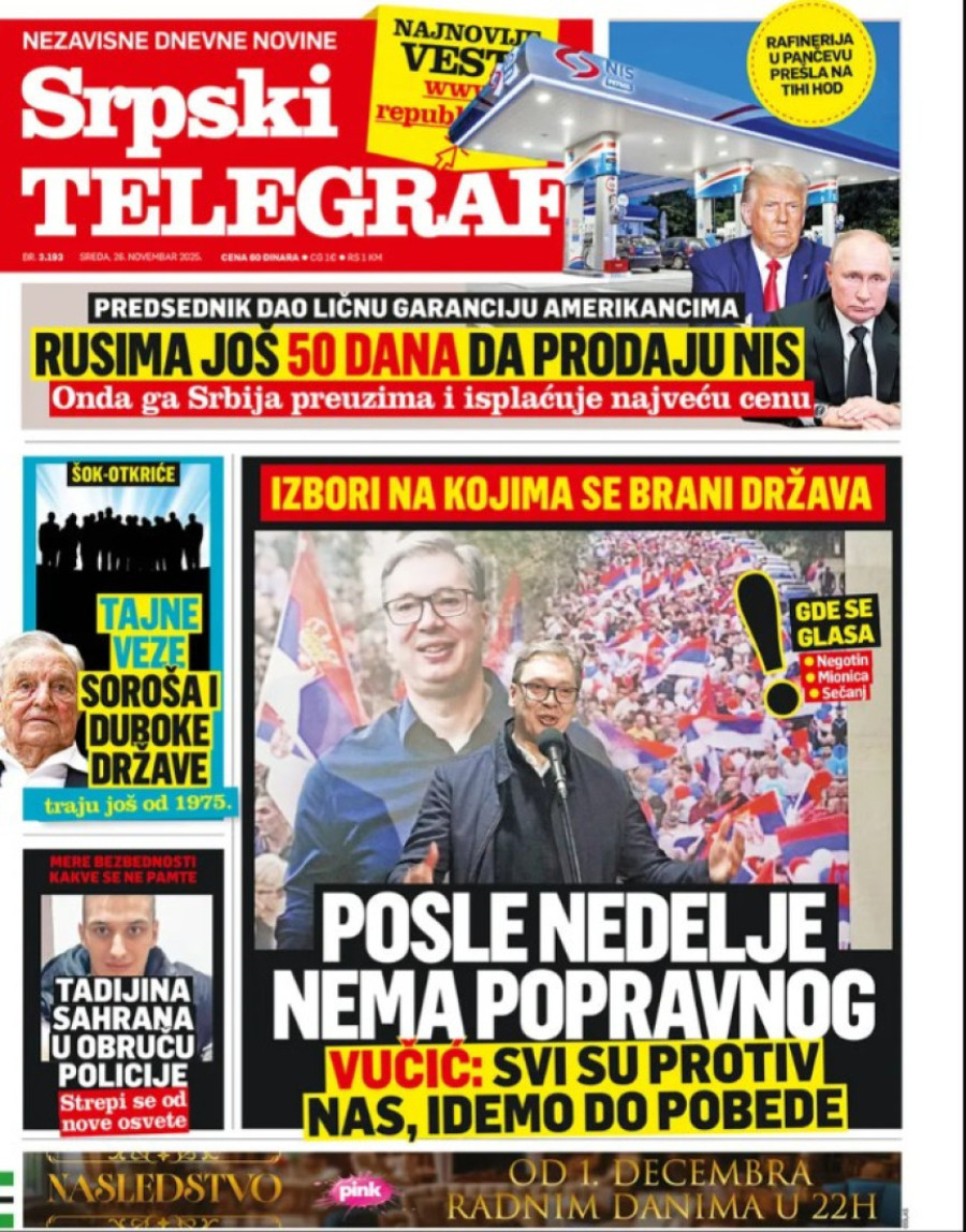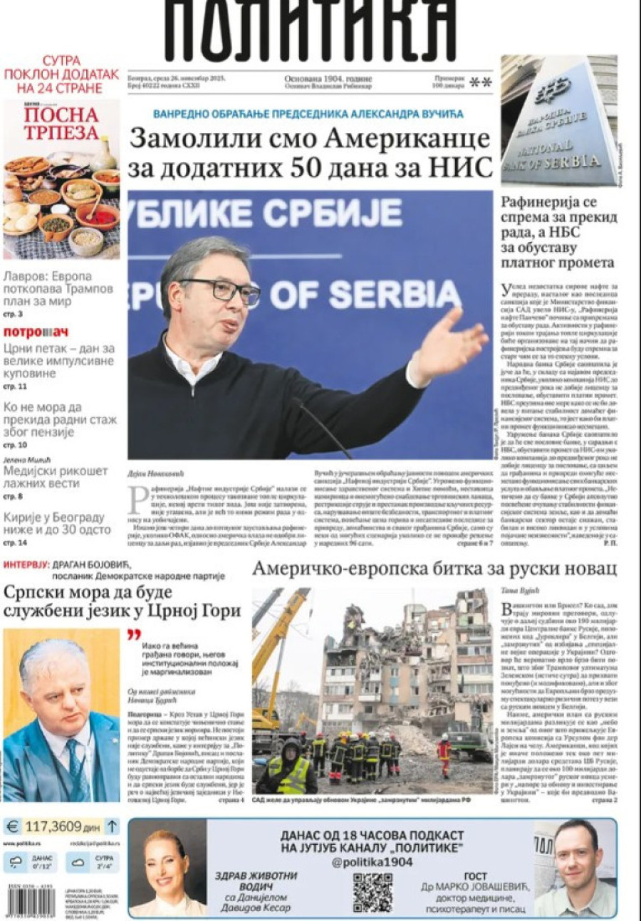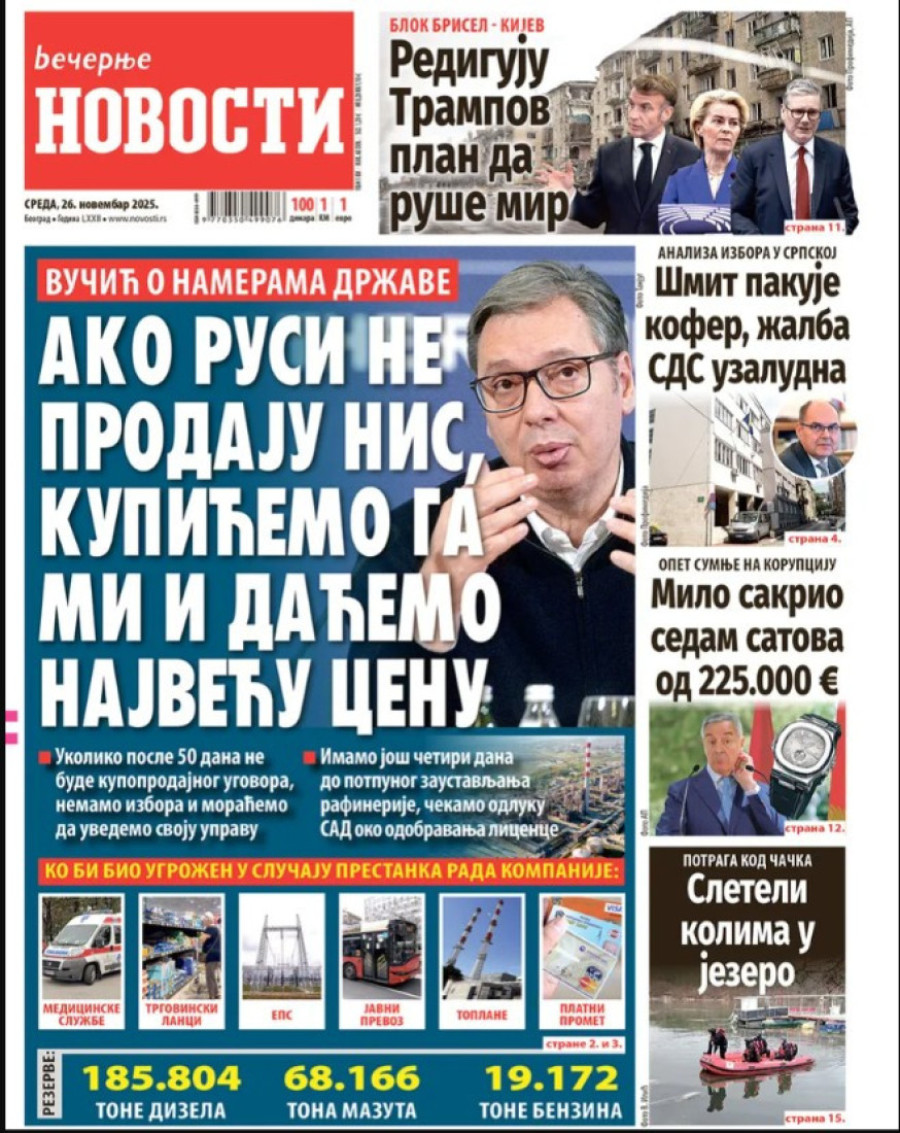 Naslovne strane dnevnih novina: Prelistavanje štampe za 26. novembar 2025. godine