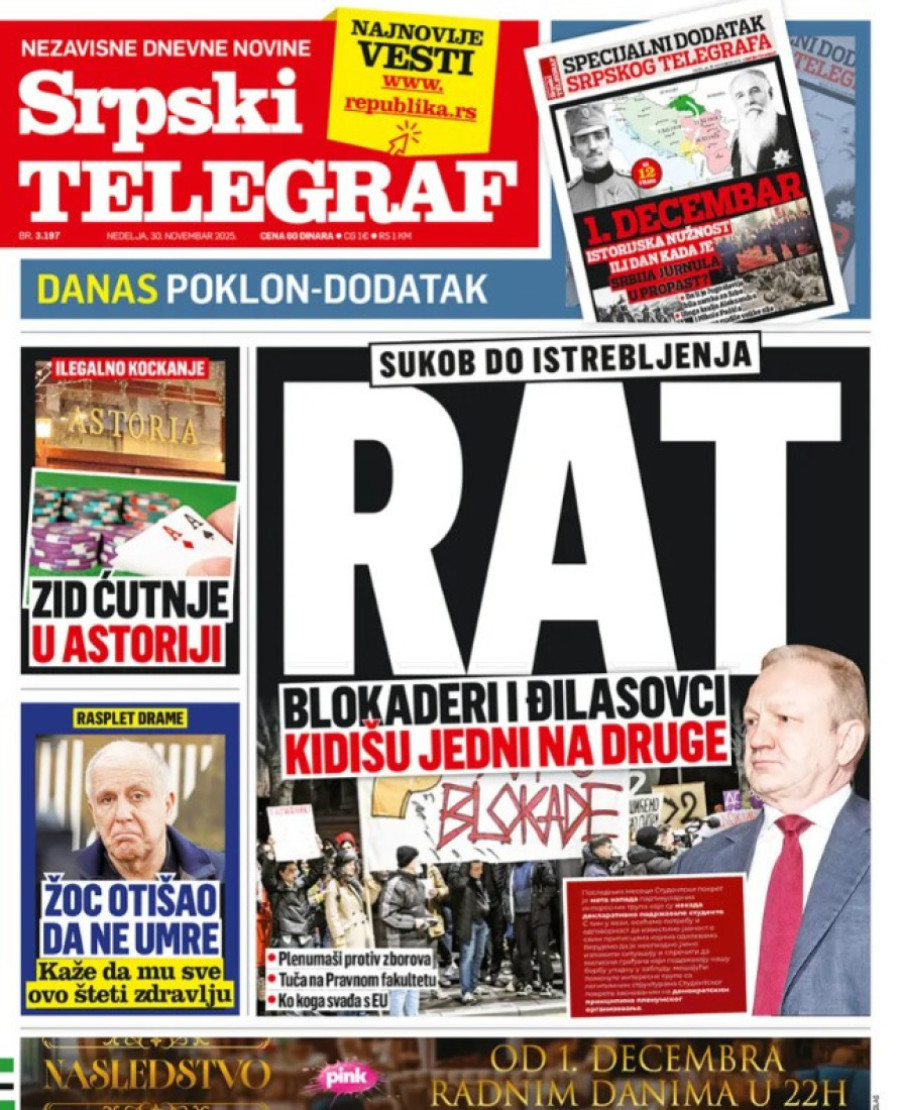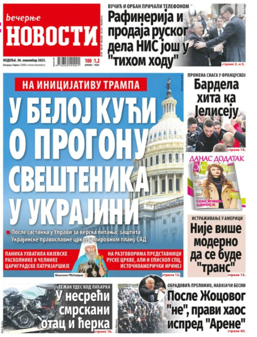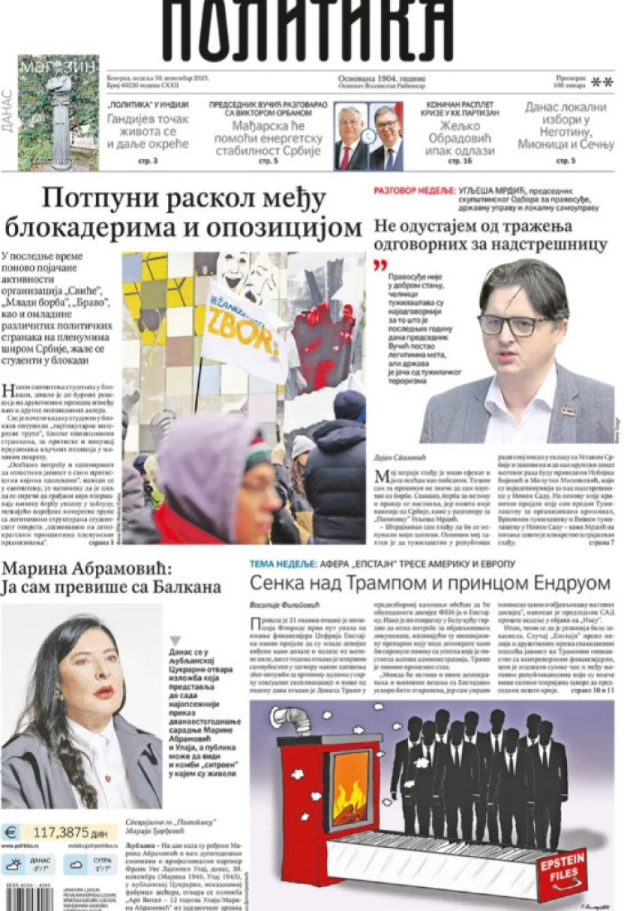 Naslovne strane dnevnih novina: Prelistavanje štampe za 30. novembar 2025. godine
