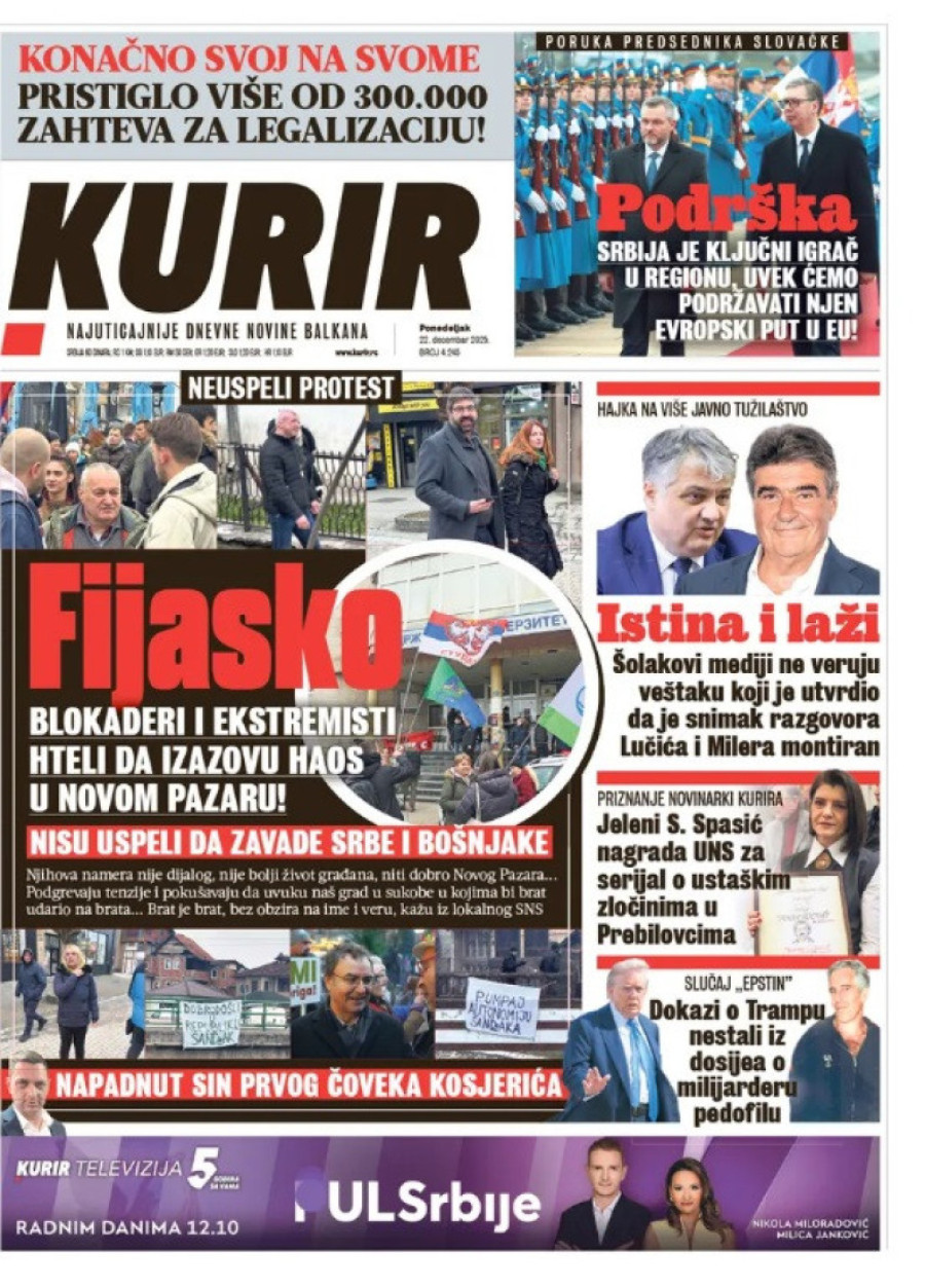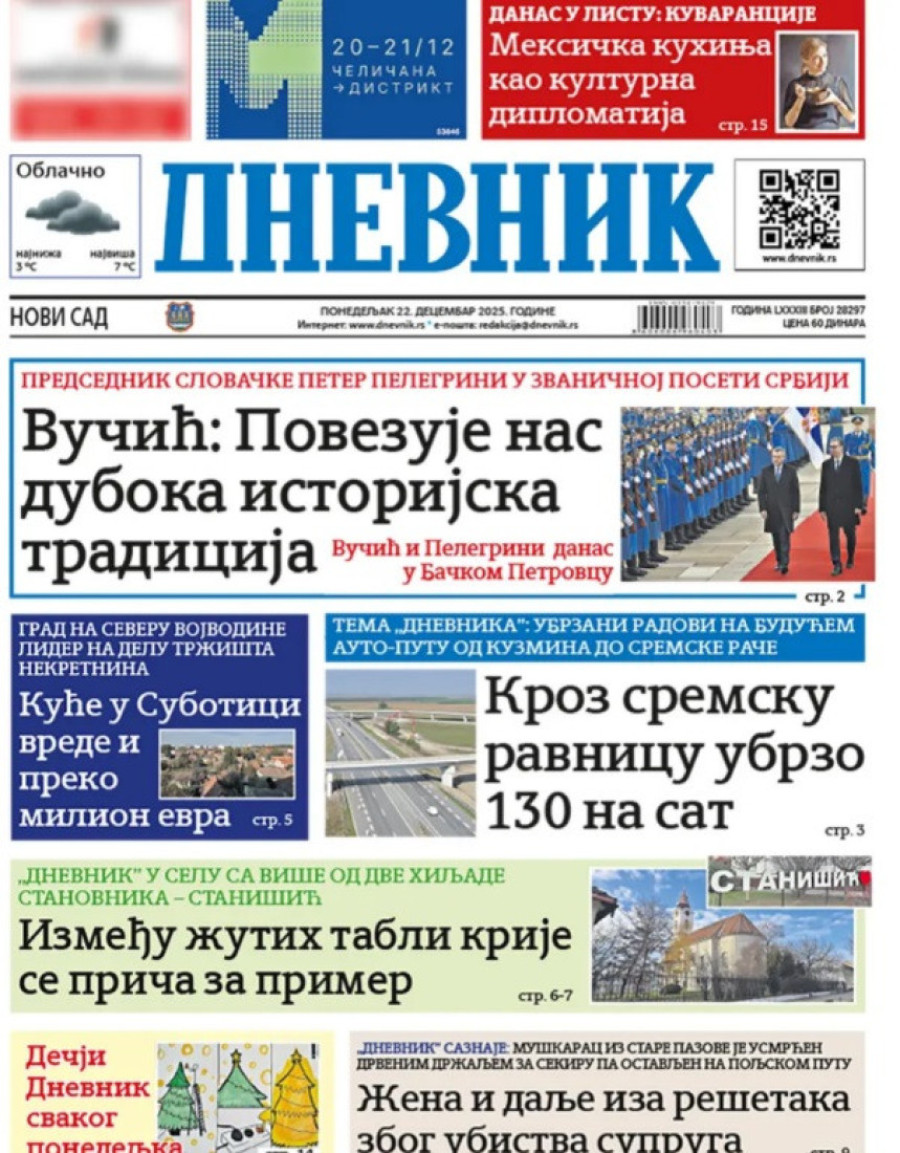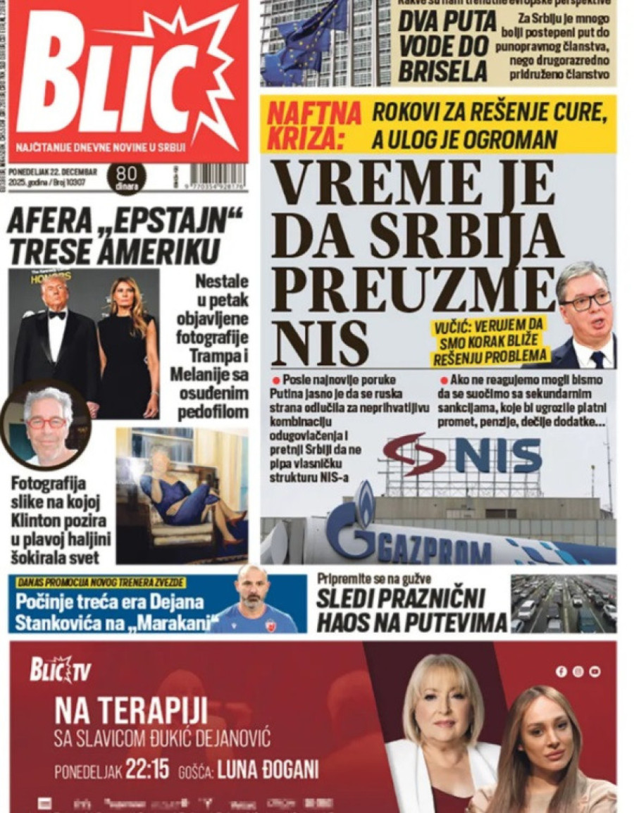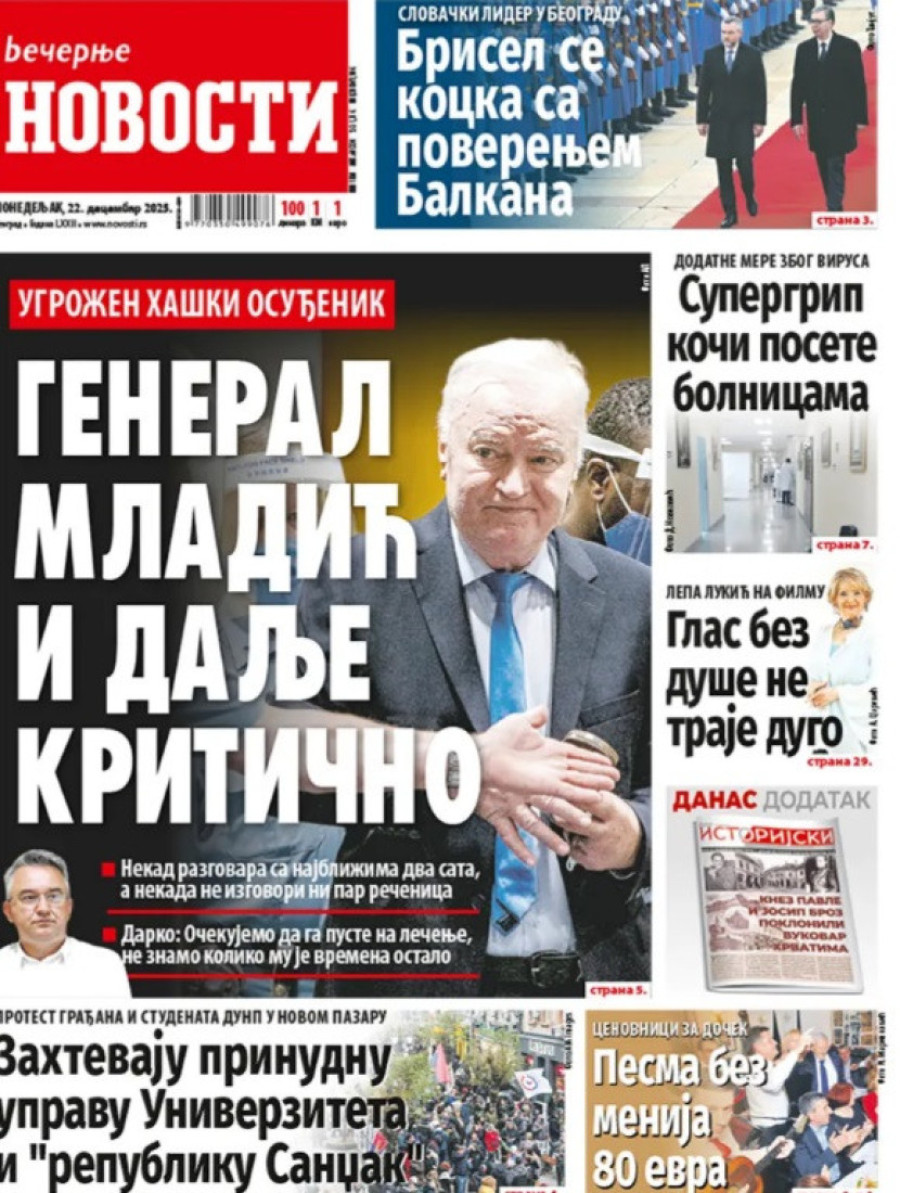 Naslovne strane dnevnih novina: Prelistavanje štampe za 22. decembar 2025. godine