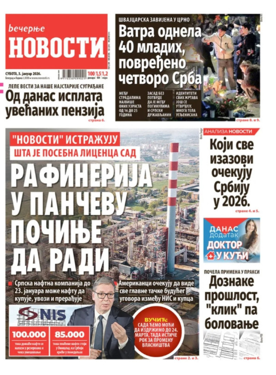 Dnevne novine u Srbiji za subotu 3.januar 2026. godine na naslovnim stranama najavljuju brojne aktuelne društveno-političke teme.