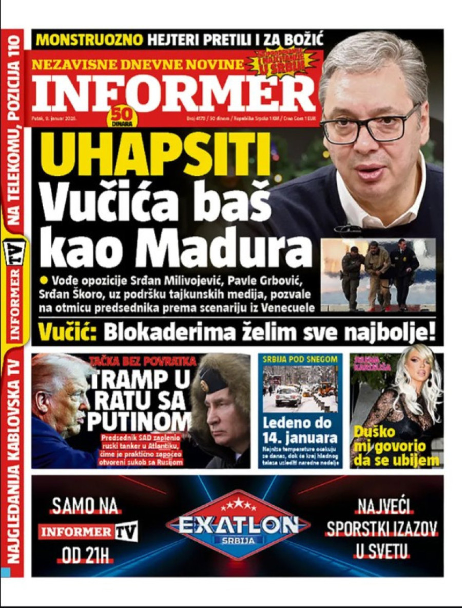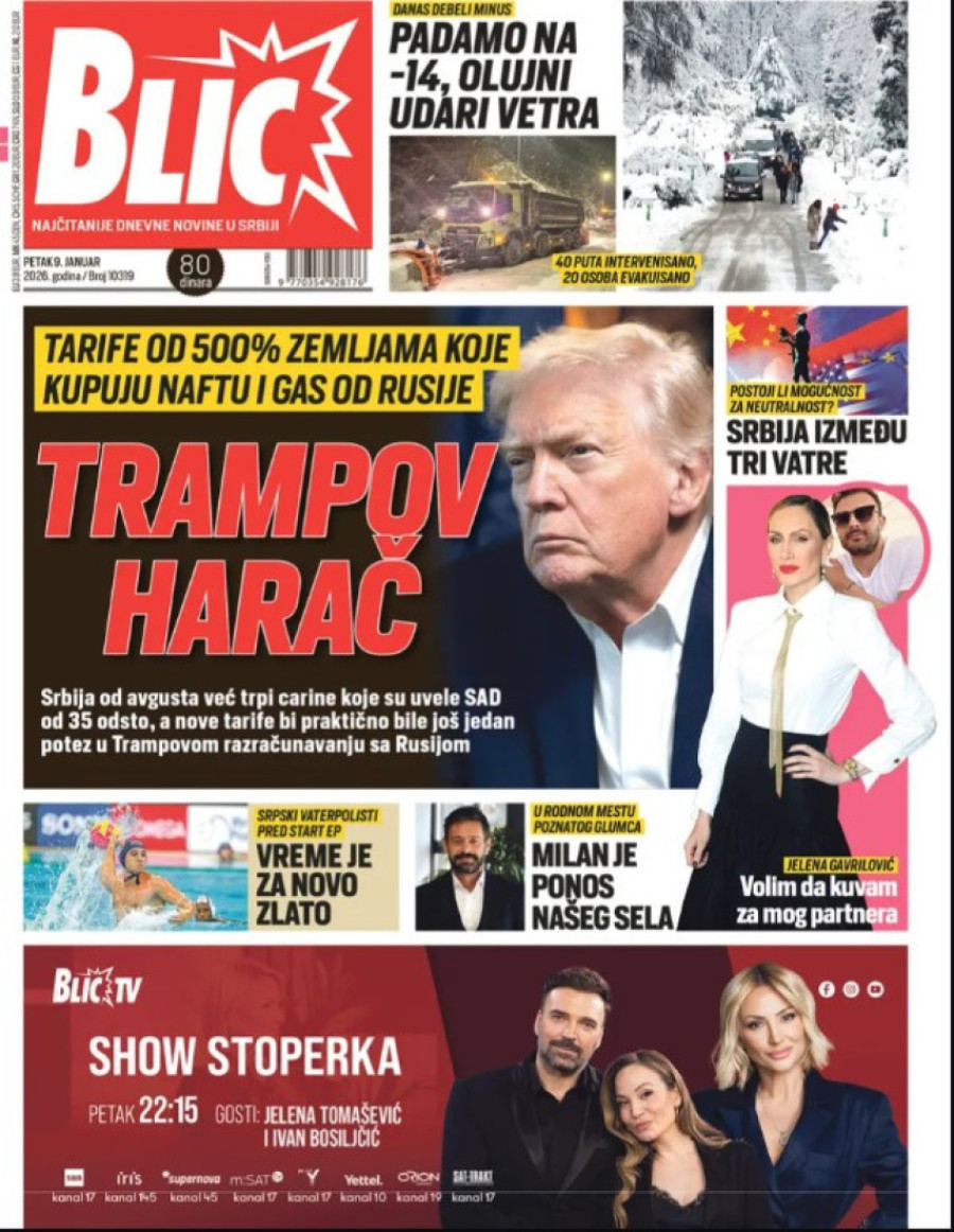 Dnevne novine u Srbiji za petak, 9. januar 2026. godine na naslovnim stranama najavljuju brojne aktuelne društveno-političke teme.
