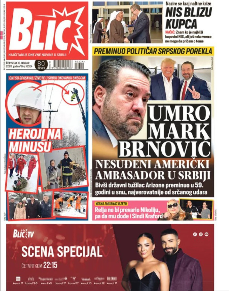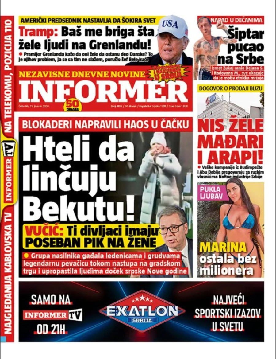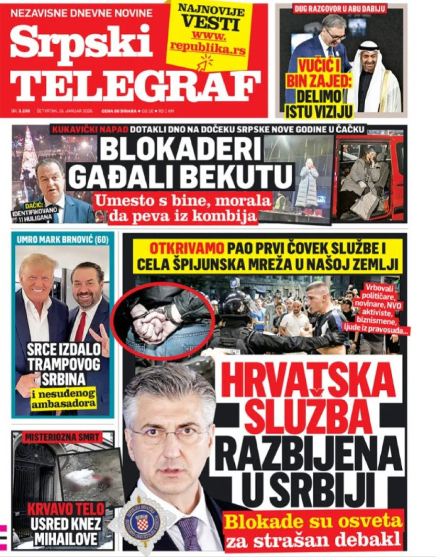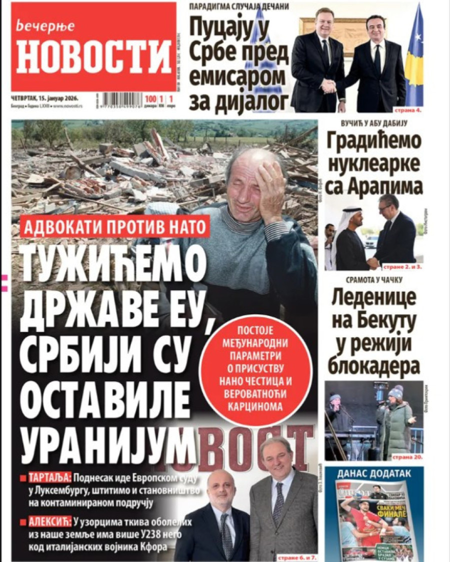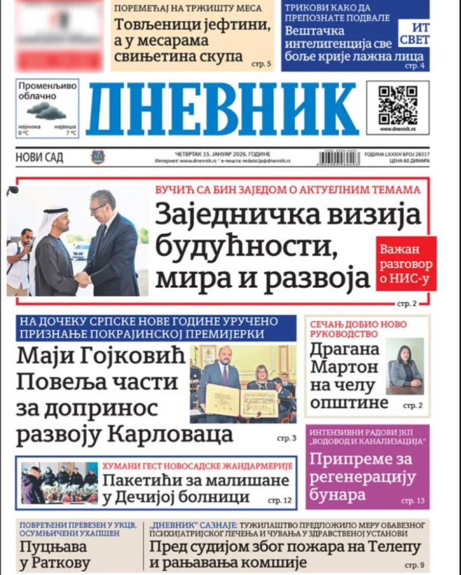 Dnevne novine u Srbiji za četvrtak 15. januar 2026. godine na naslovnim stranama najavljuju brojne aktuelne društveno-političke teme.