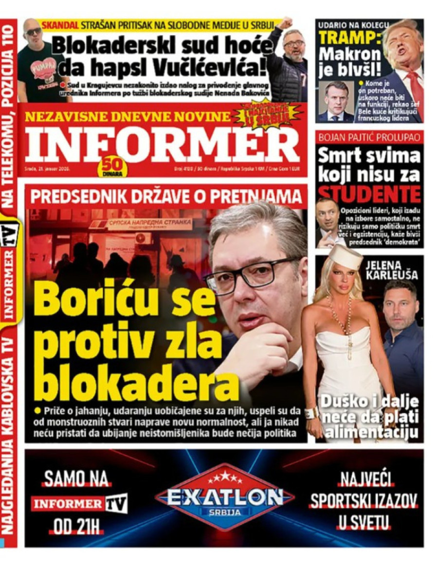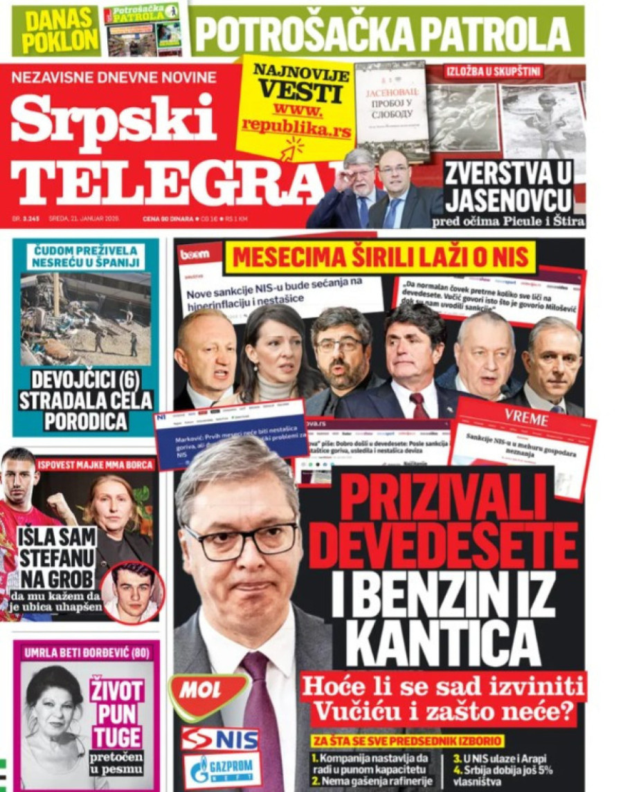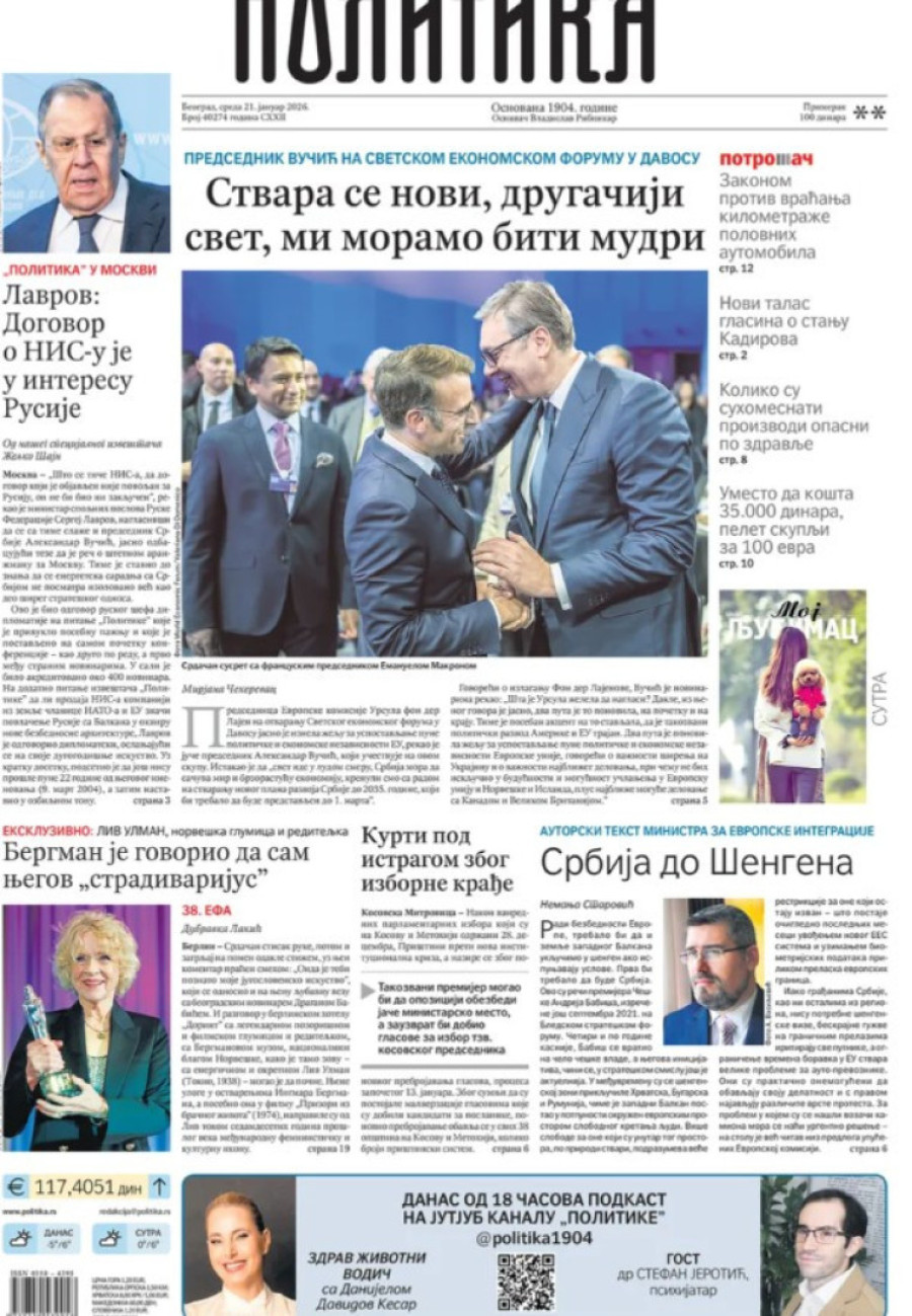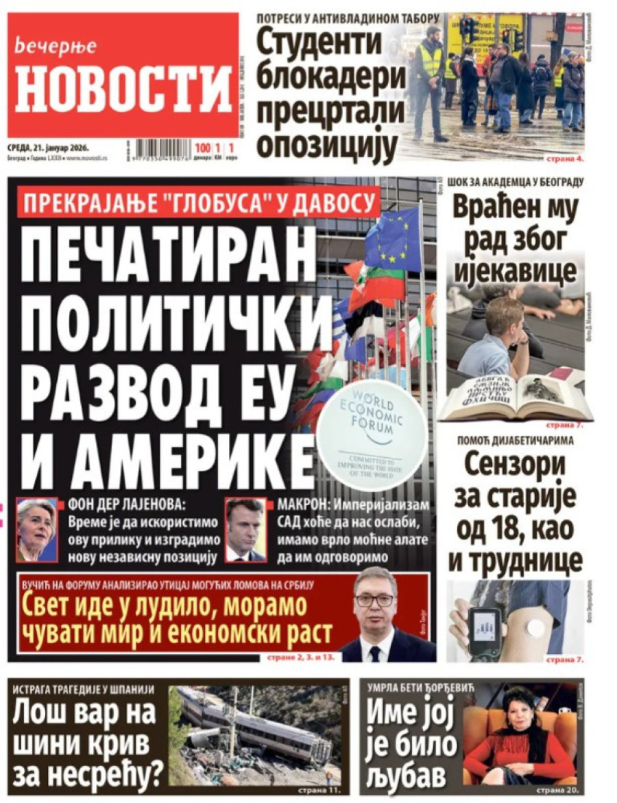 Dnevne novine u Srbiji za sredu, 21. januar 2026. godine na naslovnim stranama najavljuju brojne aktuelne društveno-političke teme.