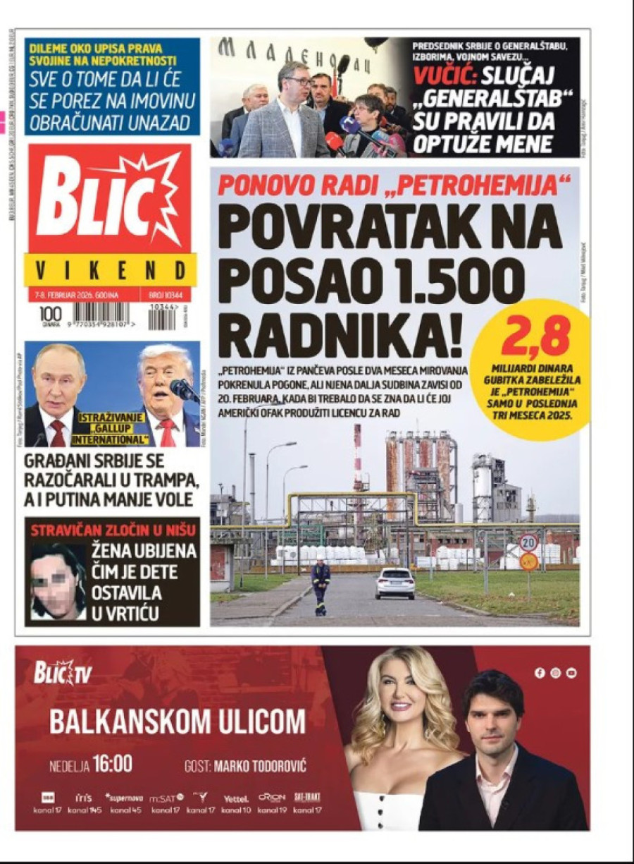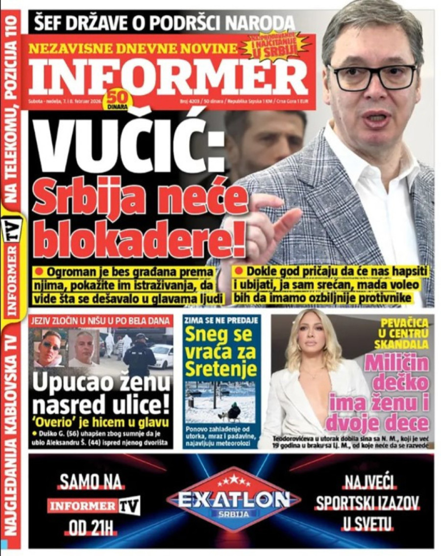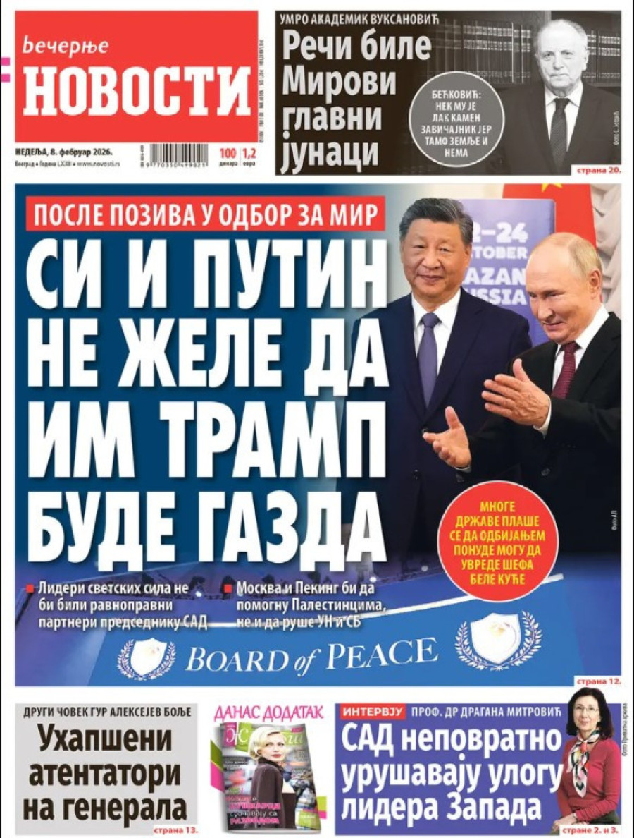 Dnevne novine u Srbiji za nedelju, 8. februar 2026. godine na naslovnim stranama najavljuju brojne aktuelne društveno-političke teme.