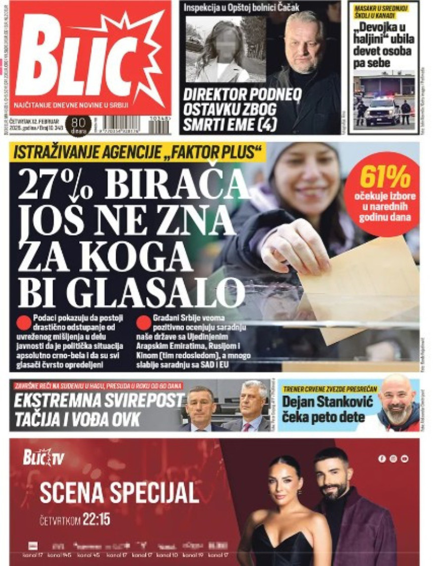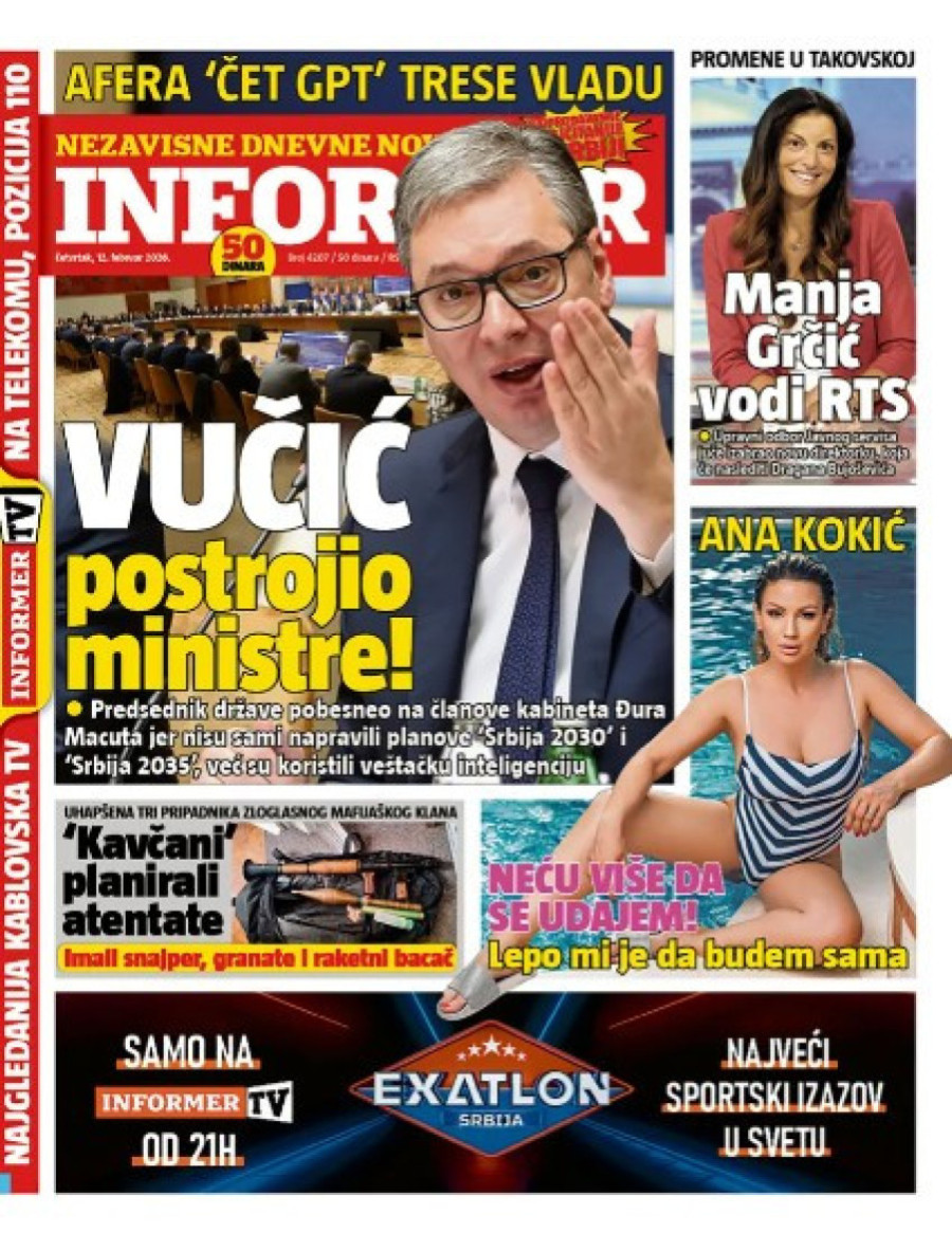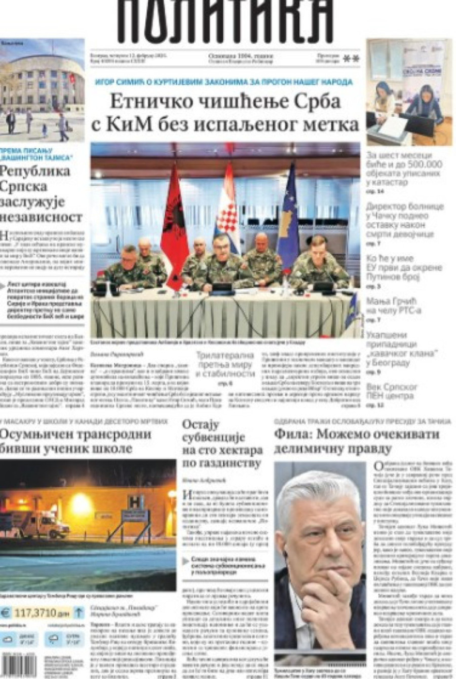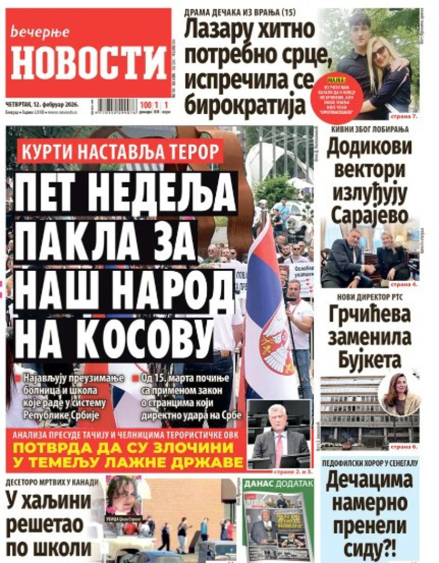 Dnevne novine u Srbiji za četvrtak, 12. februar 2026. godine na naslovnim stranama najavljuju brojne aktuelne društveno-političke teme.