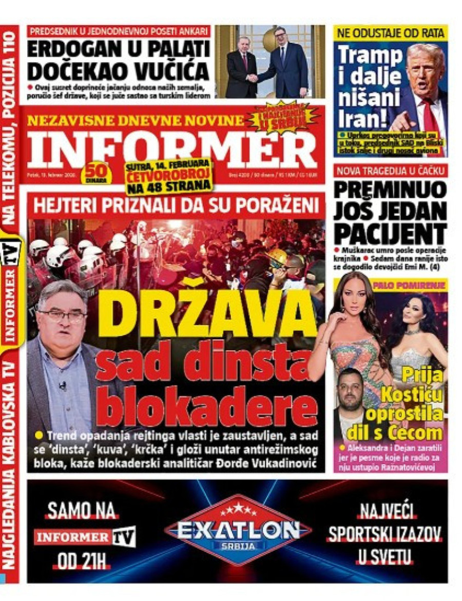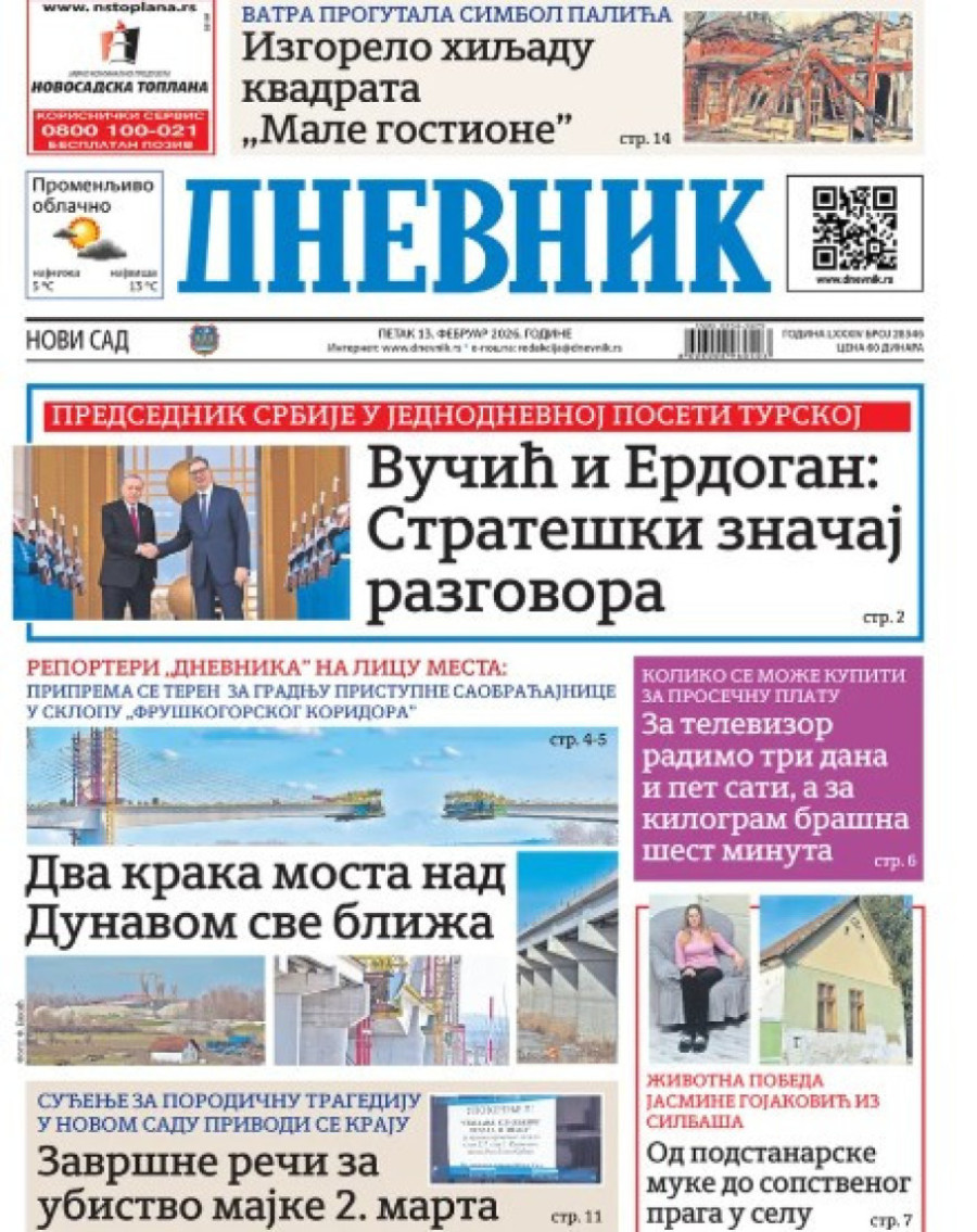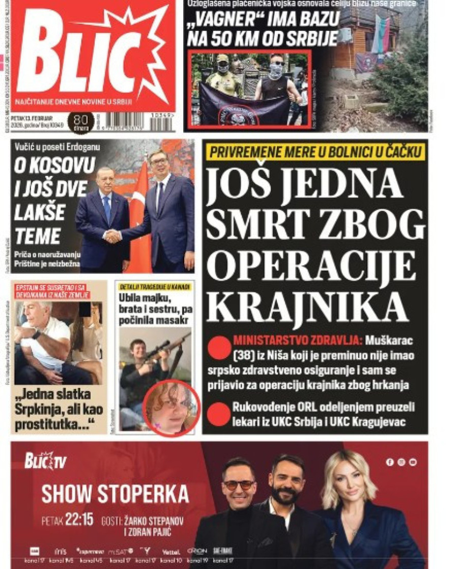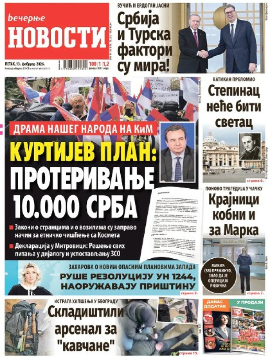Dnevne novine u Srbiji za petak 13. februar 2026. godine na naslovnim stranama najavljuju brojne aktuelne društveno-političke teme.