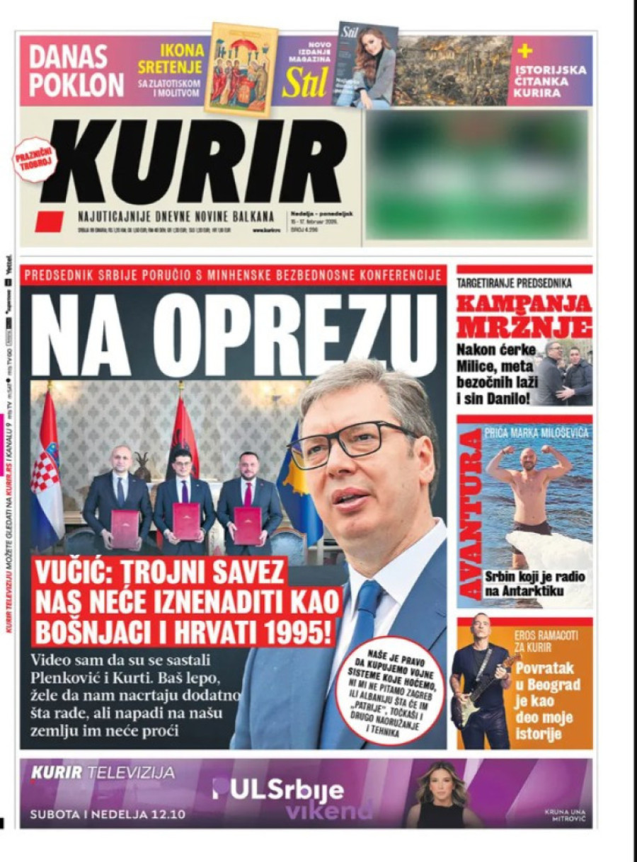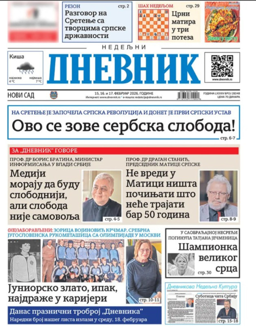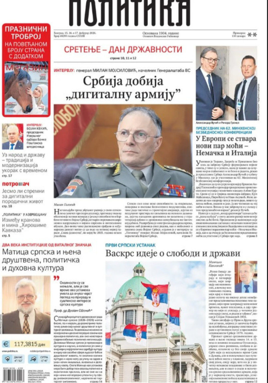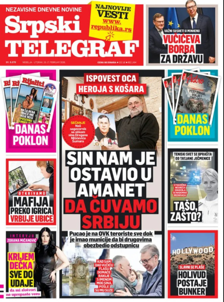 Dnevne novine u Srbiji za nedelju 15. februar 2026. godine na naslovnim stranama najavljuju brojne aktuelne društveno-političke teme.