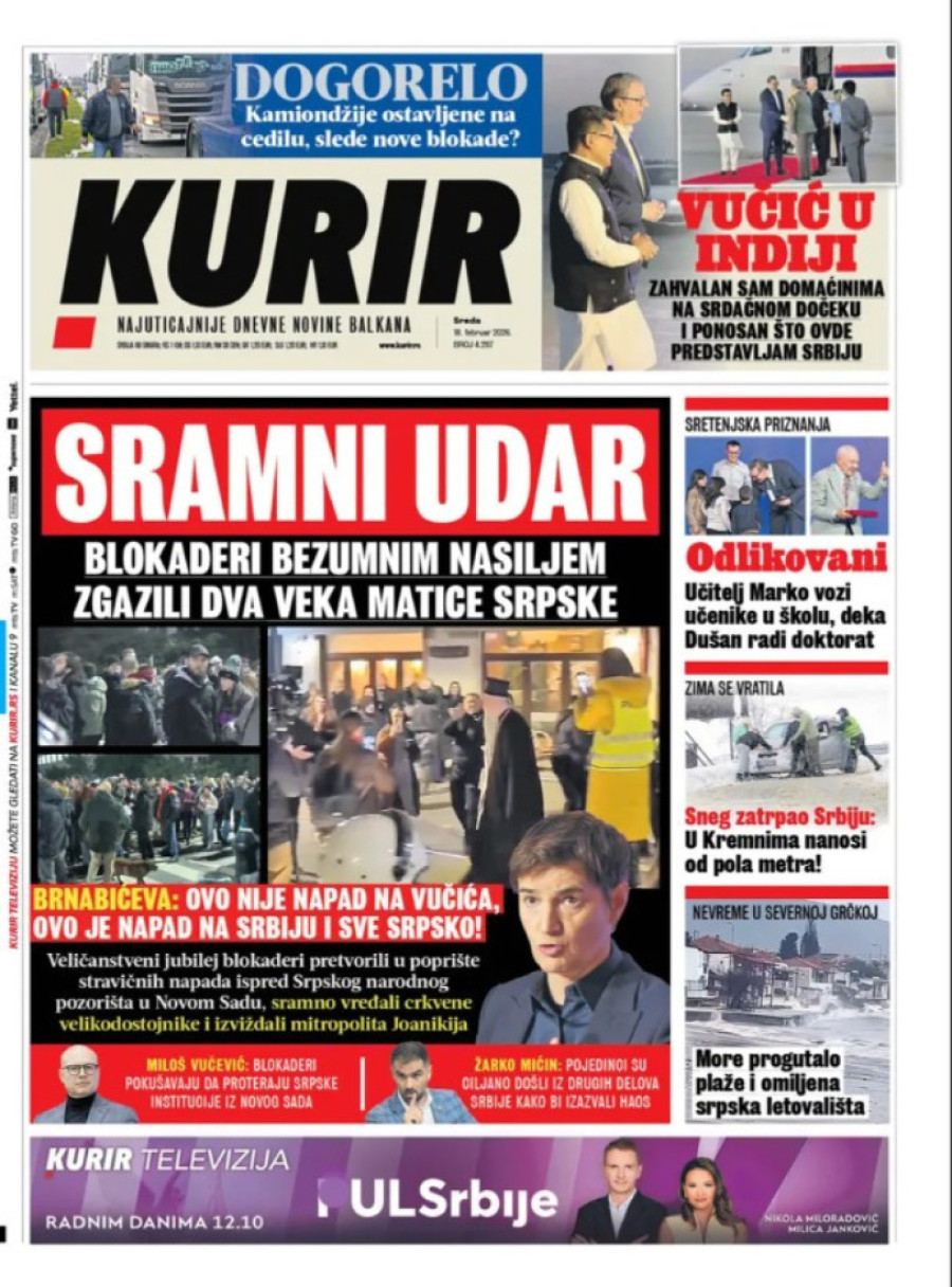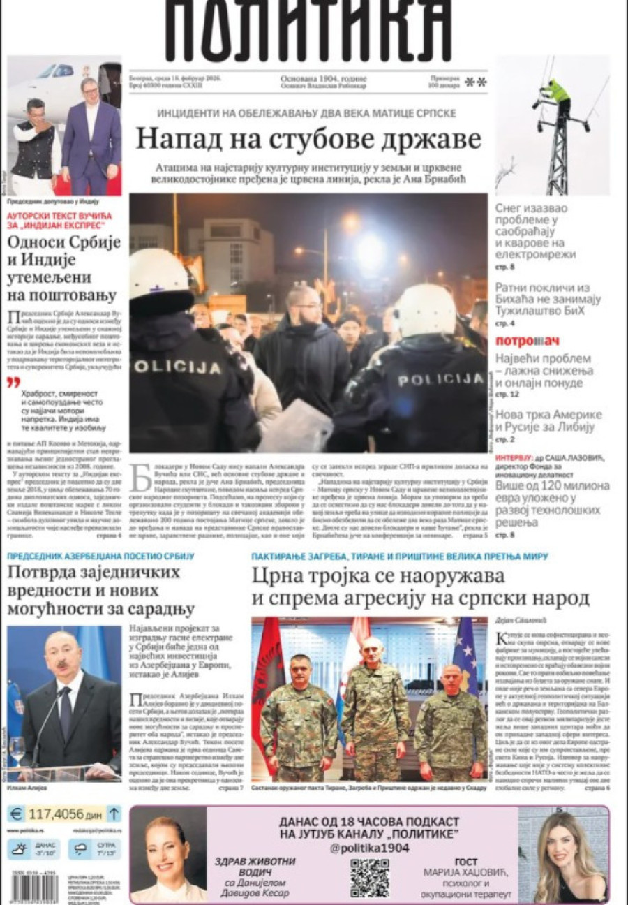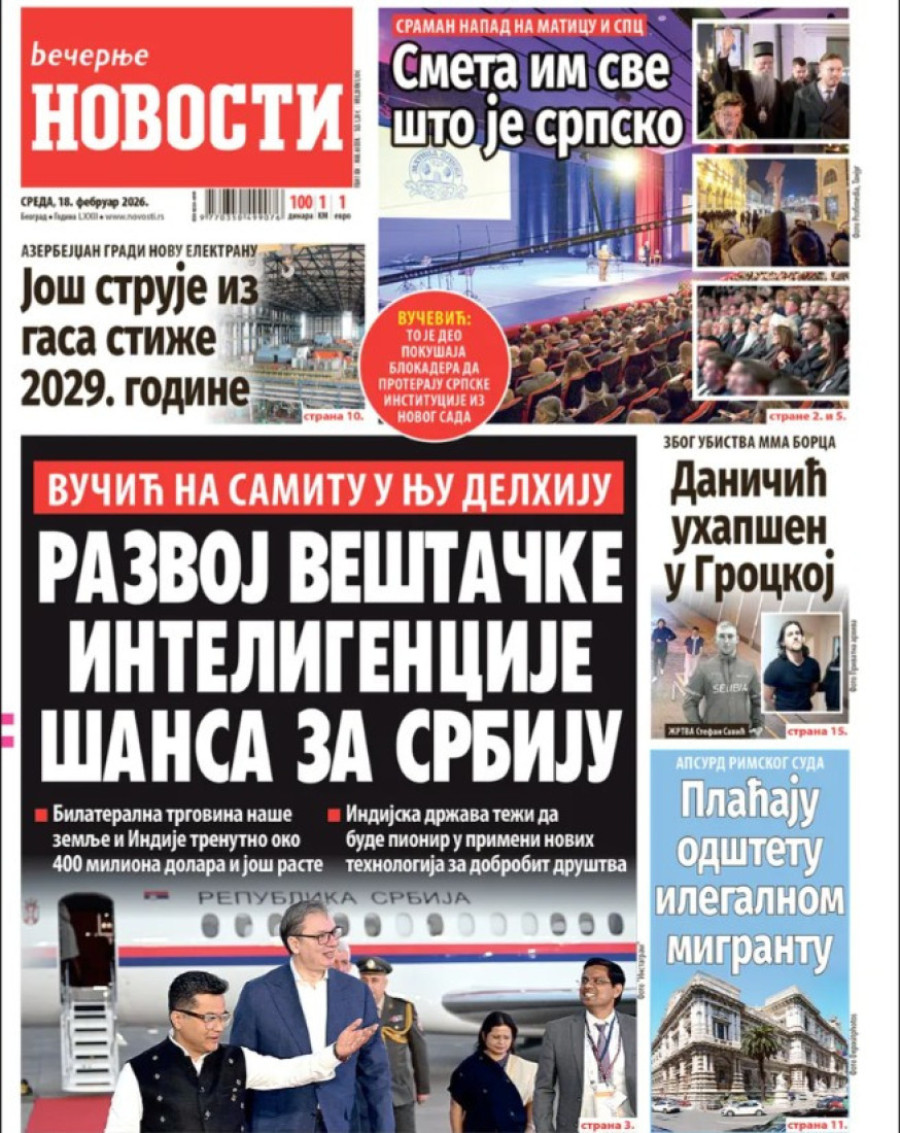 Dnevne novine u Srbiji za sredu 18. februar 2026. godine na naslovnim stranama najavljuju brojne aktuelne društveno-političke teme.