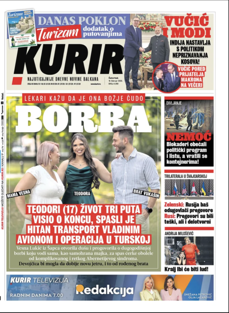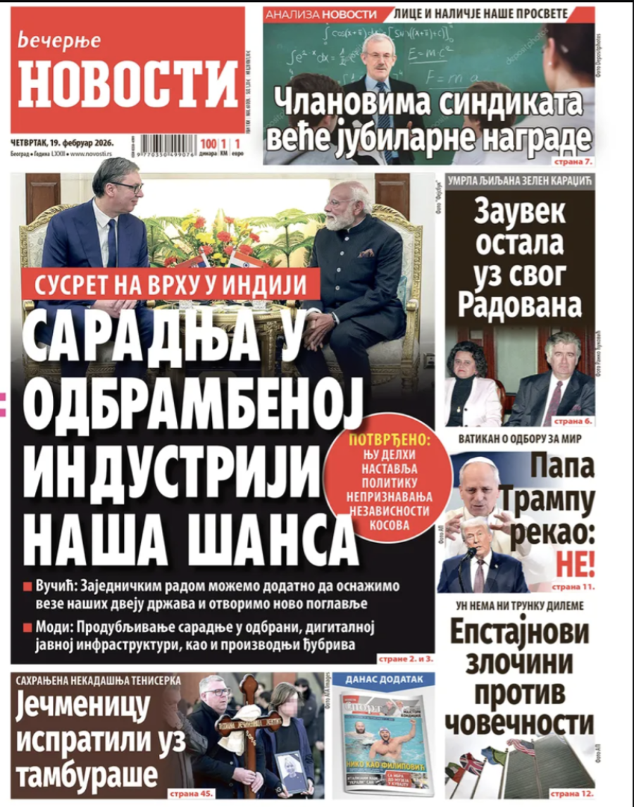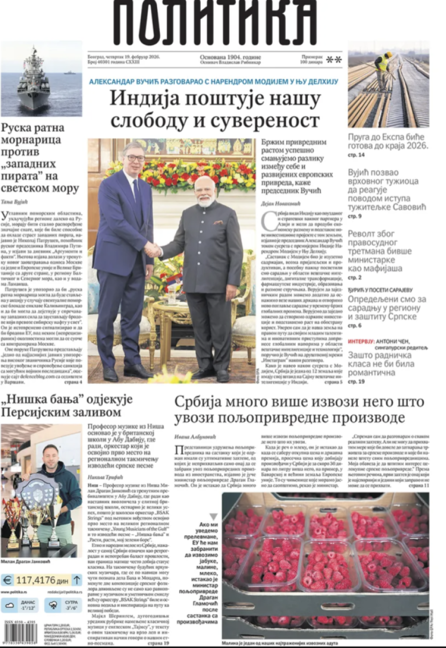 Naslovne strane dnevnih novina: Prelistavanje štampe za 19. februar 2026. godine