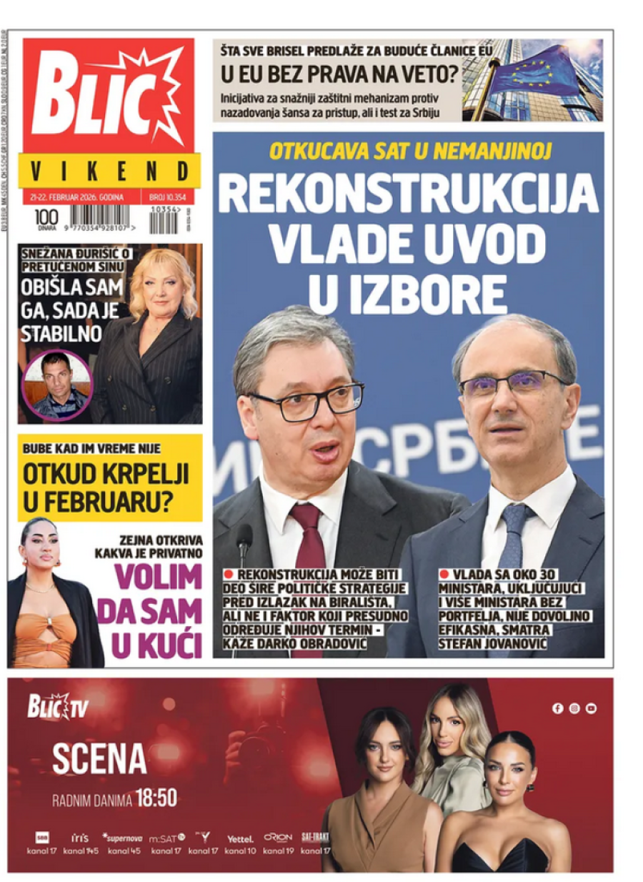 Dnevne novine u Srbiji za petak 21. februar 2026. godine na naslovnim stranama najavljuju brojne aktuelne društveno-političke teme.
