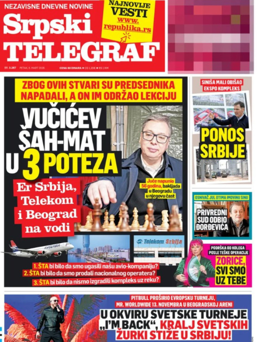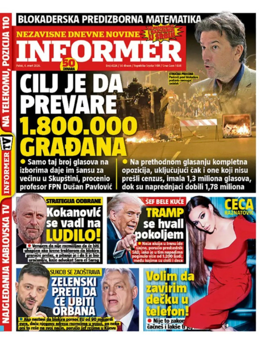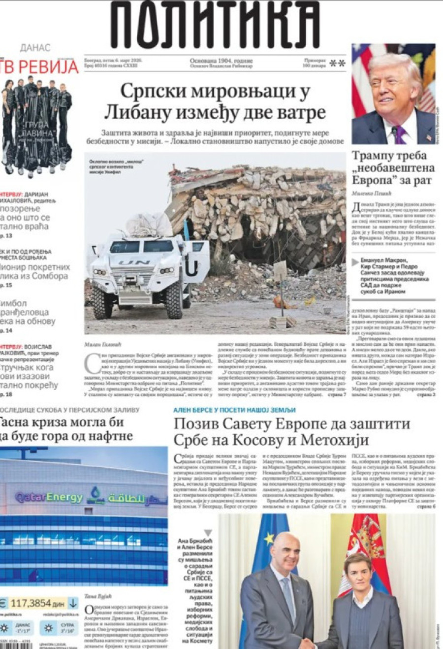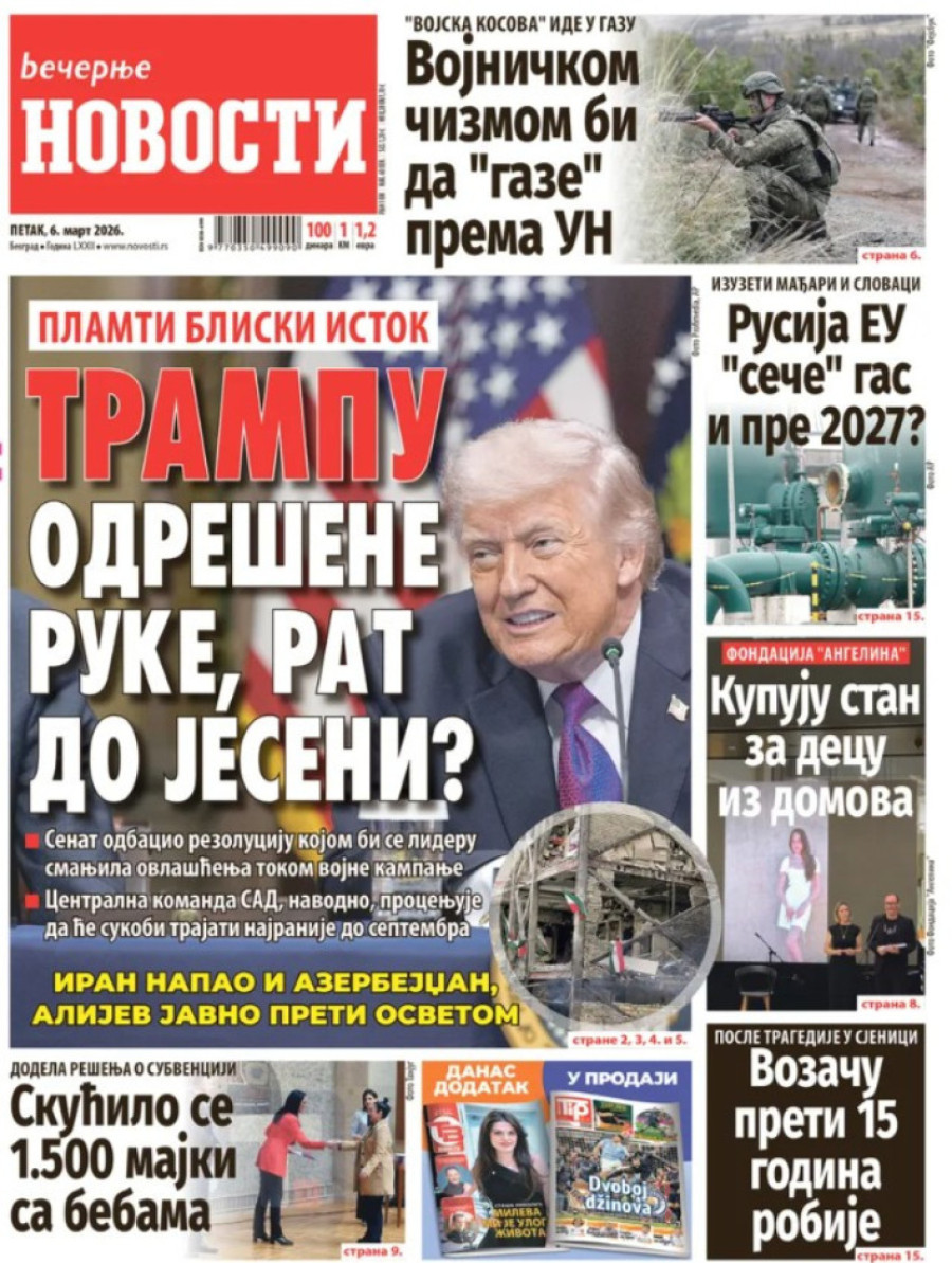 Dnevne novine u Srbiji za petak, 6. mart 2026. godine, na naslovnim stranama najavljuju brojne aktuelne društveno-političke teme.