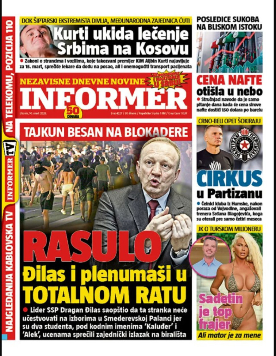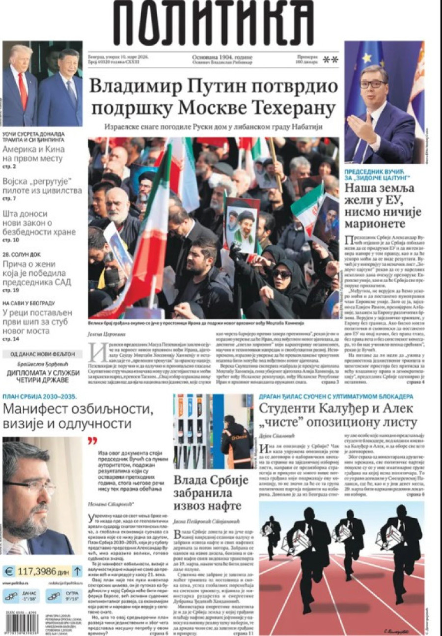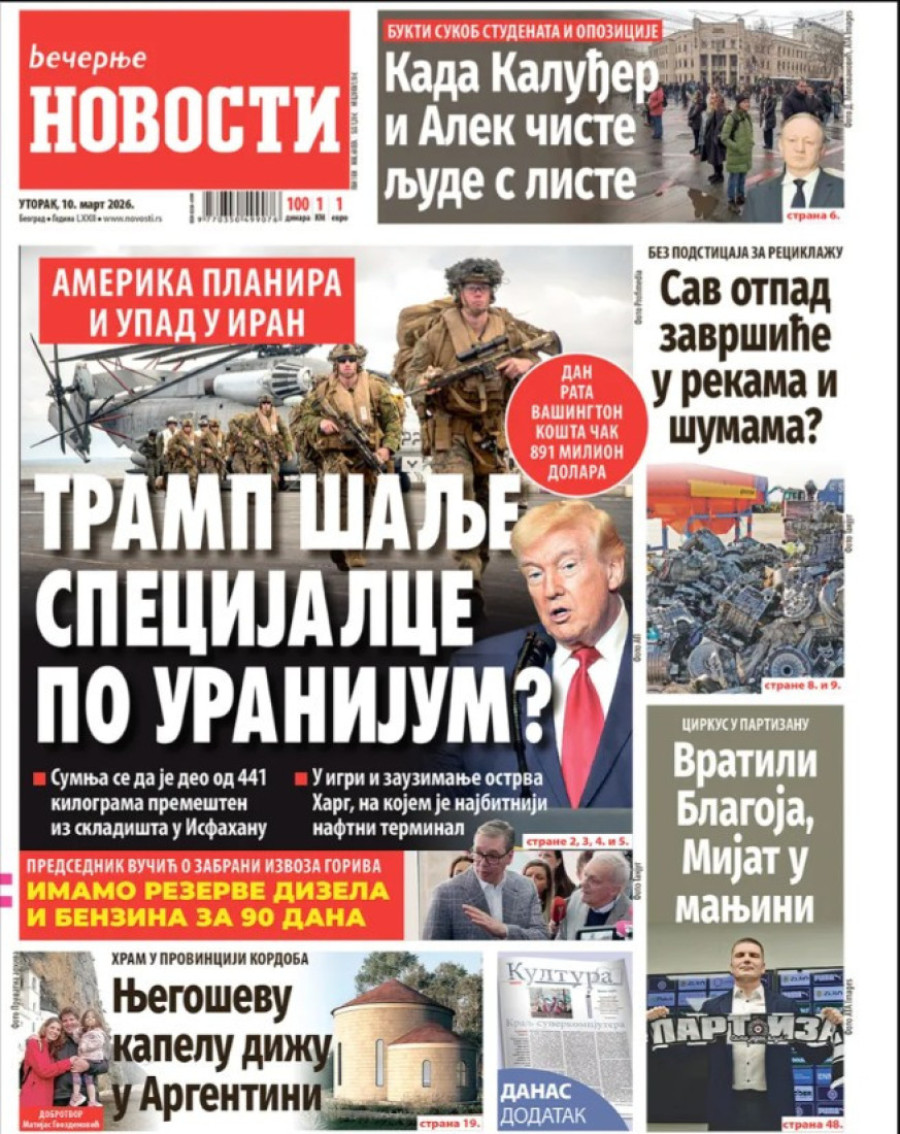 Dnevne novine u Srbiji za utorak, 10. mart 2026. godine, na naslovnim stranama najavljuju brojne aktuelne društveno-političke teme.