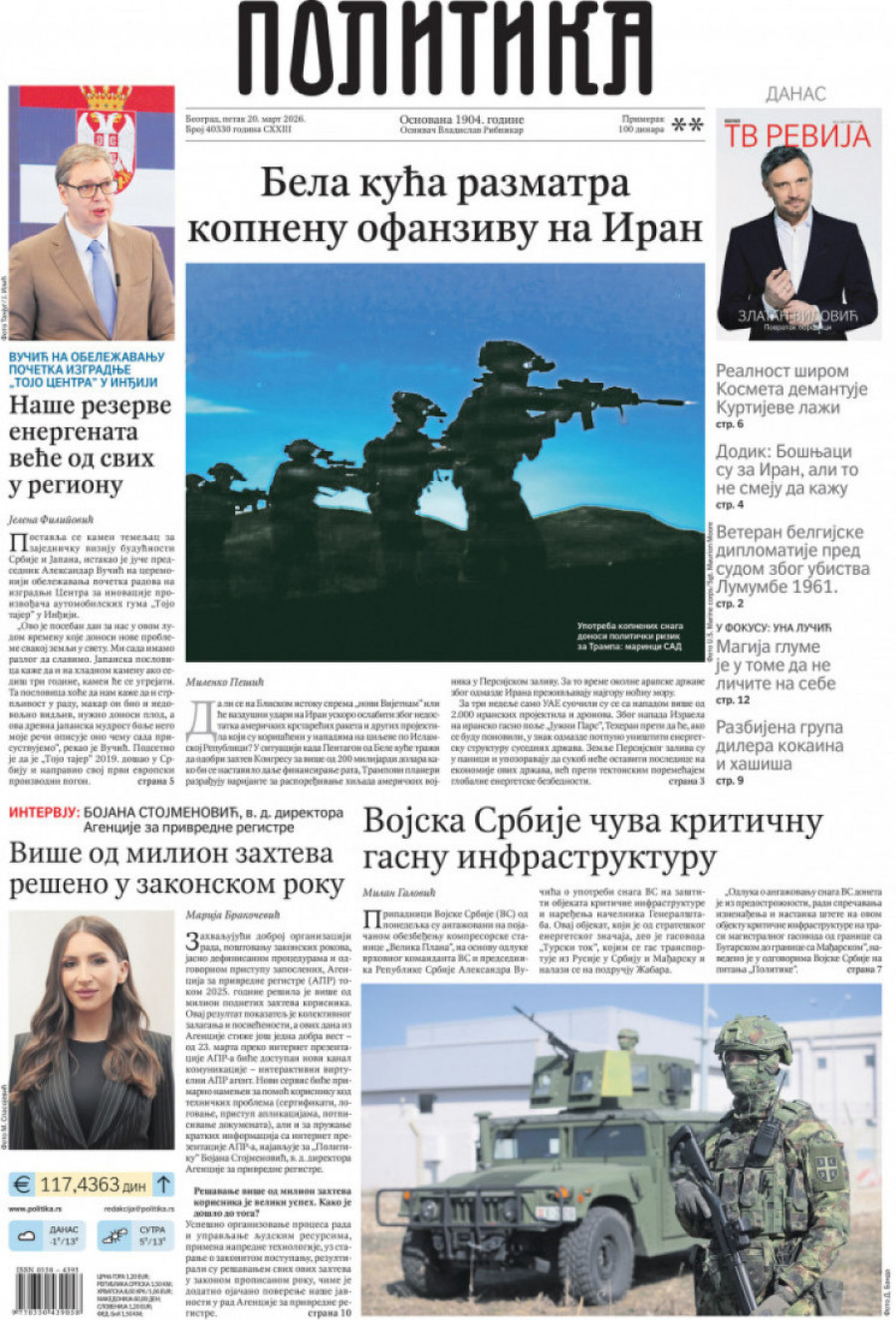 Naslovne strane dnevnih novina: Prelistavanje štampe za 20. mart 2026. godine