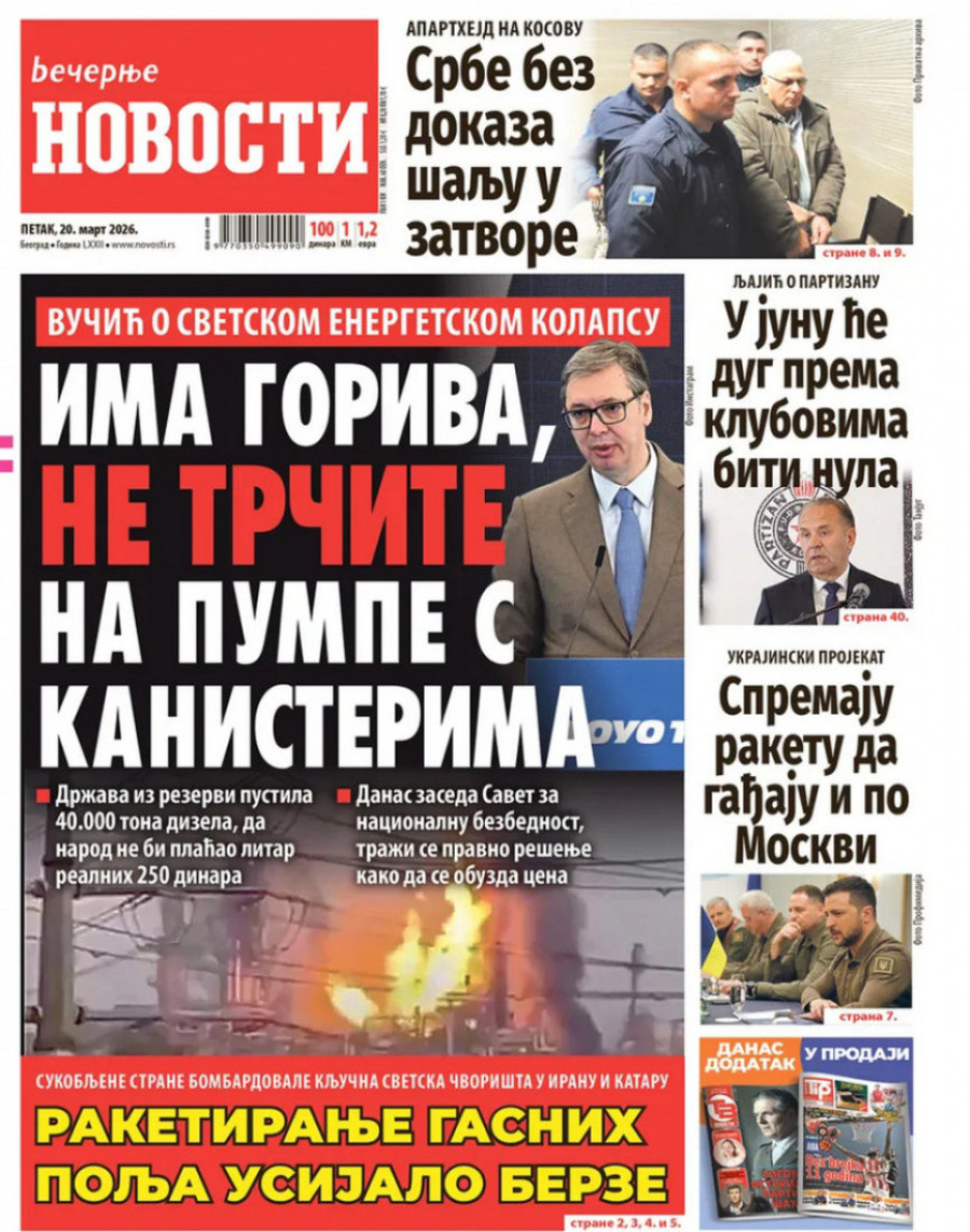 Dnevne novine u Srbiji za petak 20. mart 2026. godine, na naslovnim stranama najavljuju brojne aktuelne društveno-političke teme.