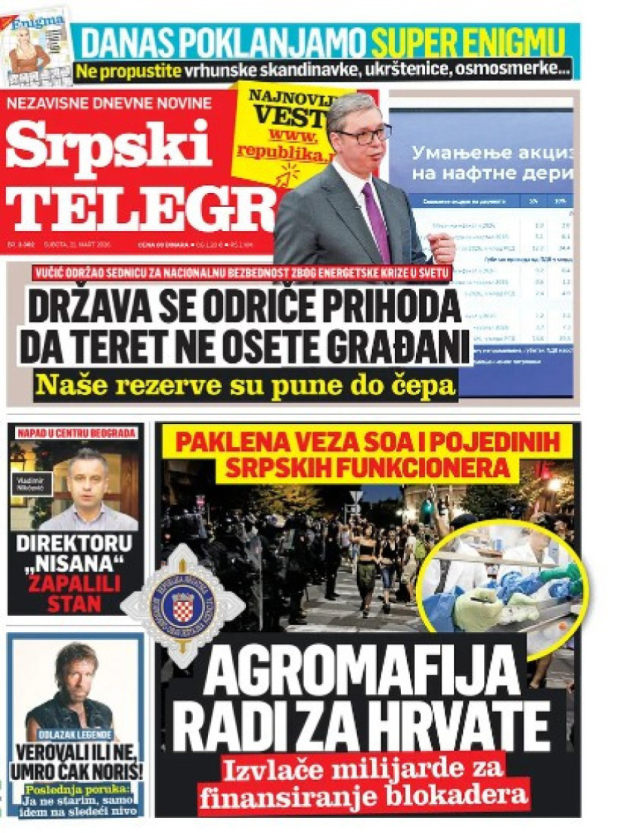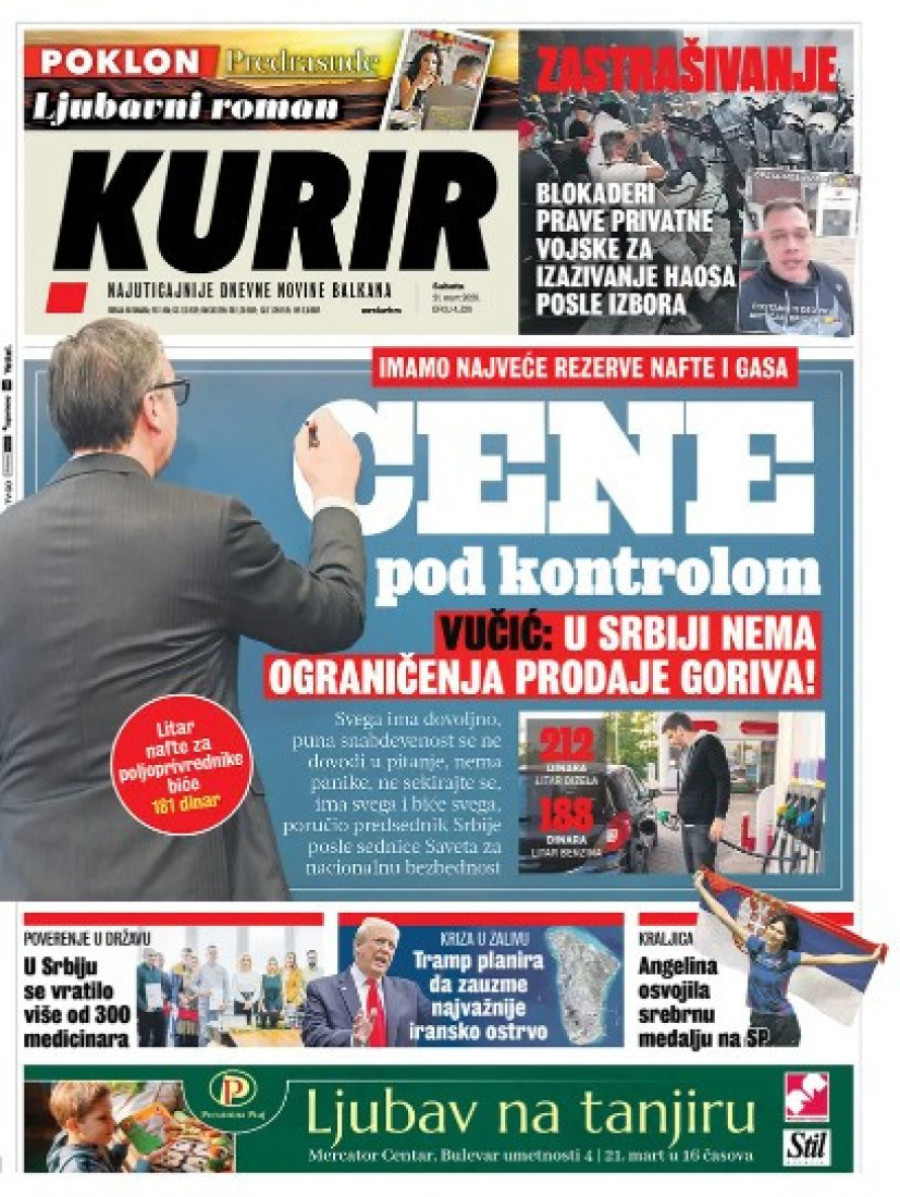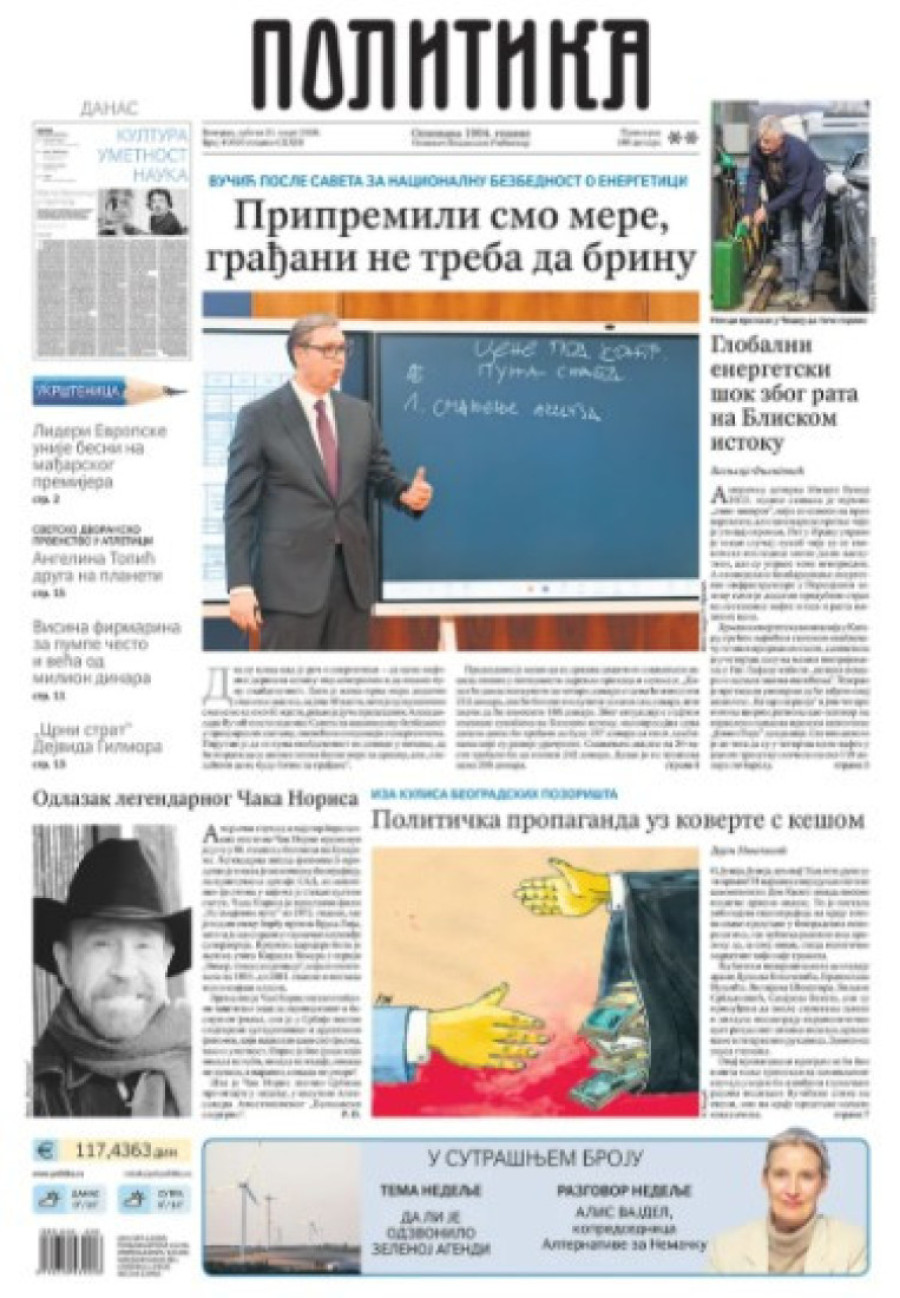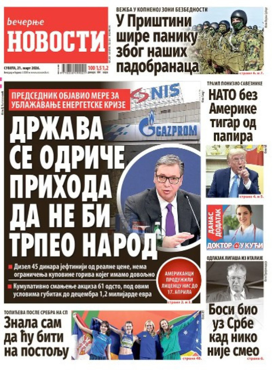 Dnevne novine u Srbiji za subotu 21. mart 2026. godine, na naslovnim stranama najavljuju brojne aktuelne društveno-političke teme.