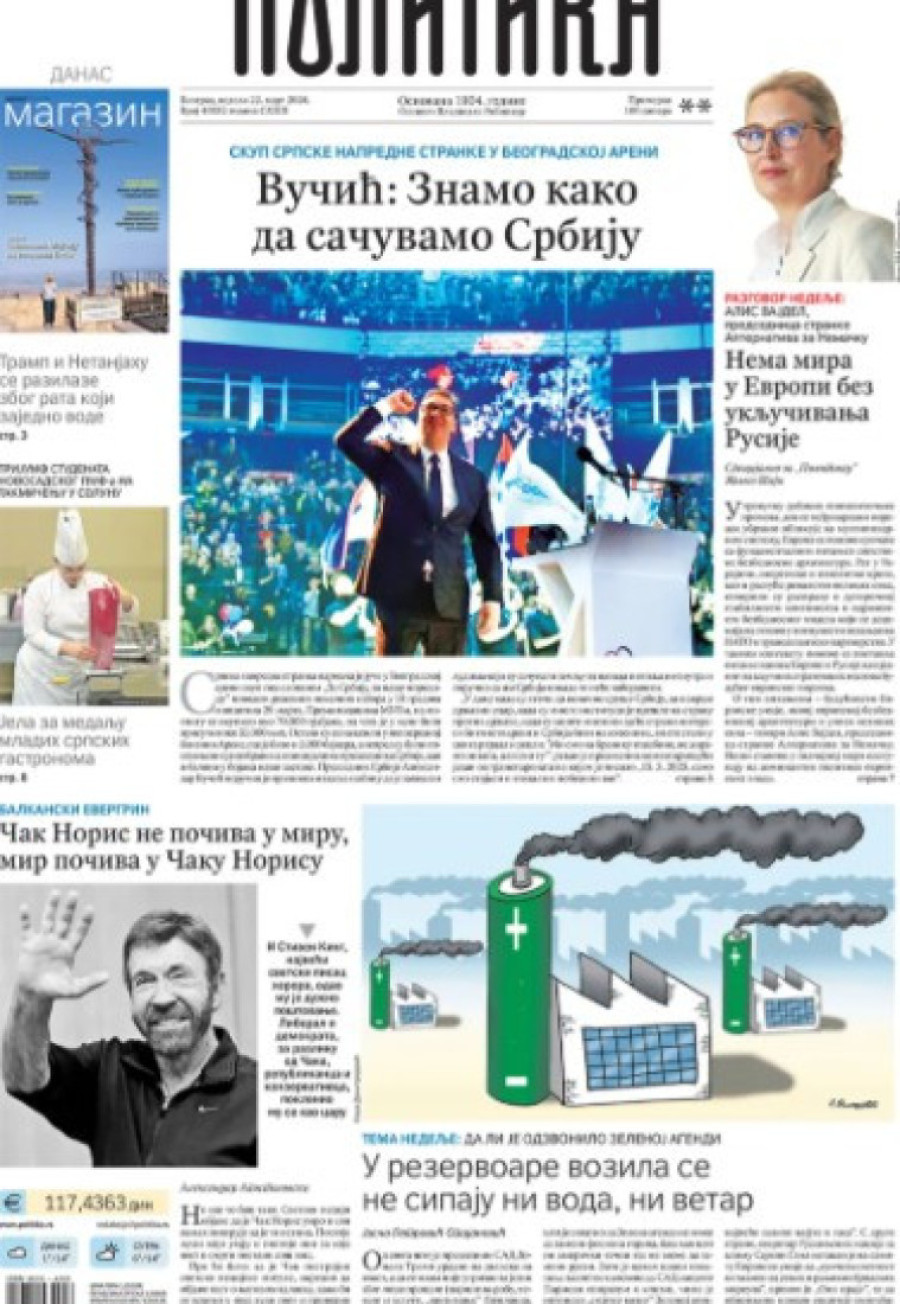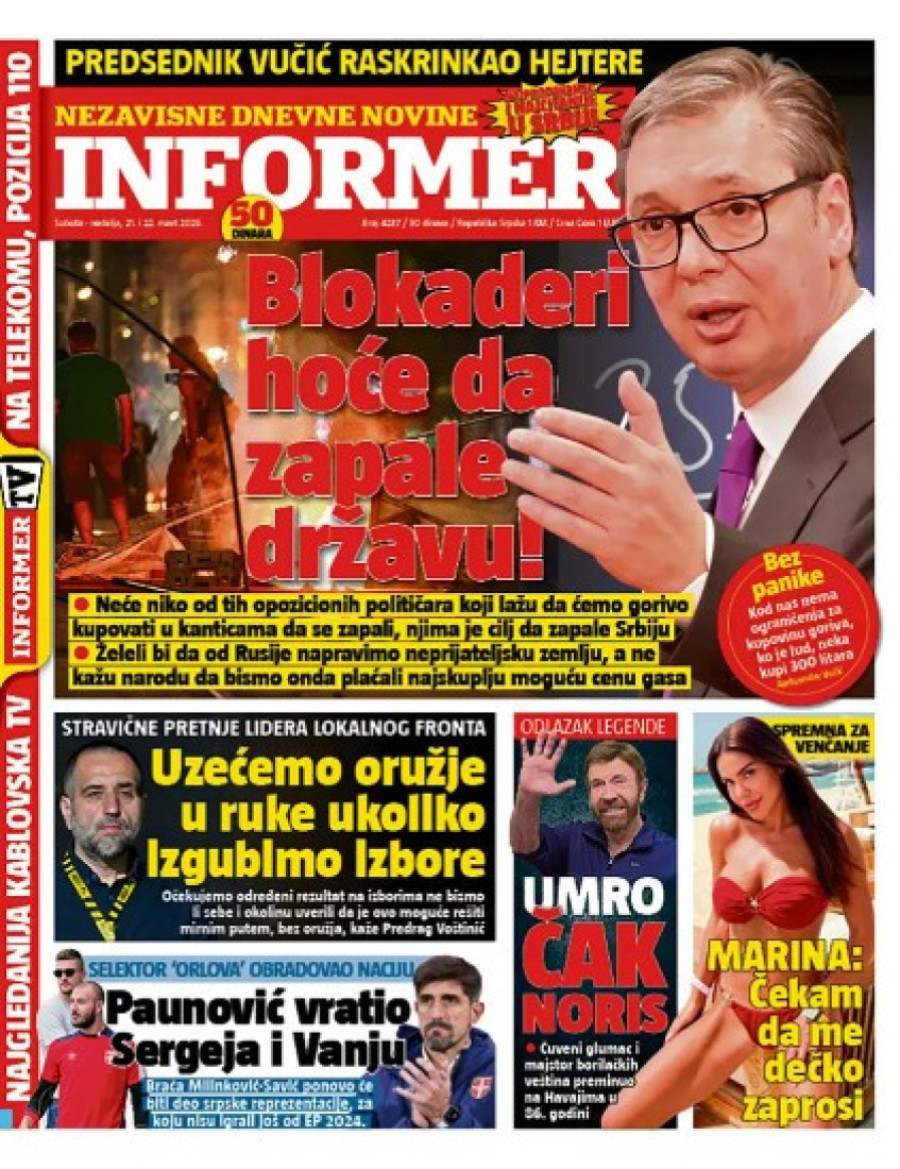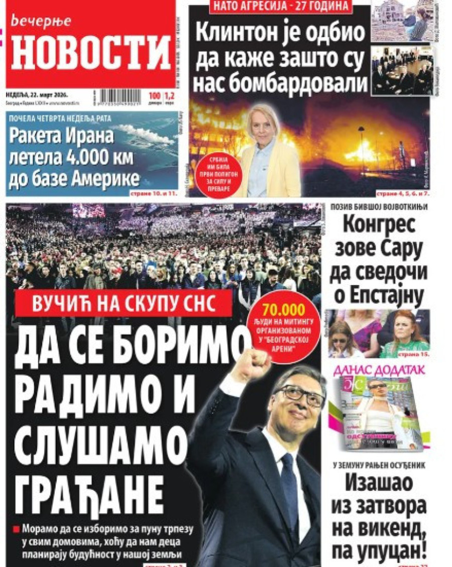 Dnevne novine u Srbiji za petak 20. mart 2026. godine, na naslovnim stranama najavljuju brojne aktuelne društveno-političke teme.