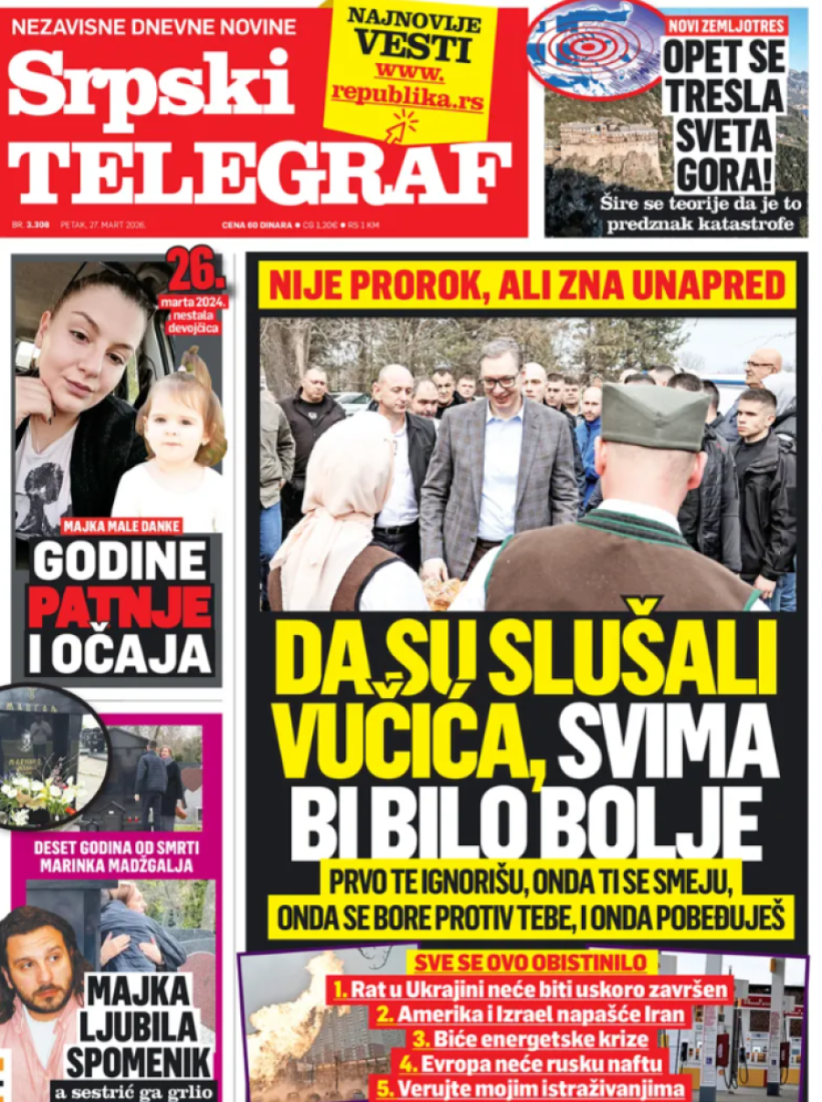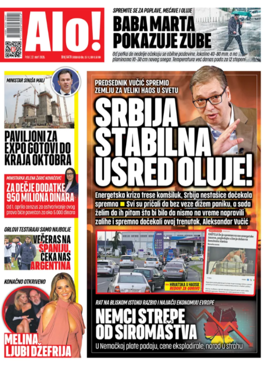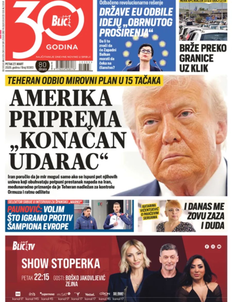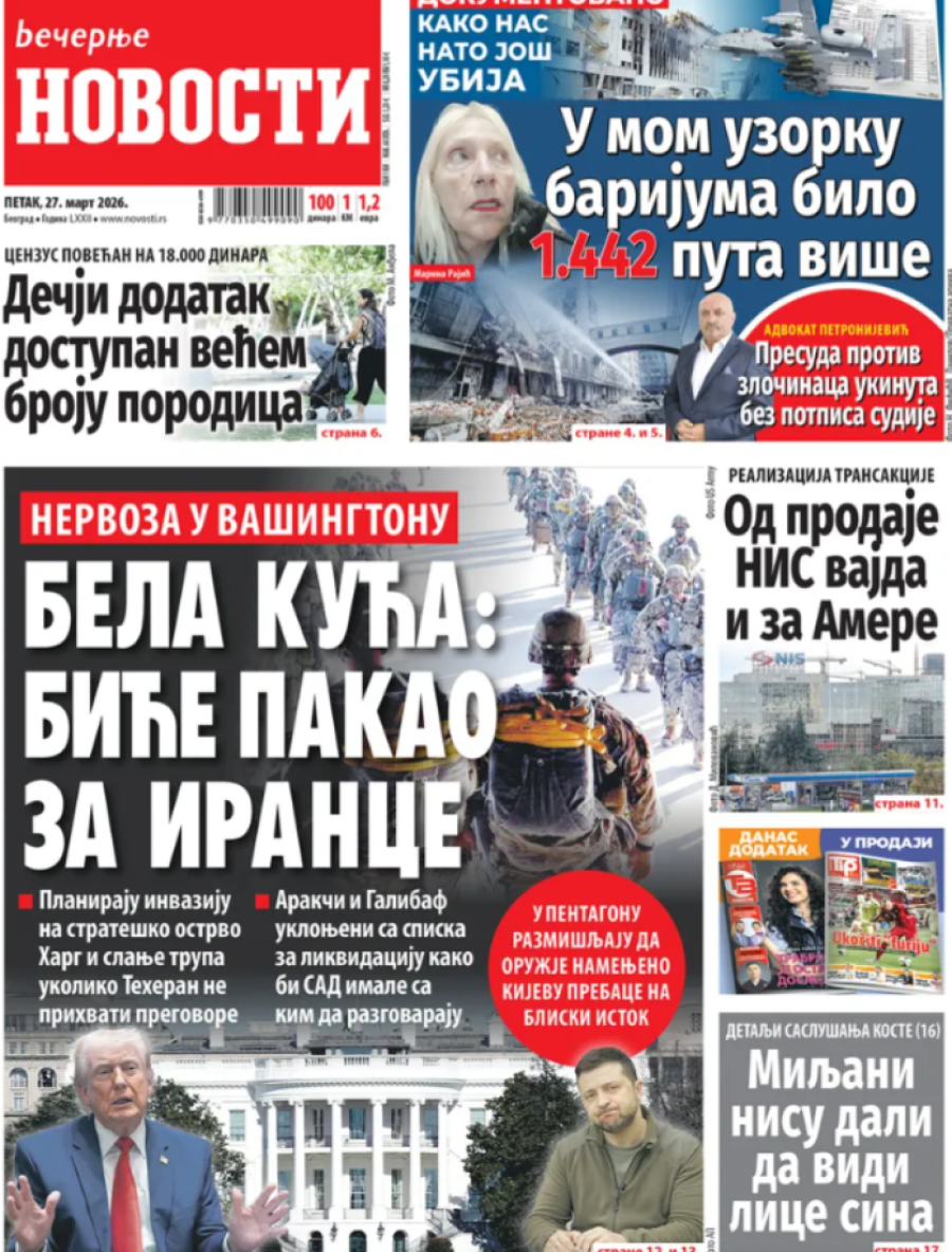 Dnevne novine u Srbiji za petak 27. mart 2026. godine, na naslovnim stranama najavljuju brojne aktuelne društveno-političke teme.