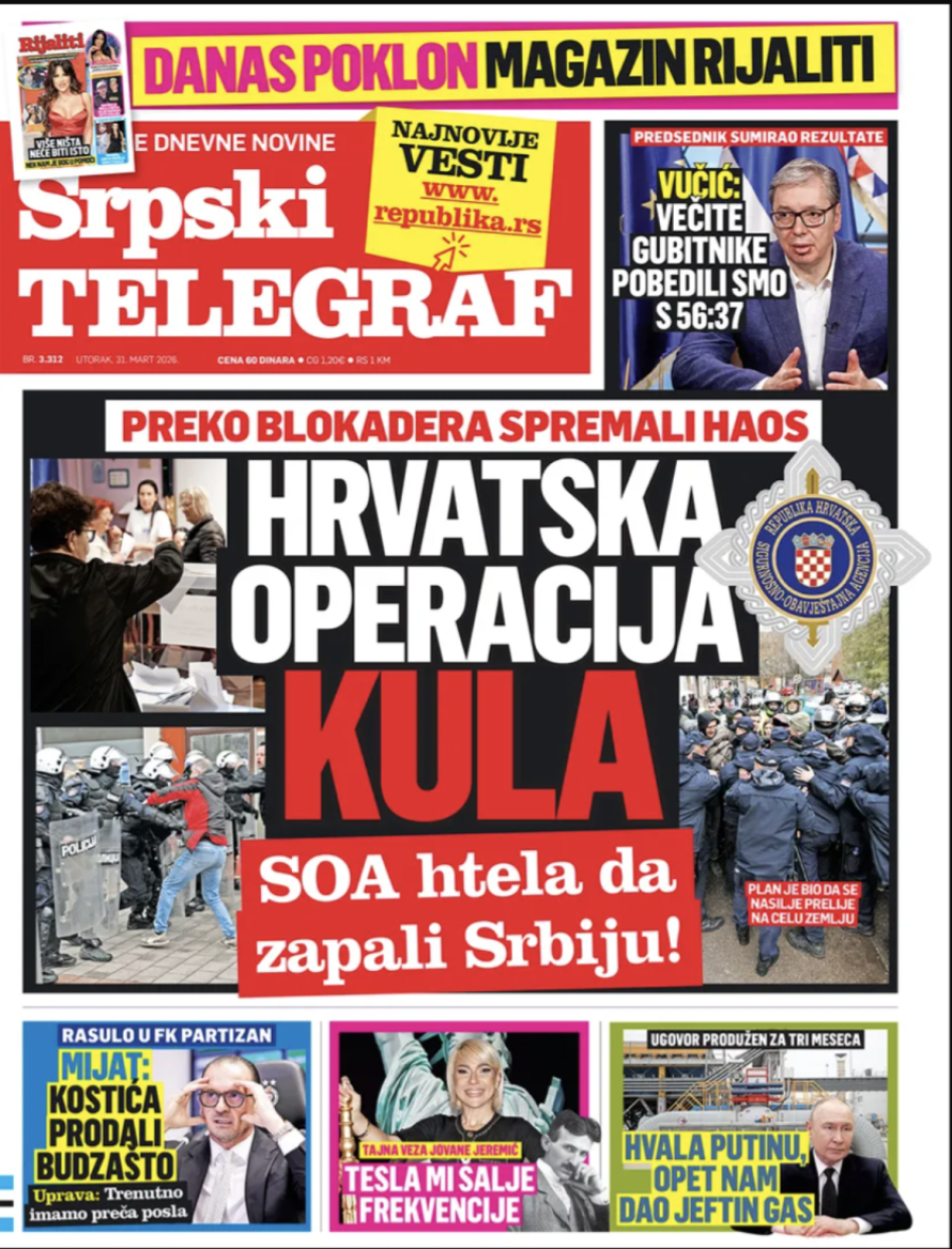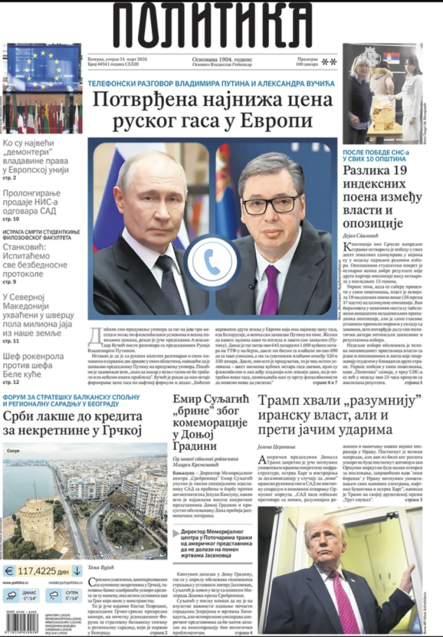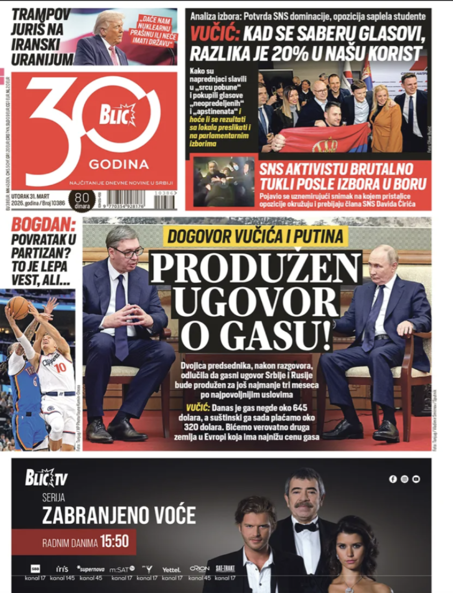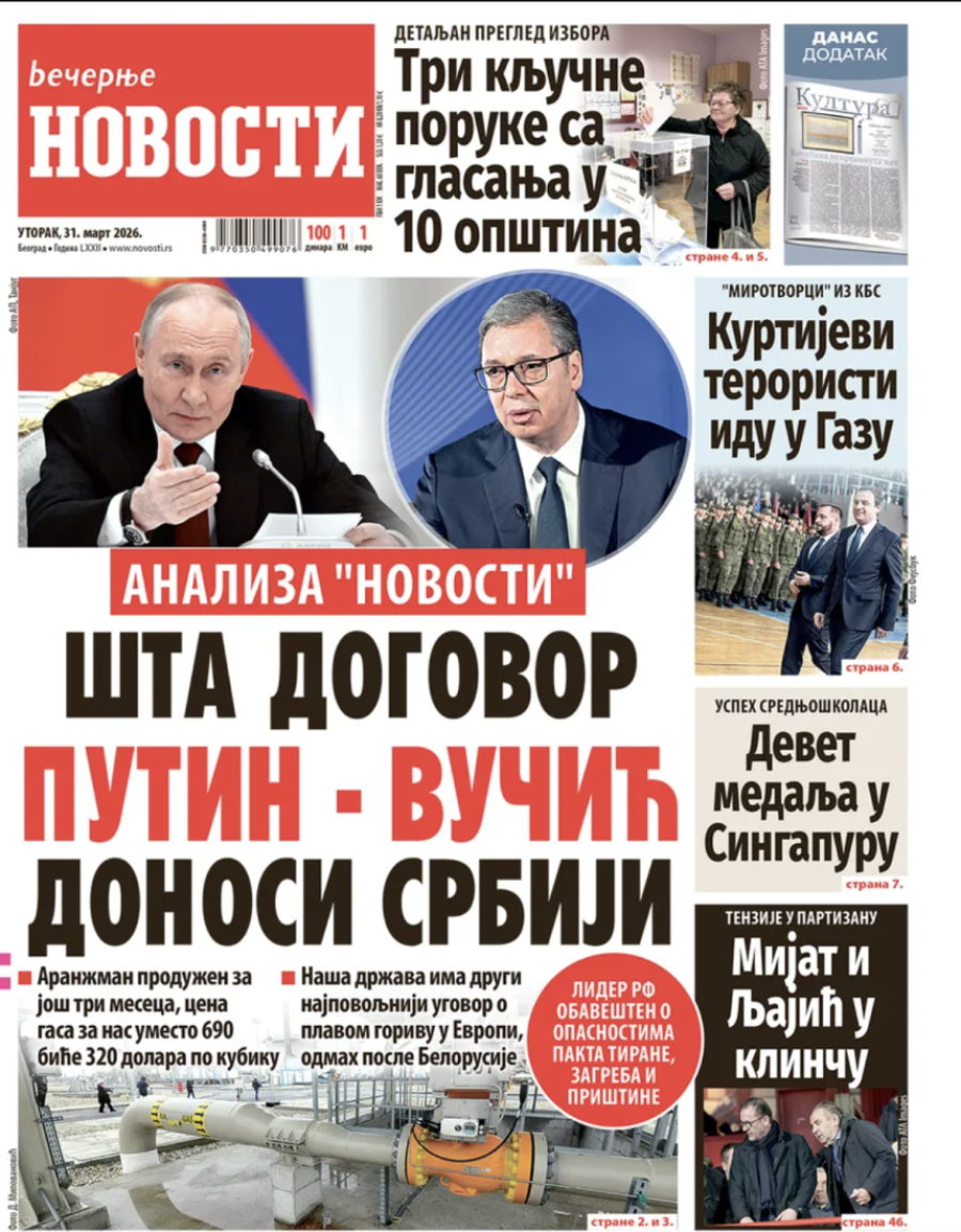 Dnevne novine u Srbiji za utorak 31. mart 2026. godine, na naslovnim stranama najavljuju brojne aktuelne društveno-političke teme.