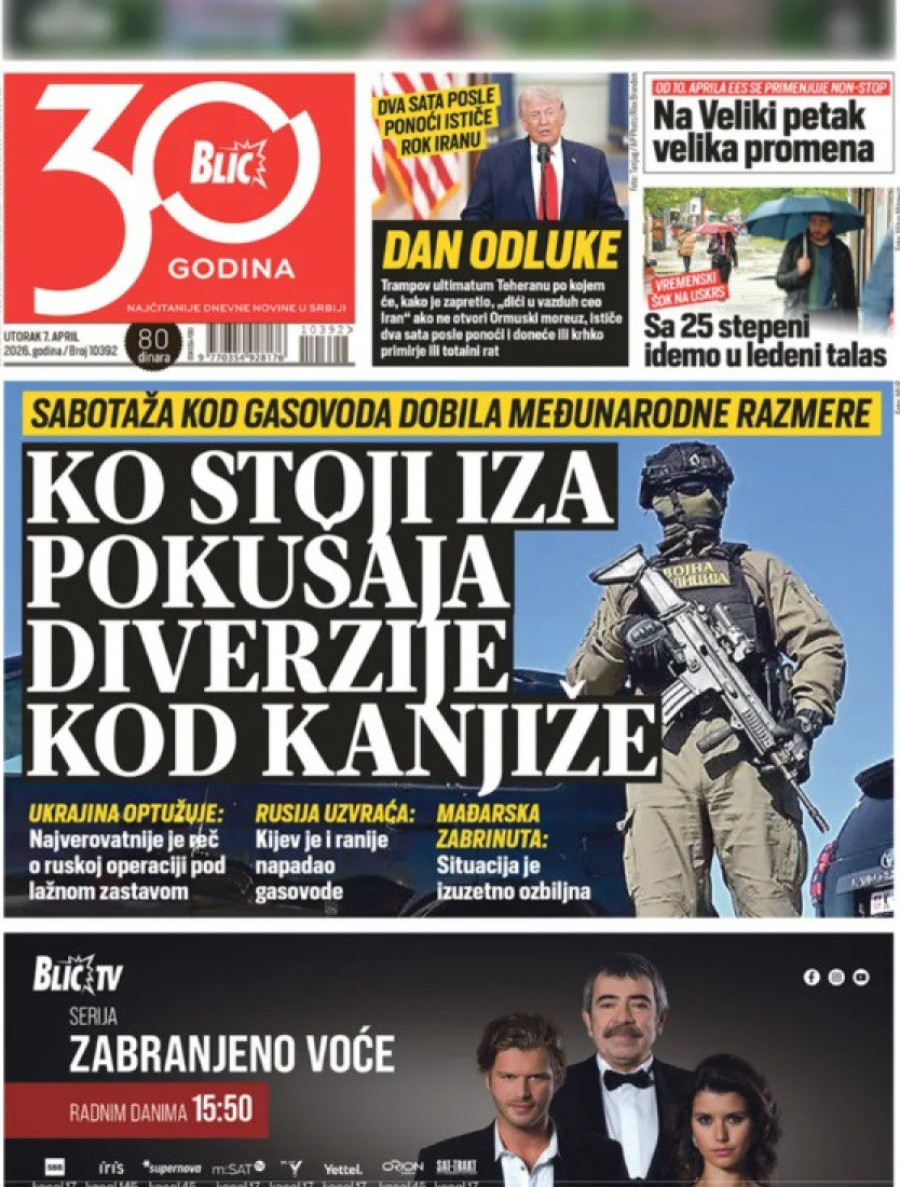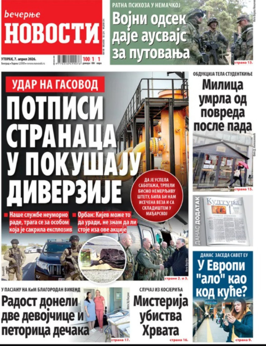 Dnevne novine u Srbiji za utorak 7. april 2026. godine, na naslovnim stranama najavljuju brojne aktuelne društveno-političke teme.