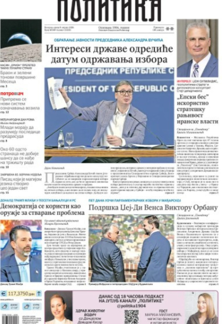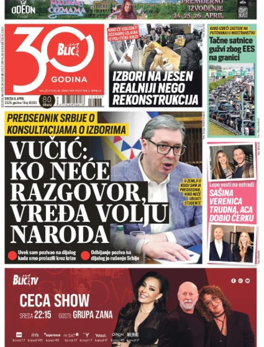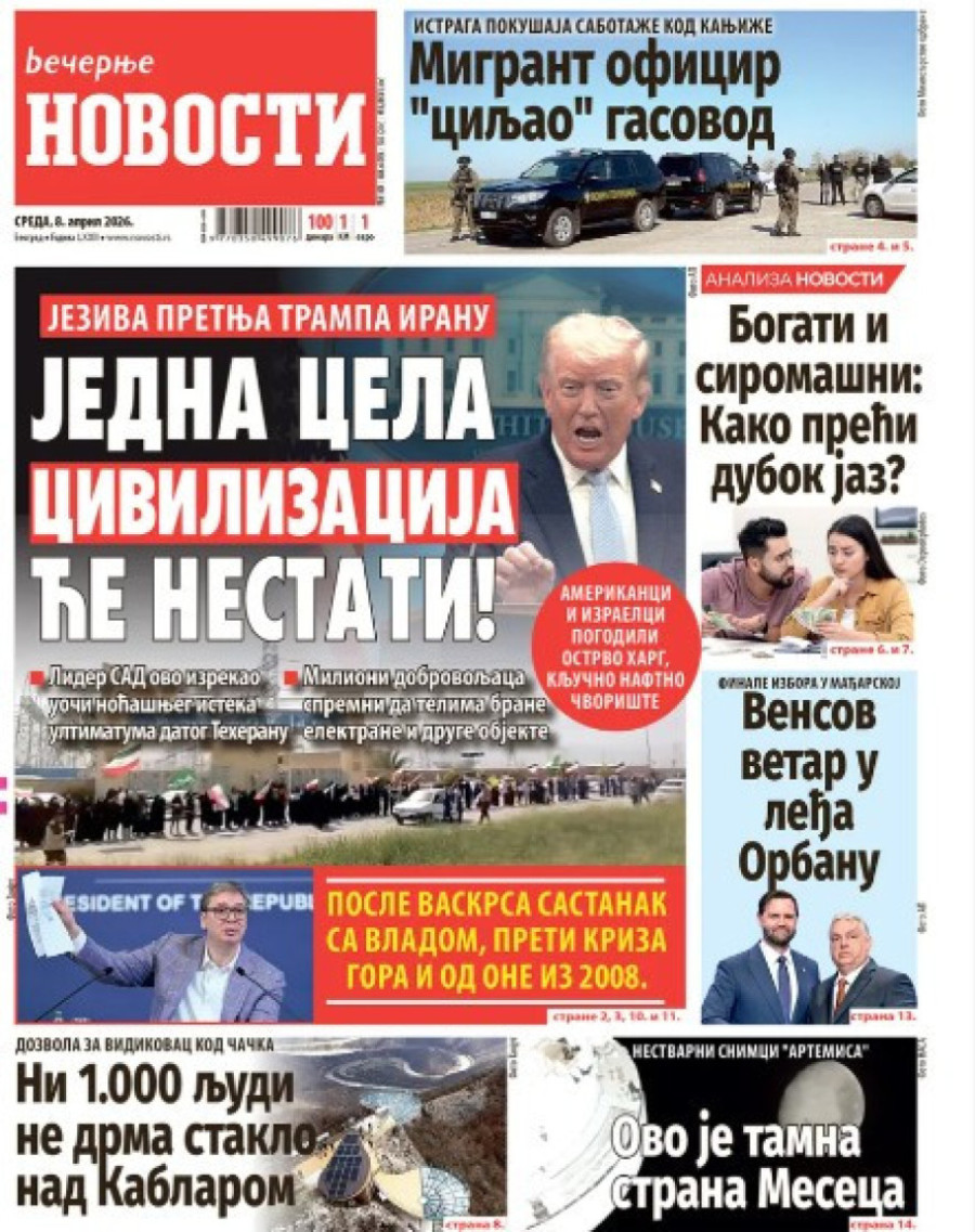 Dnevne novine u Srbiji za sredu, 8. april 2026. godine, na naslovnim stranama najavljuju brojne aktuelne društveno-političke teme.