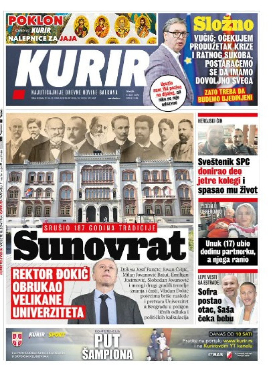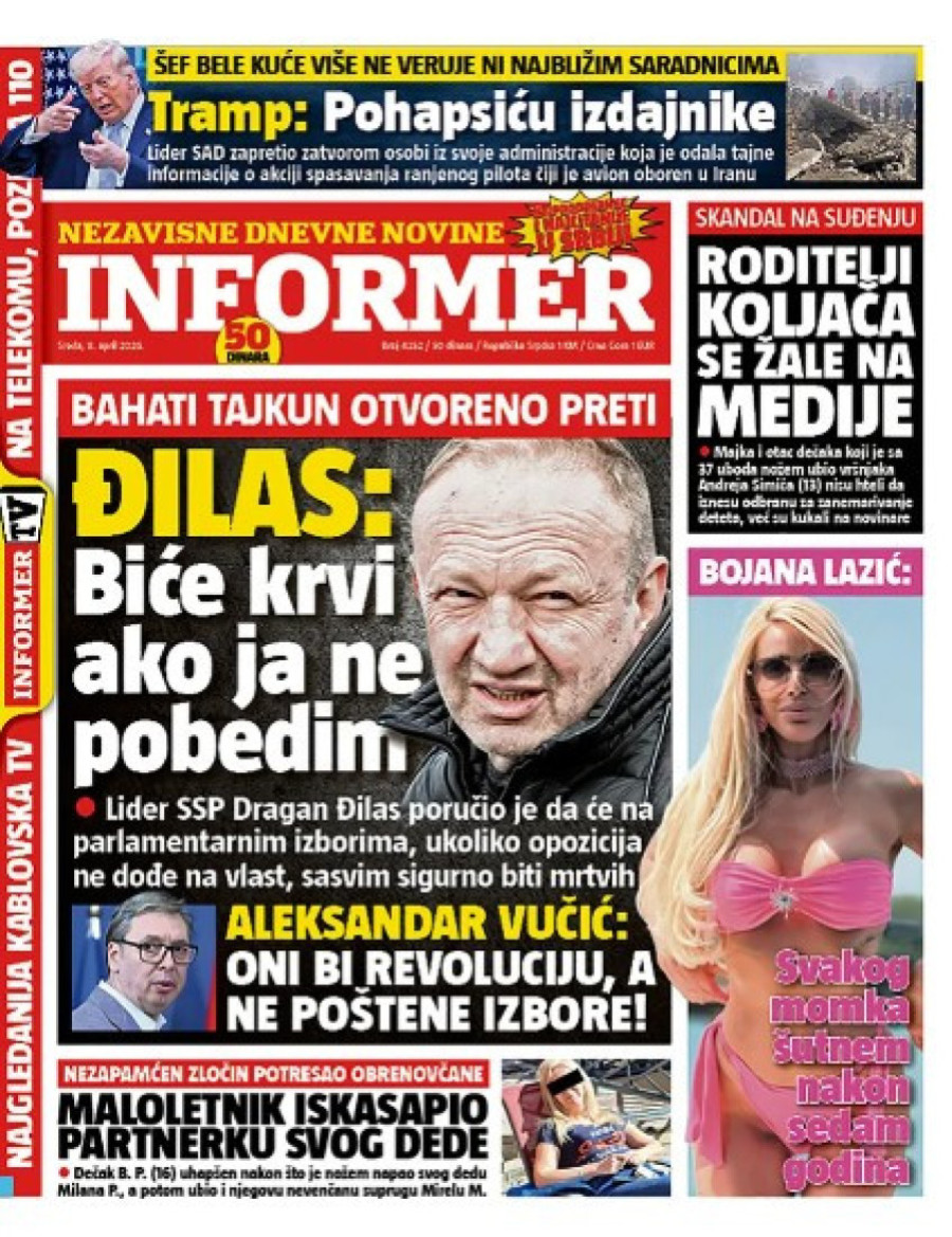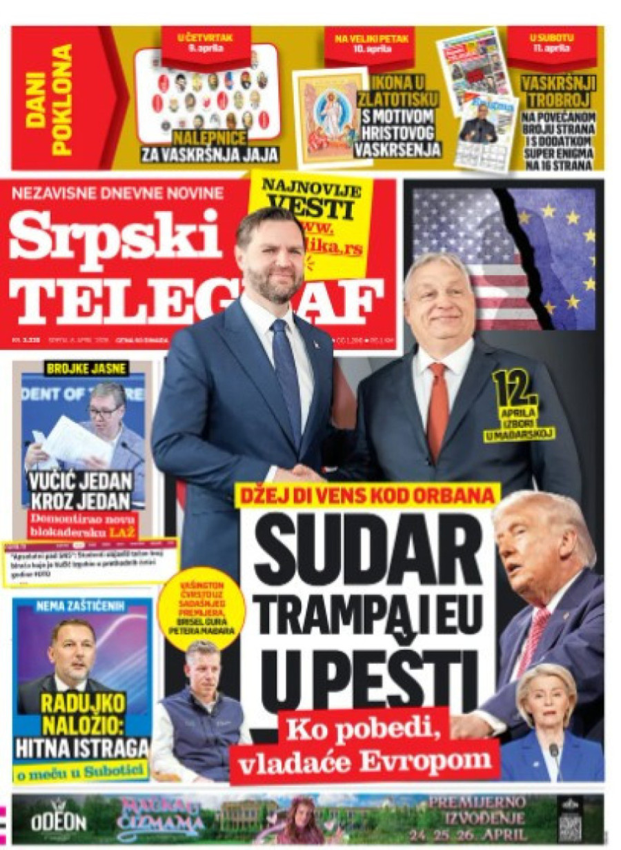 Dnevne novine u Srbiji za sredu, 8. april 2026. godine, na naslovnim stranama najavljuju brojne aktuelne društveno-političke teme.