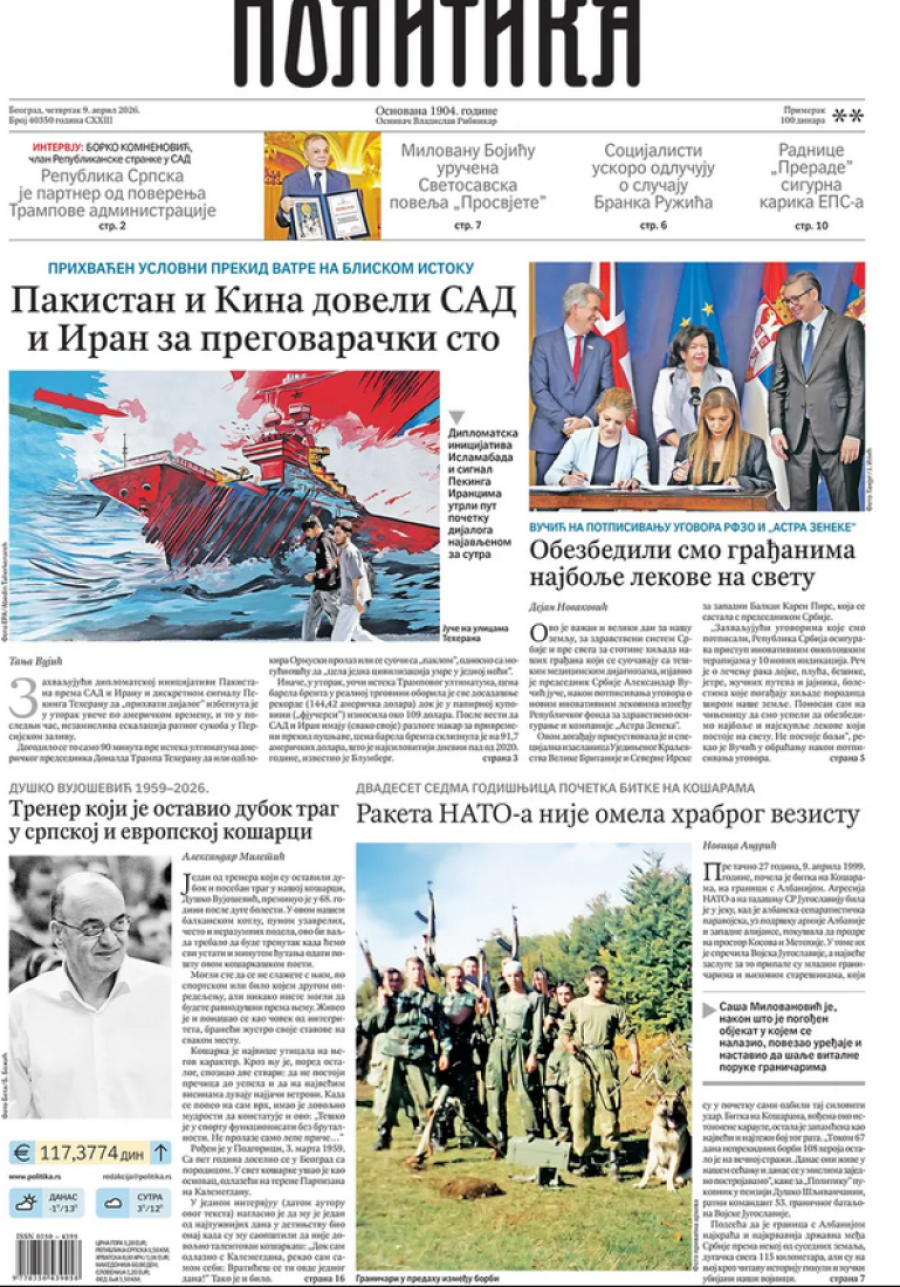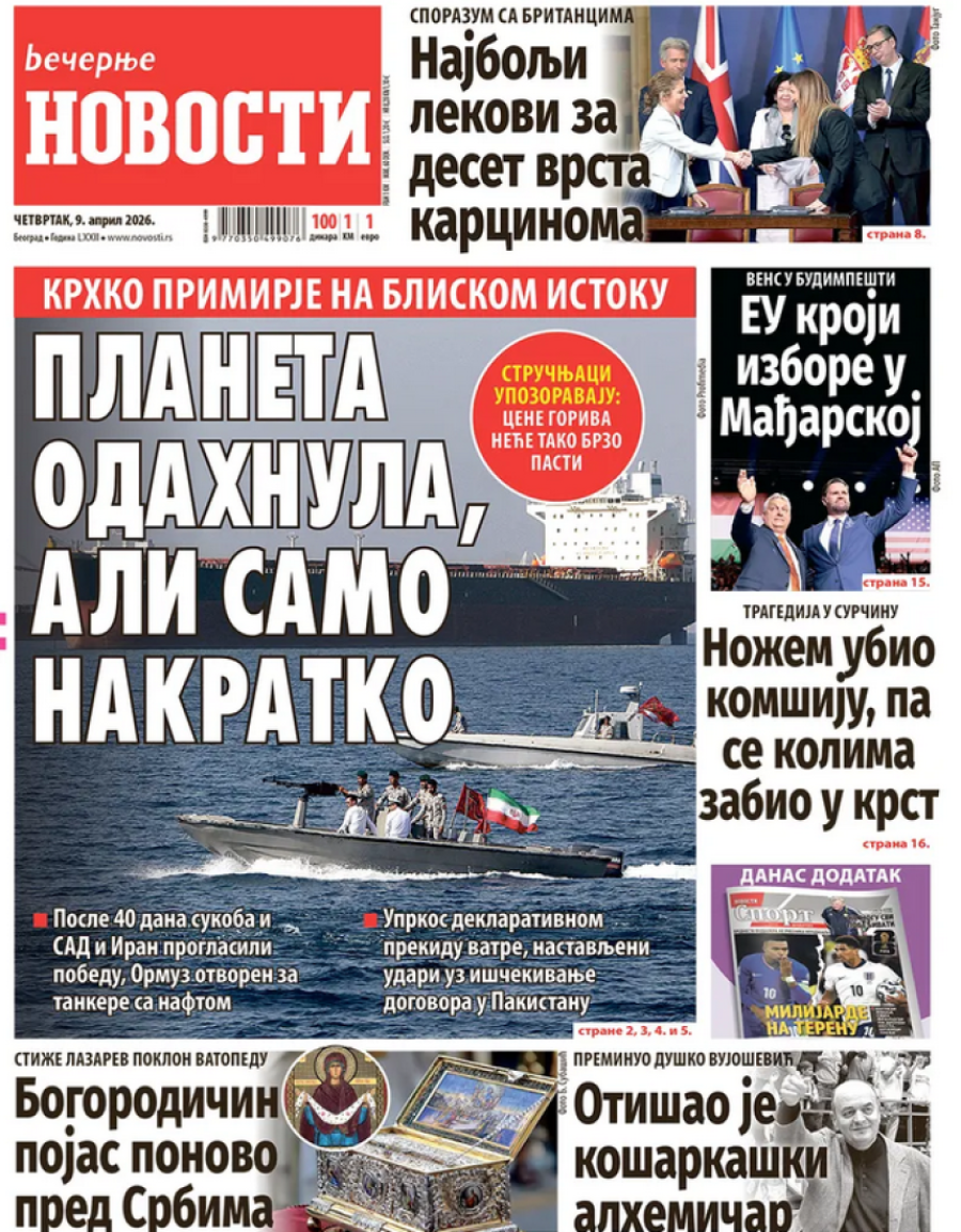 Naslovne strane dnevnih novina: Prelistavanje štampe za 9. april 2026. godine