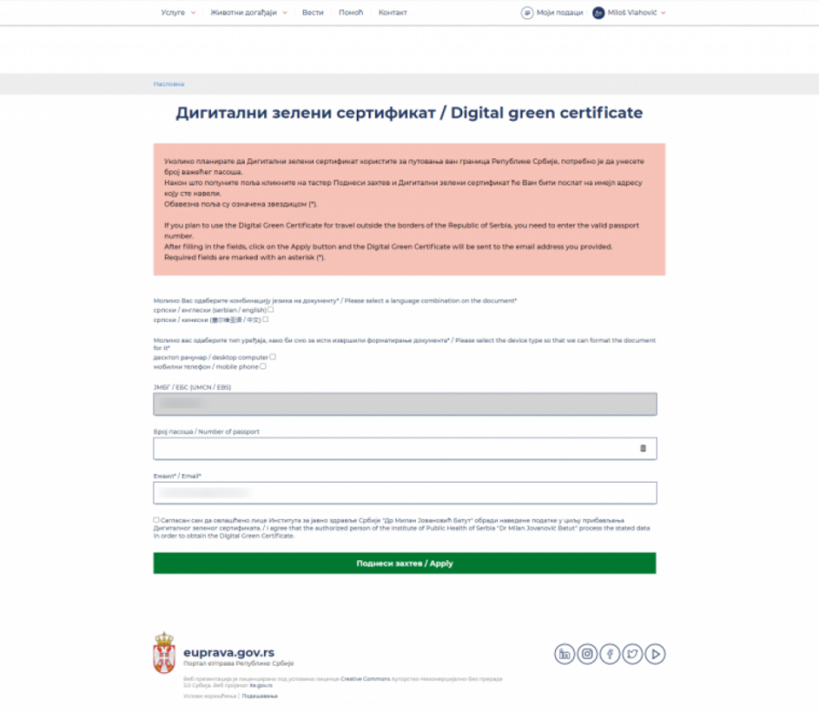 Da bi se dobio digitalni zeleni sertifikat potrebno je da građani budu registrovani na Portalu eUprava.