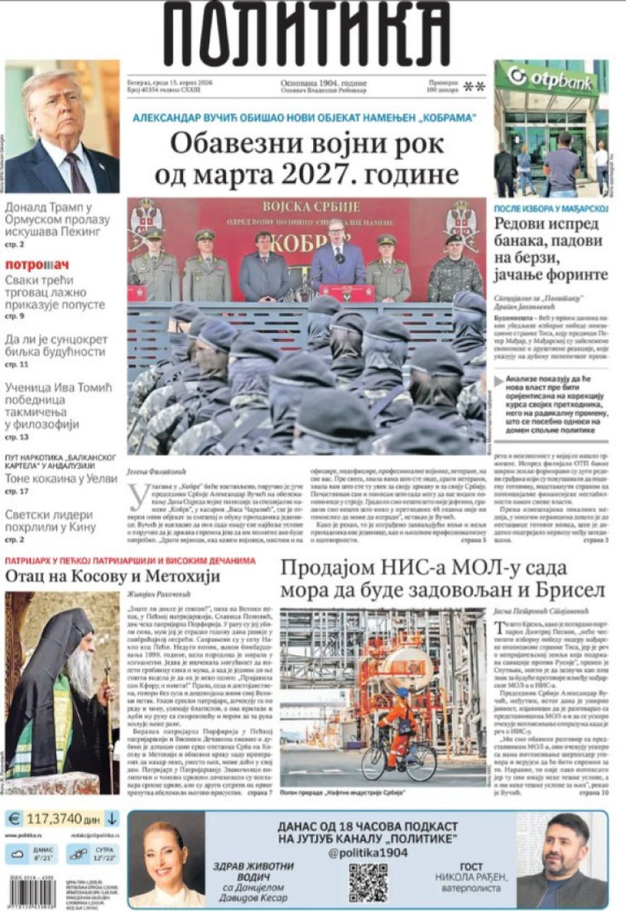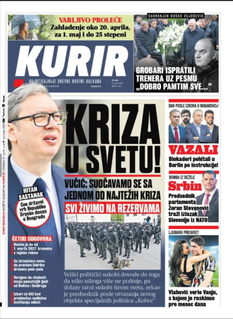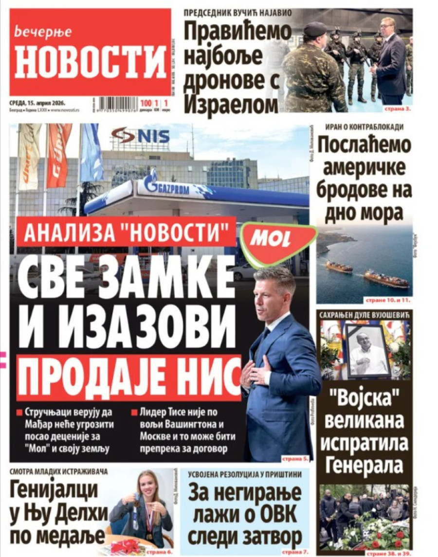 Dnevne novine u Srbiji za sredu, 15. april 2026. godine, na naslovnim stranama najavljuju brojne aktuelne društveno-političke teme.