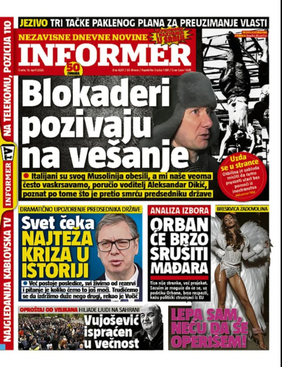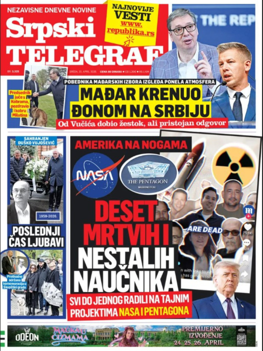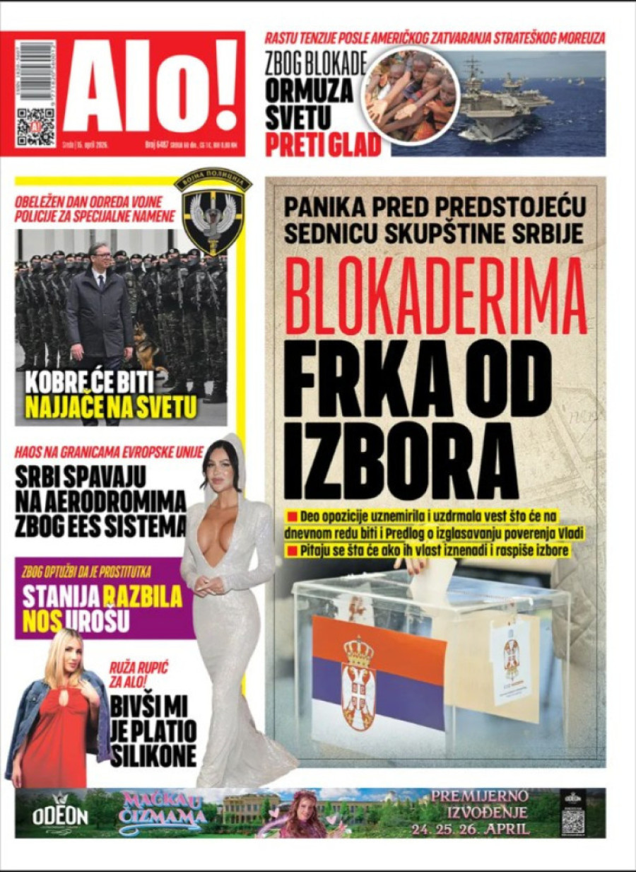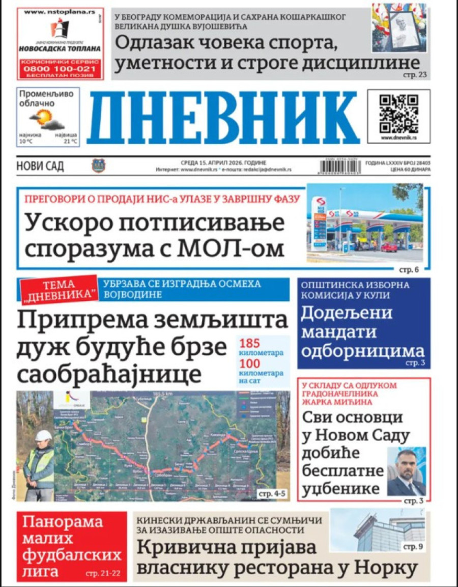 Dnevne novine u Srbiji za sredu, 15. april 2026. godine, na naslovnim stranama najavljuju brojne aktuelne društveno-političke teme.