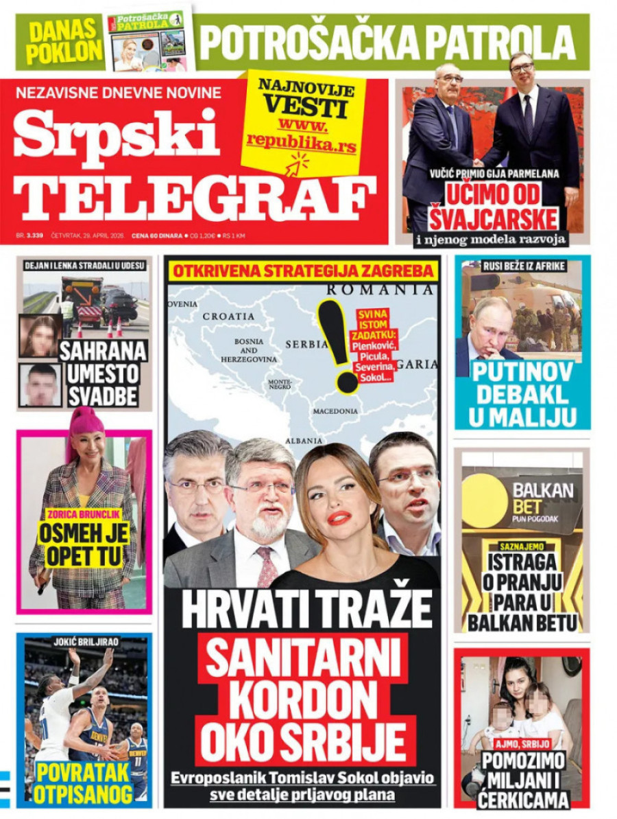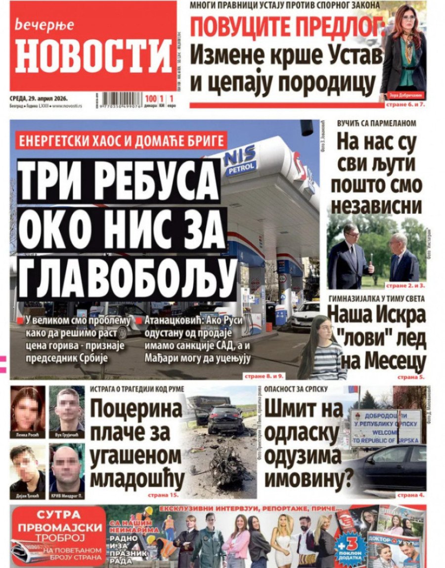 Dnevne novine u Srbiji za sredu, 29. april 2026. godine, na naslovnim stranama najavljuju brojne aktuelne društveno-političke teme.