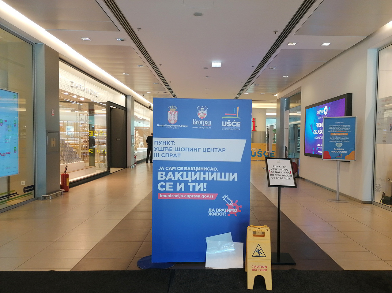 Tržni centar standardno je pun ljudi. Mimoilaze se u prizemlju, na prvom i drugom spratu. Već na trećem ih je malo manje. Zaviruju u radnje, kupuju i odlaze. Samo 13 njih poplelo se do vakcinalnog punkta. I mi, zajedno sa njima. Sve je uredno i čisto. Strogo se vodi računa o epidemiološkim merama. Unutra se ulazi tako što zdravstveni radnik svakom posetiocu isprska ruke alkoholom.